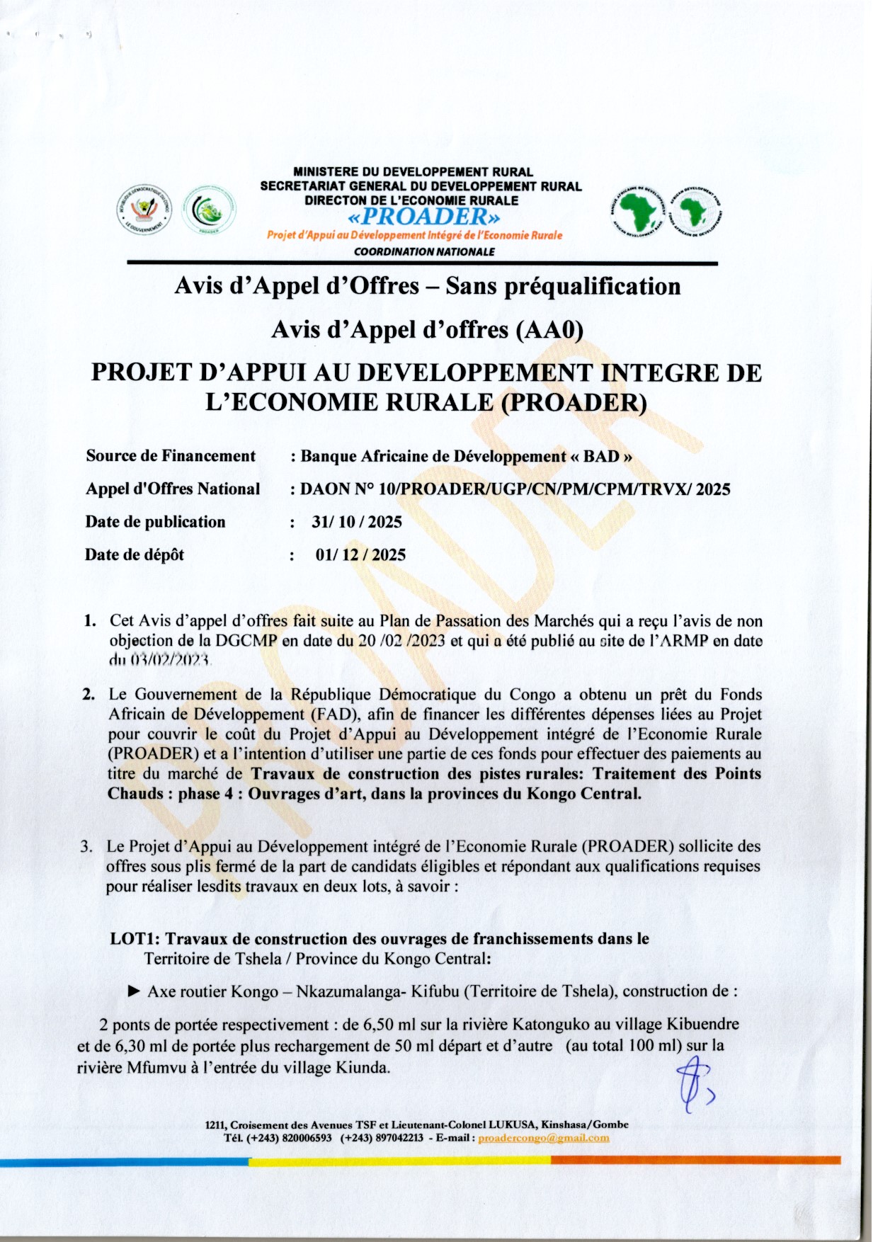 Travaux de construction des pistes rurales : Traitement des points Chauds : phase 4 : Ouvrages d’art, dans la provinces du Kongo Central