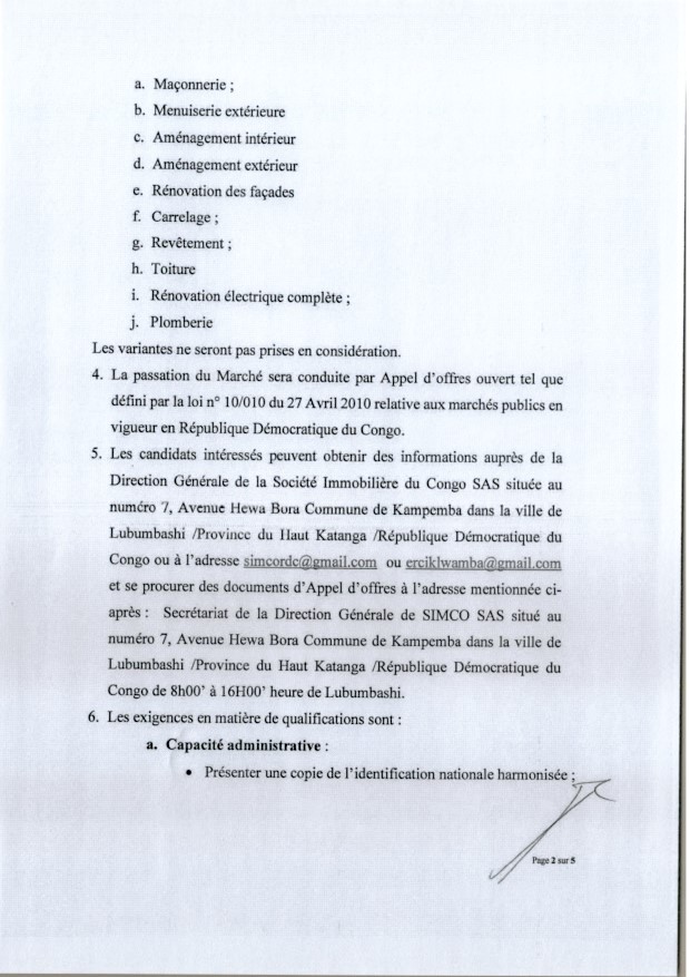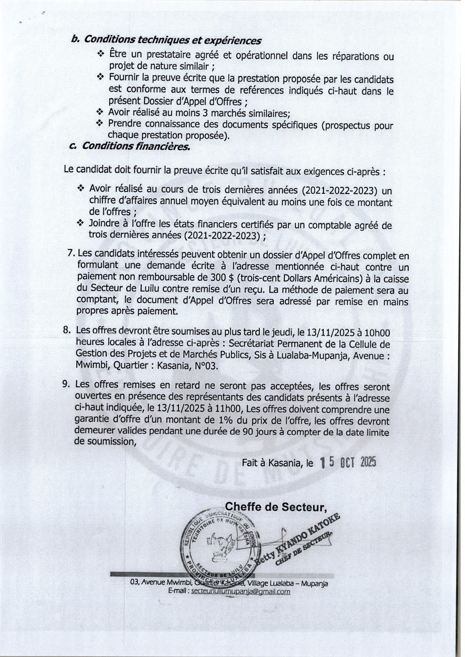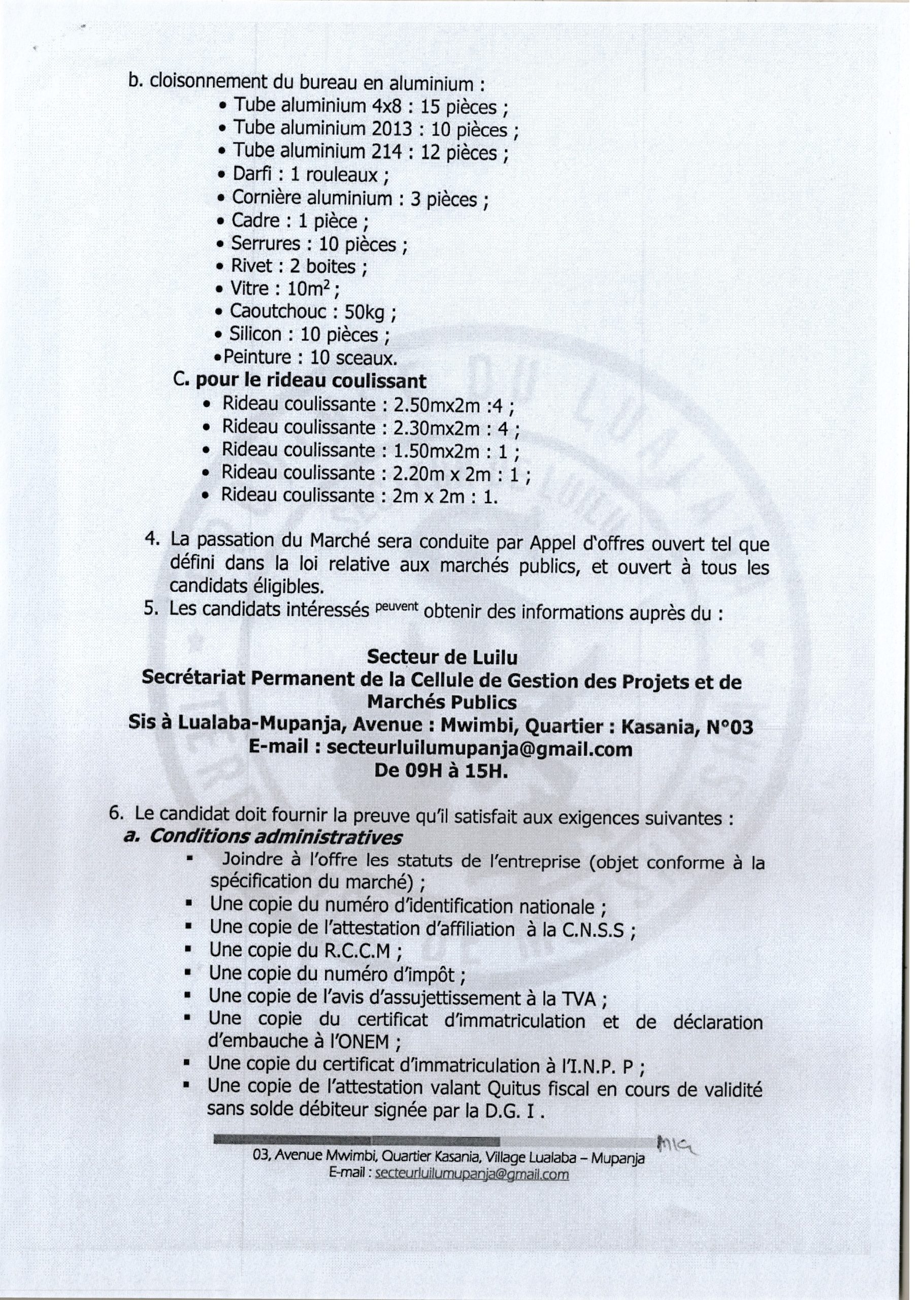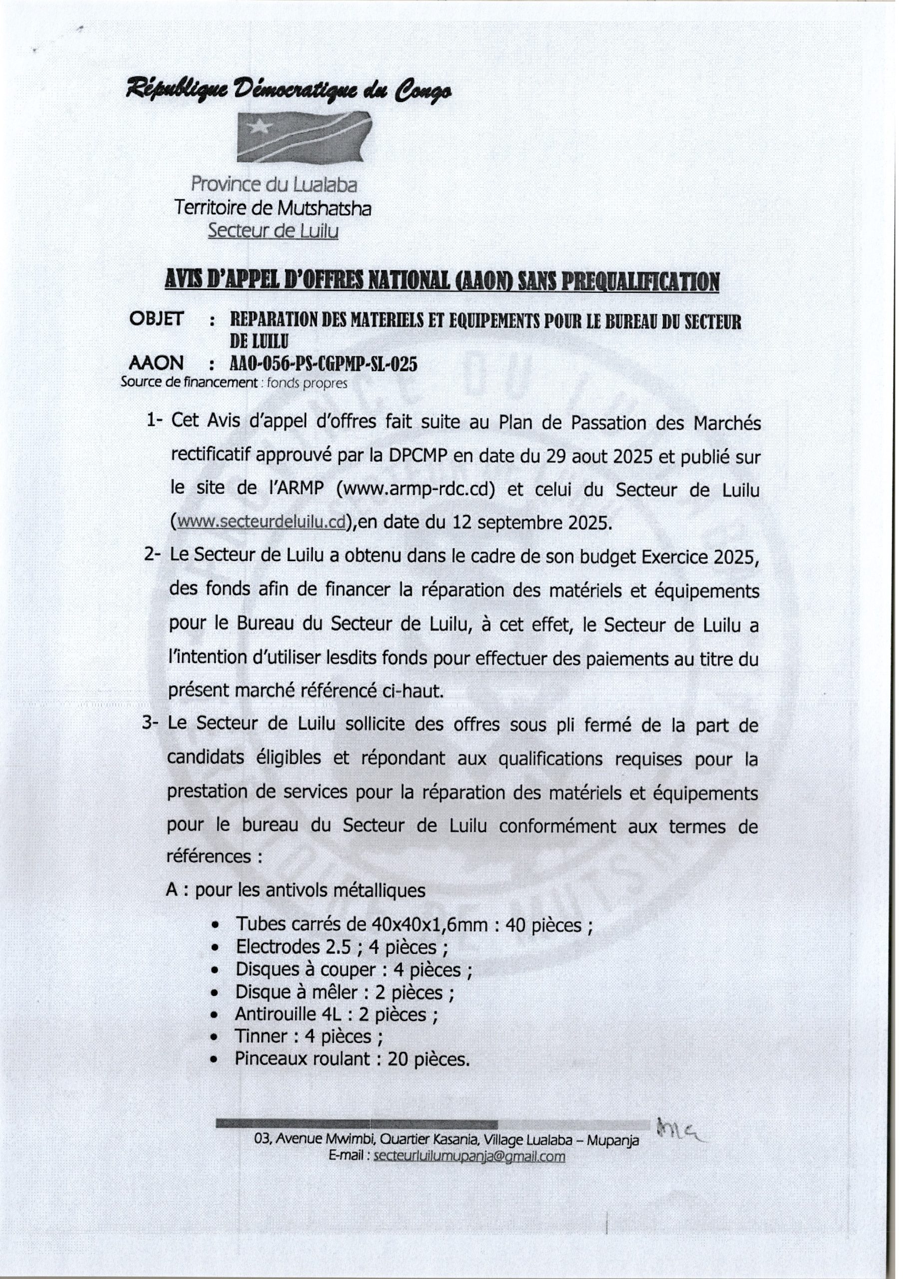 Réparation des matériels et équipements pour le bureau de secteur de LUILU.