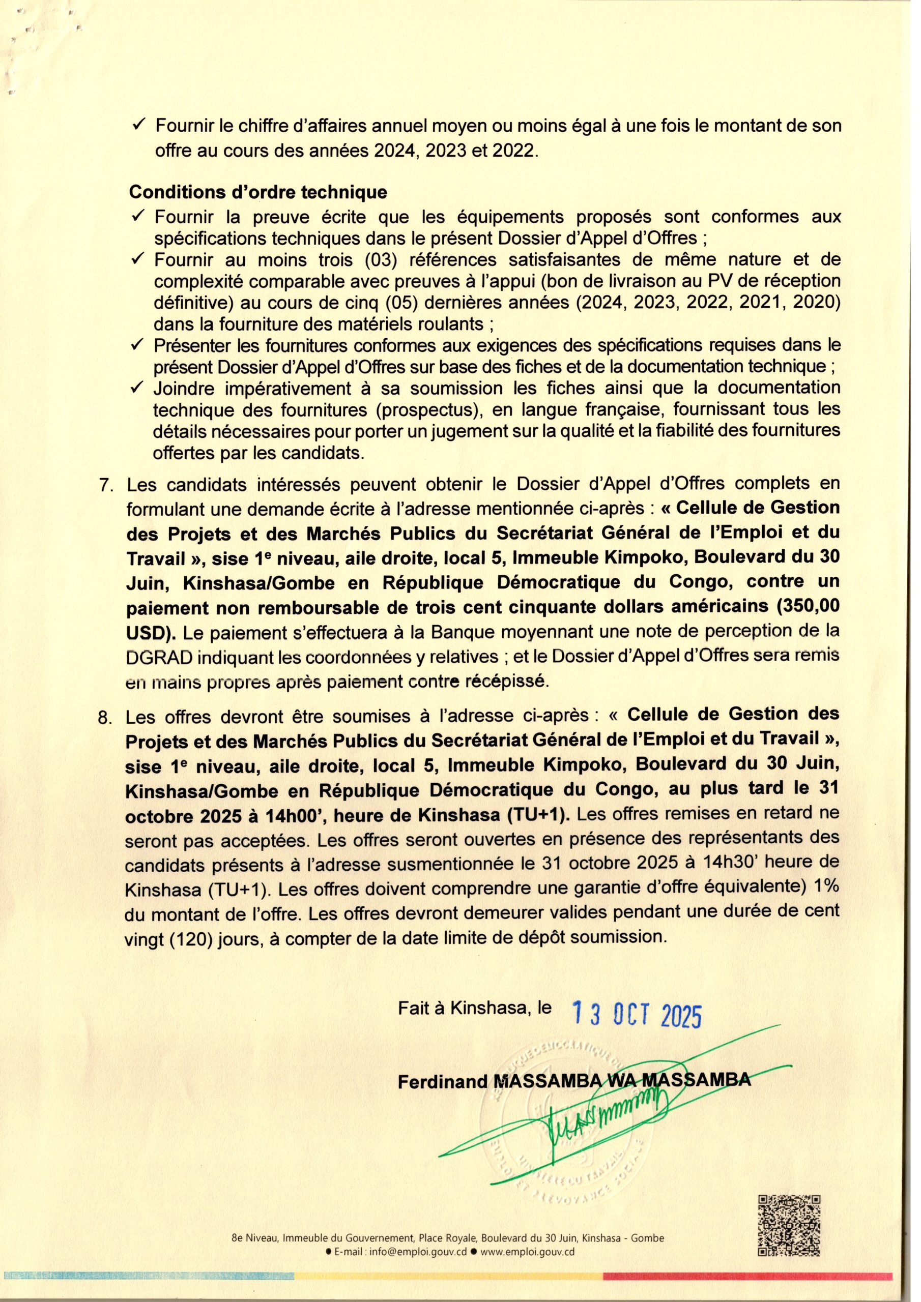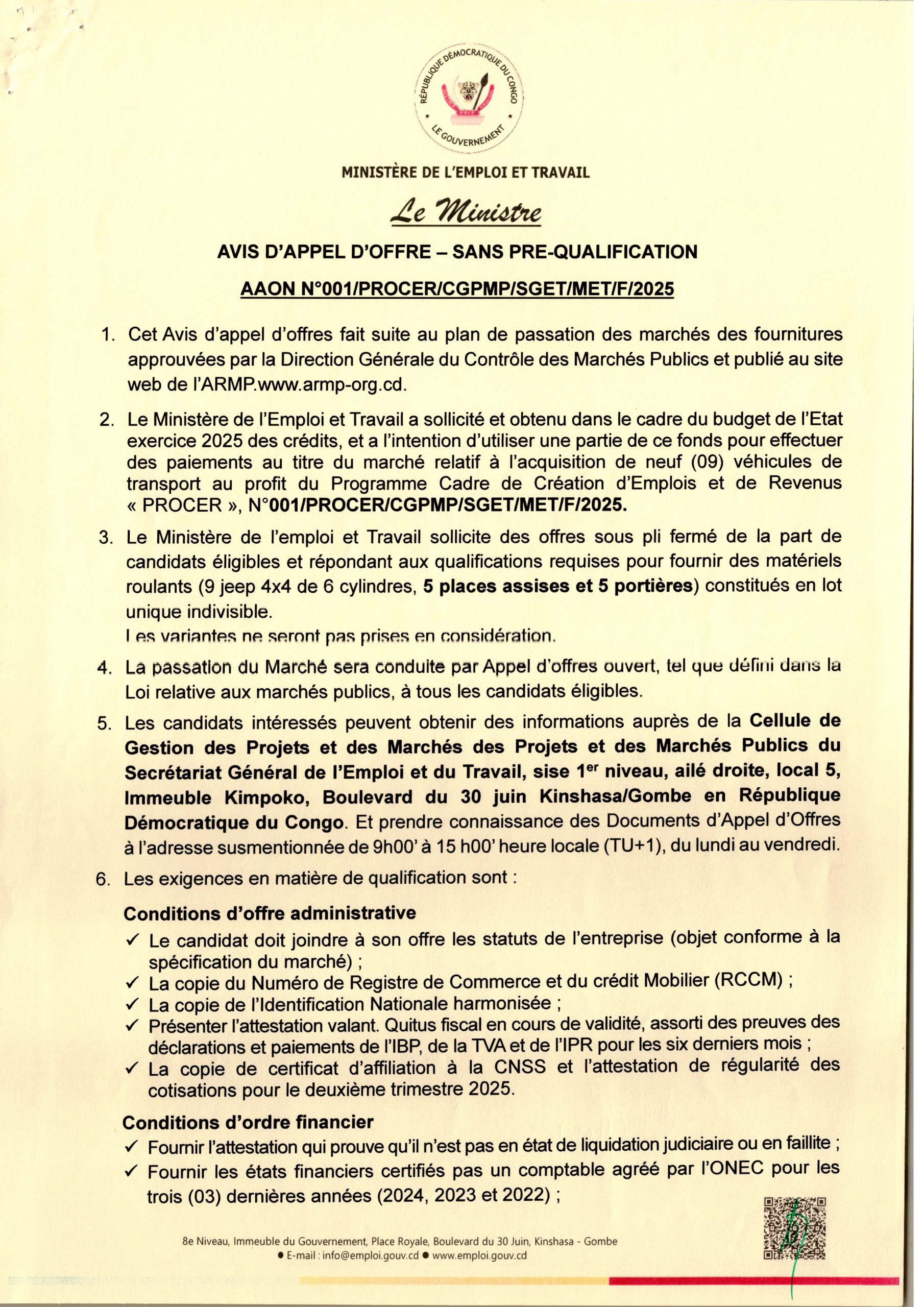 Acquisition de neuf (09) véhicules de transport au profit du Programme cadre de Création d’Emplois et de Revenus “PROCER”.
