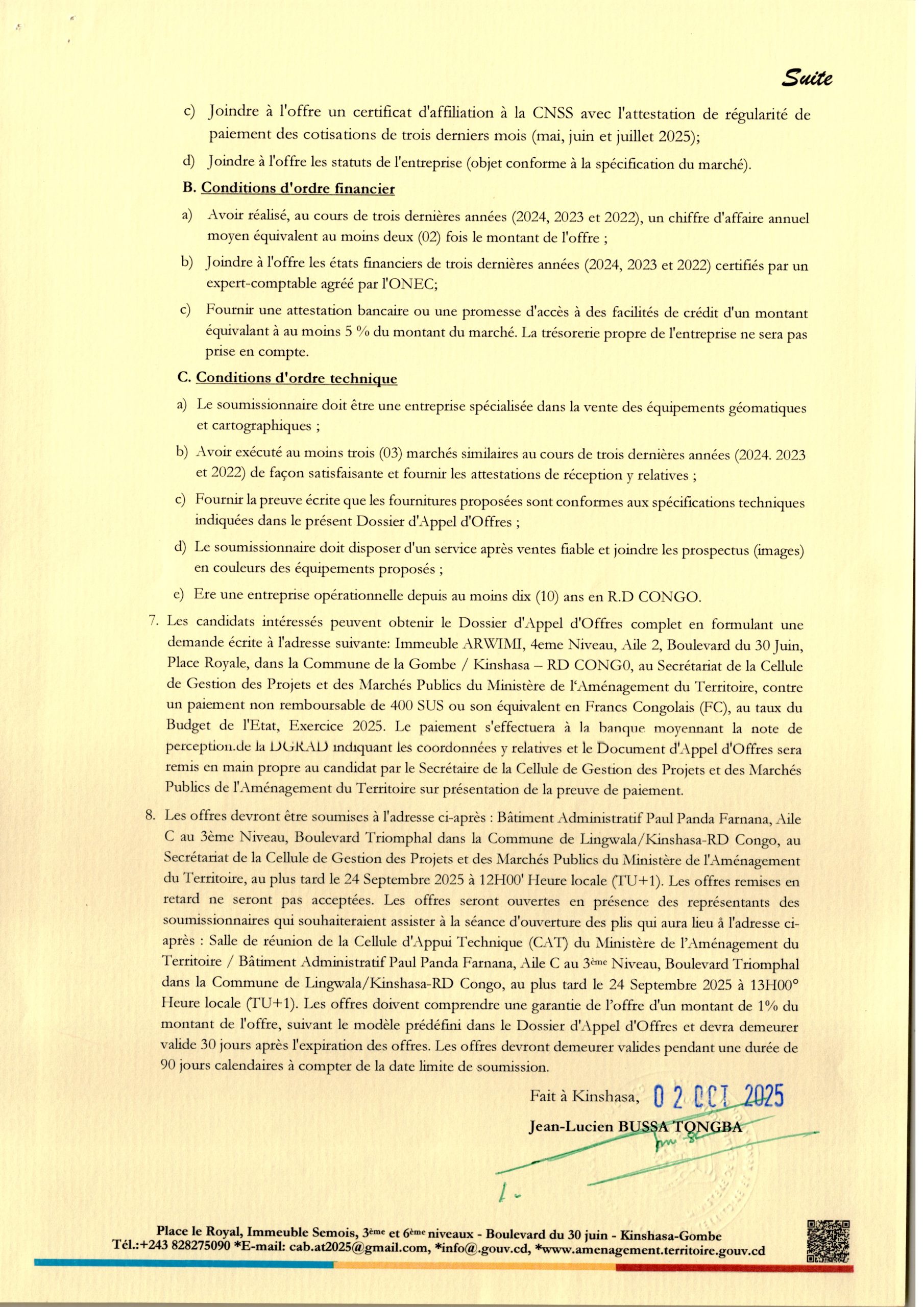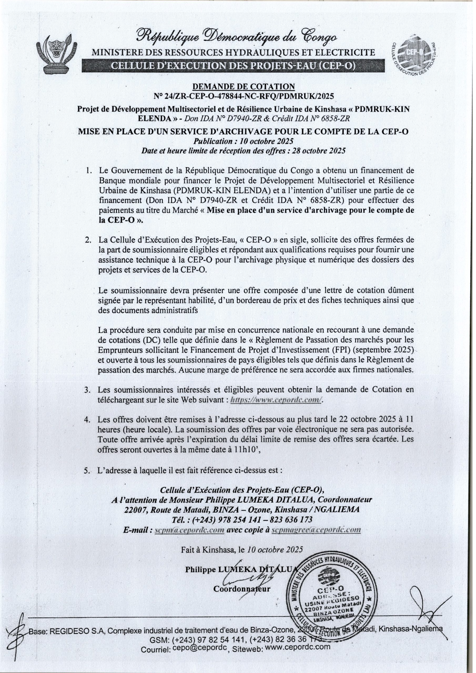 Demande de Cotation du Ministère des Ressources hydrauliques et Electricité n°24/ZR-CEP-O-478844-NC-RFQ/PDMRUK/2025
