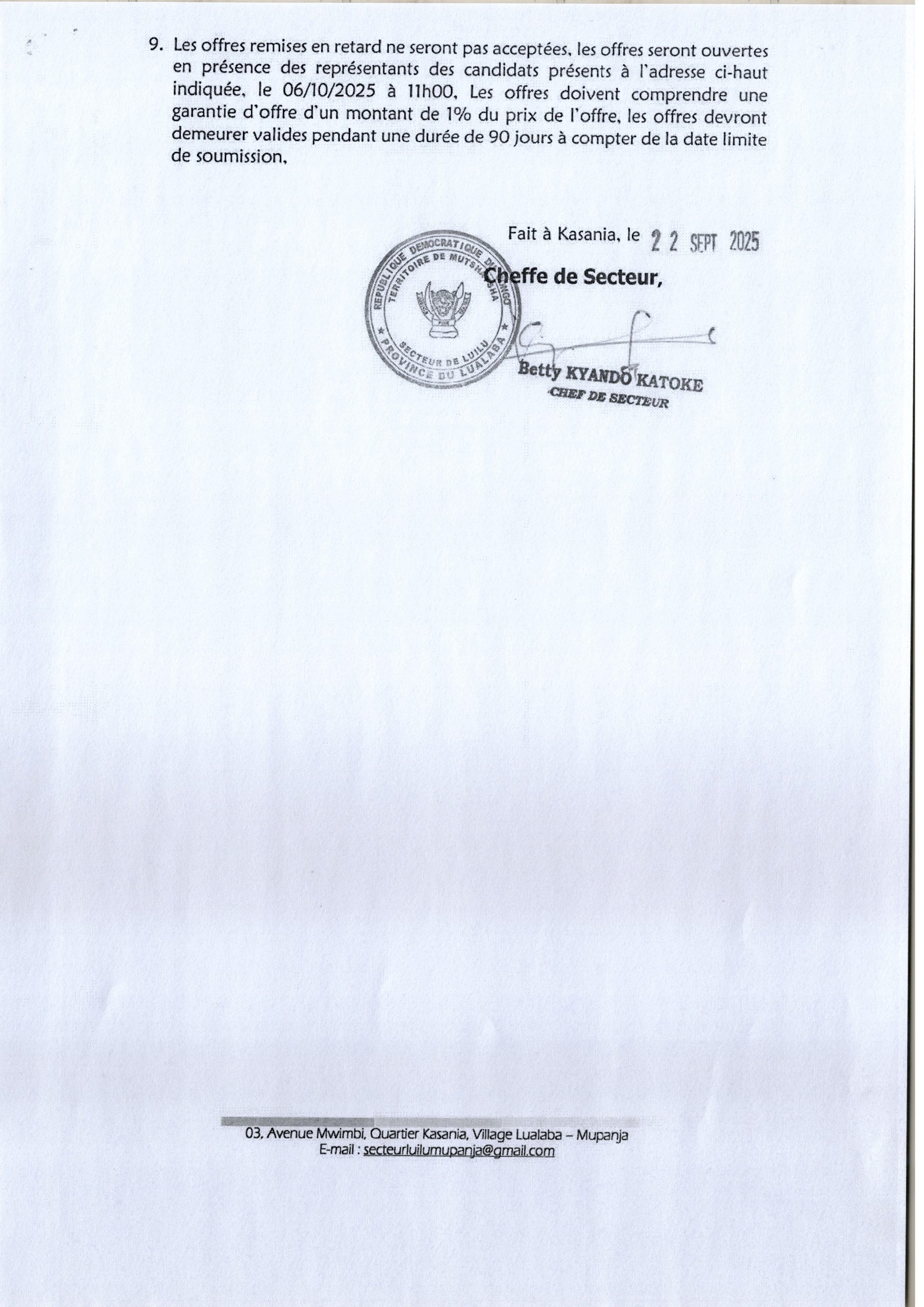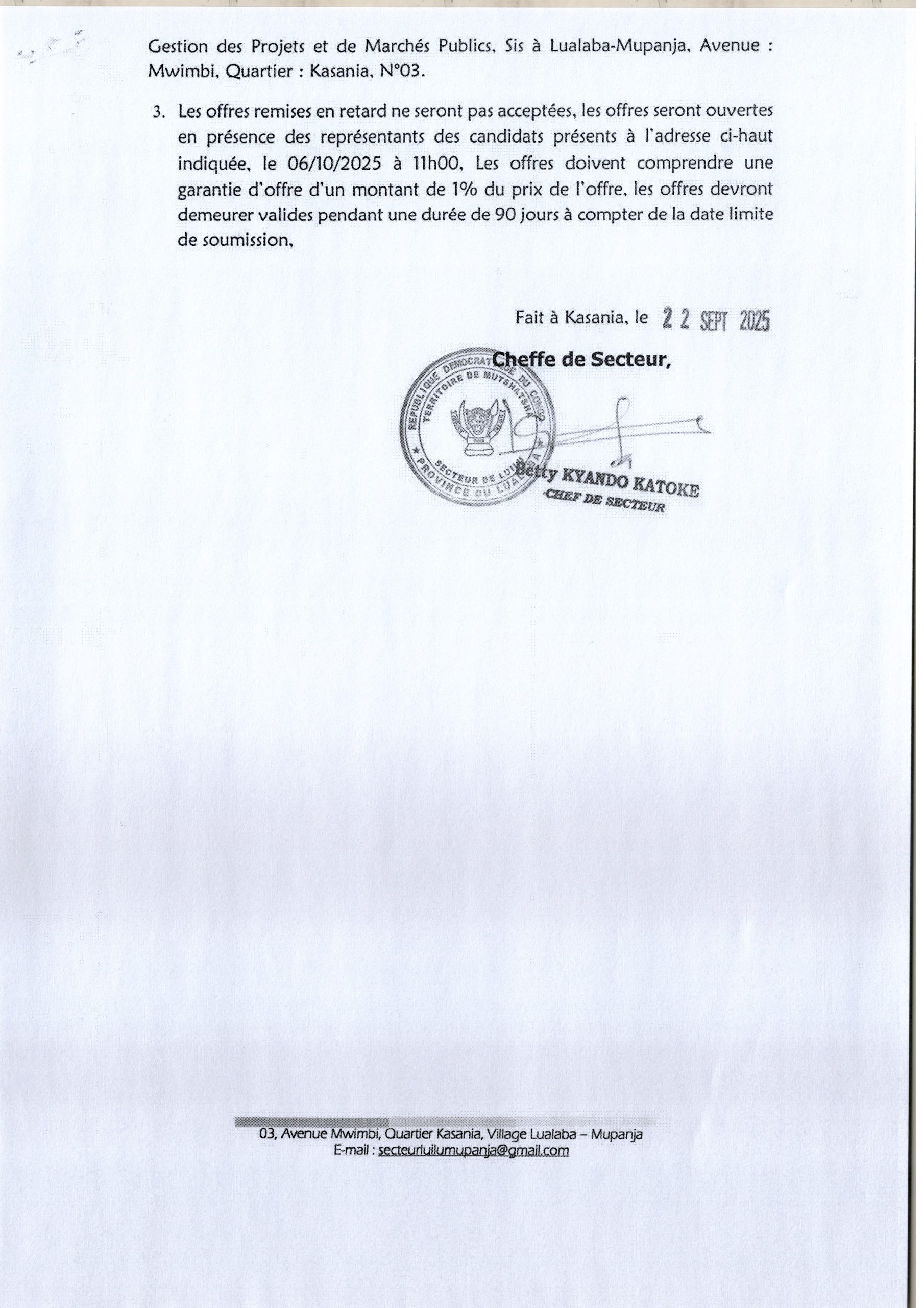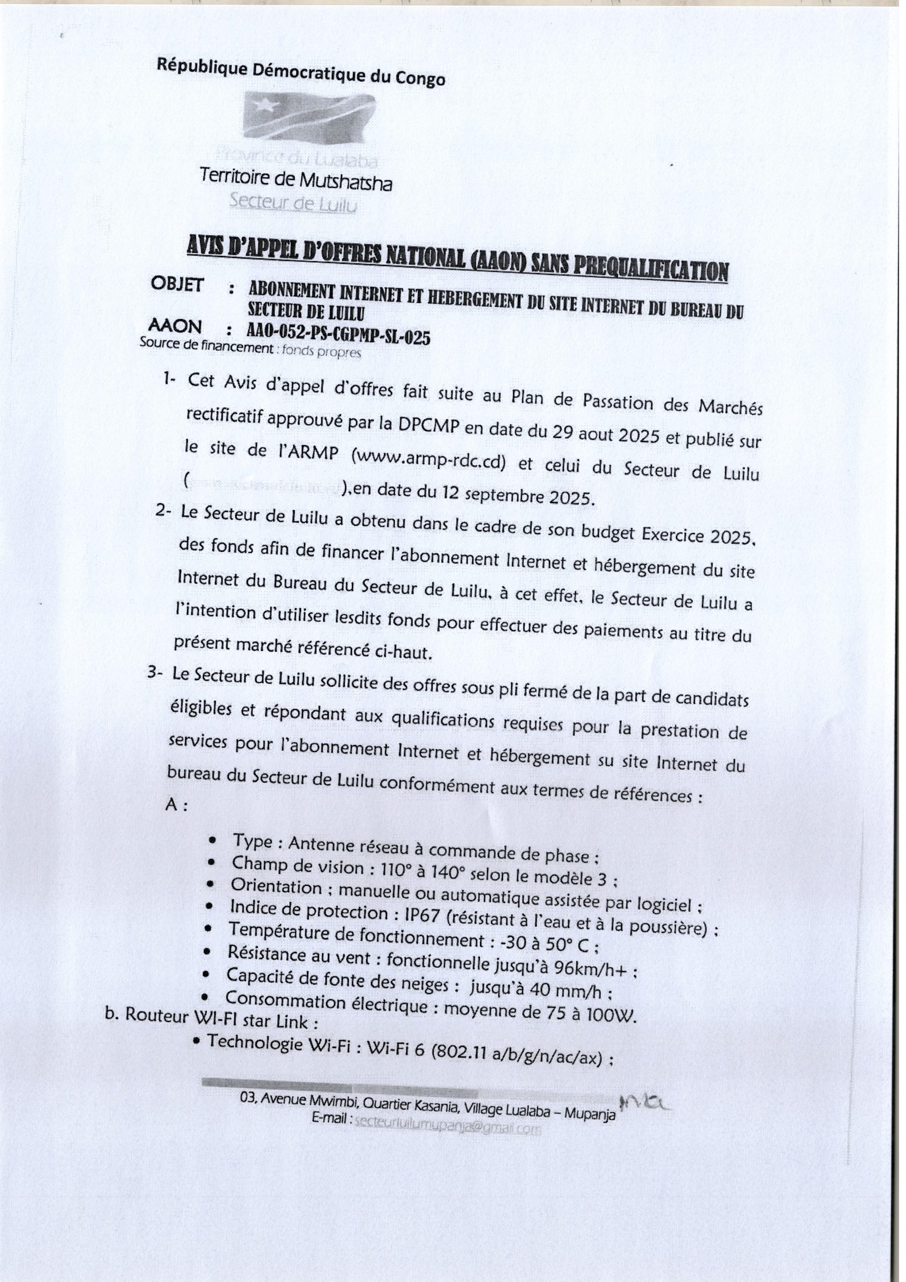 Abonnement Internet et hébergement du Site du bureau Secteur de Luilu