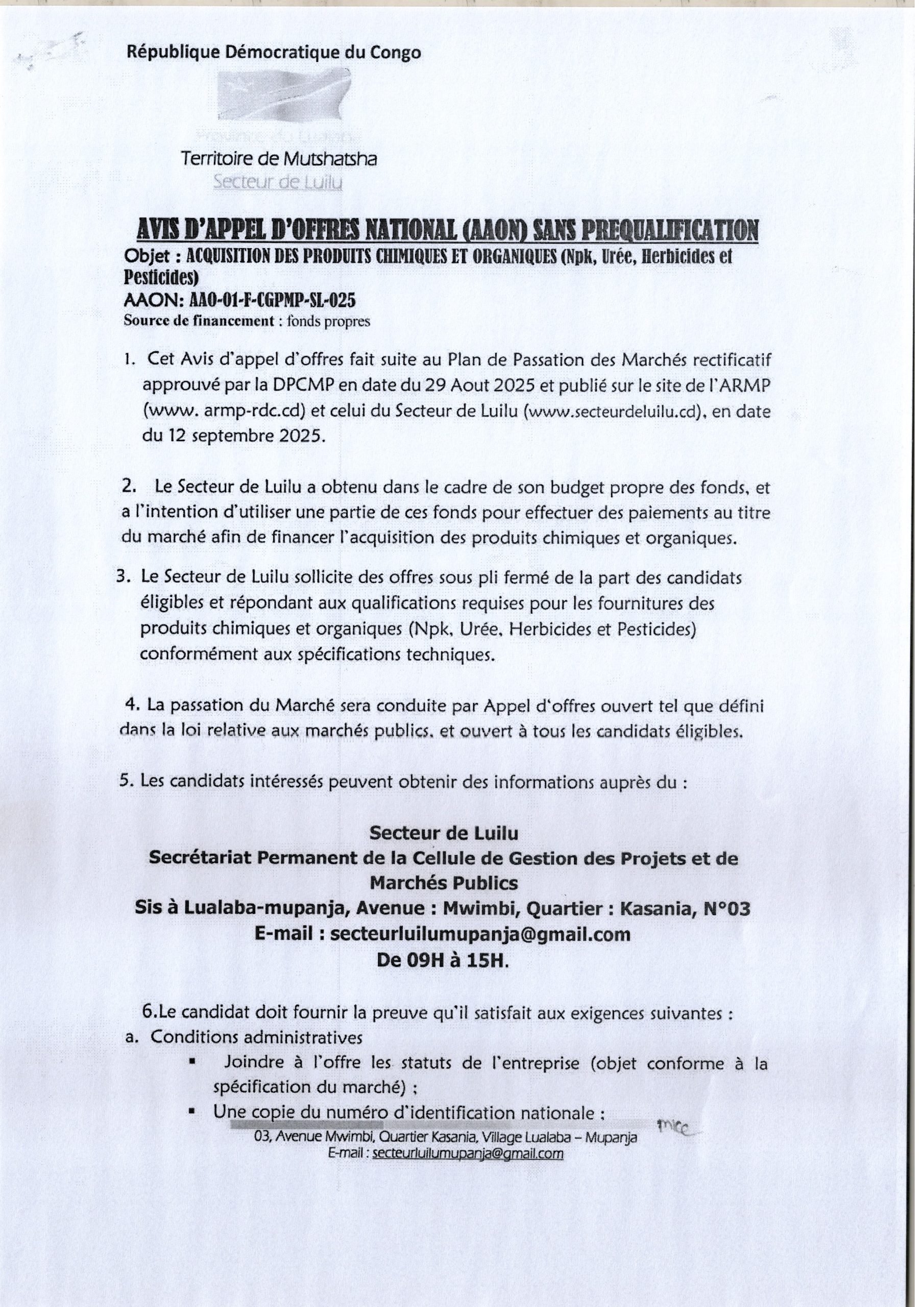 Acquisition des produits chimiques et organiques (Npk, Urée, Herbicides et Pesticides)