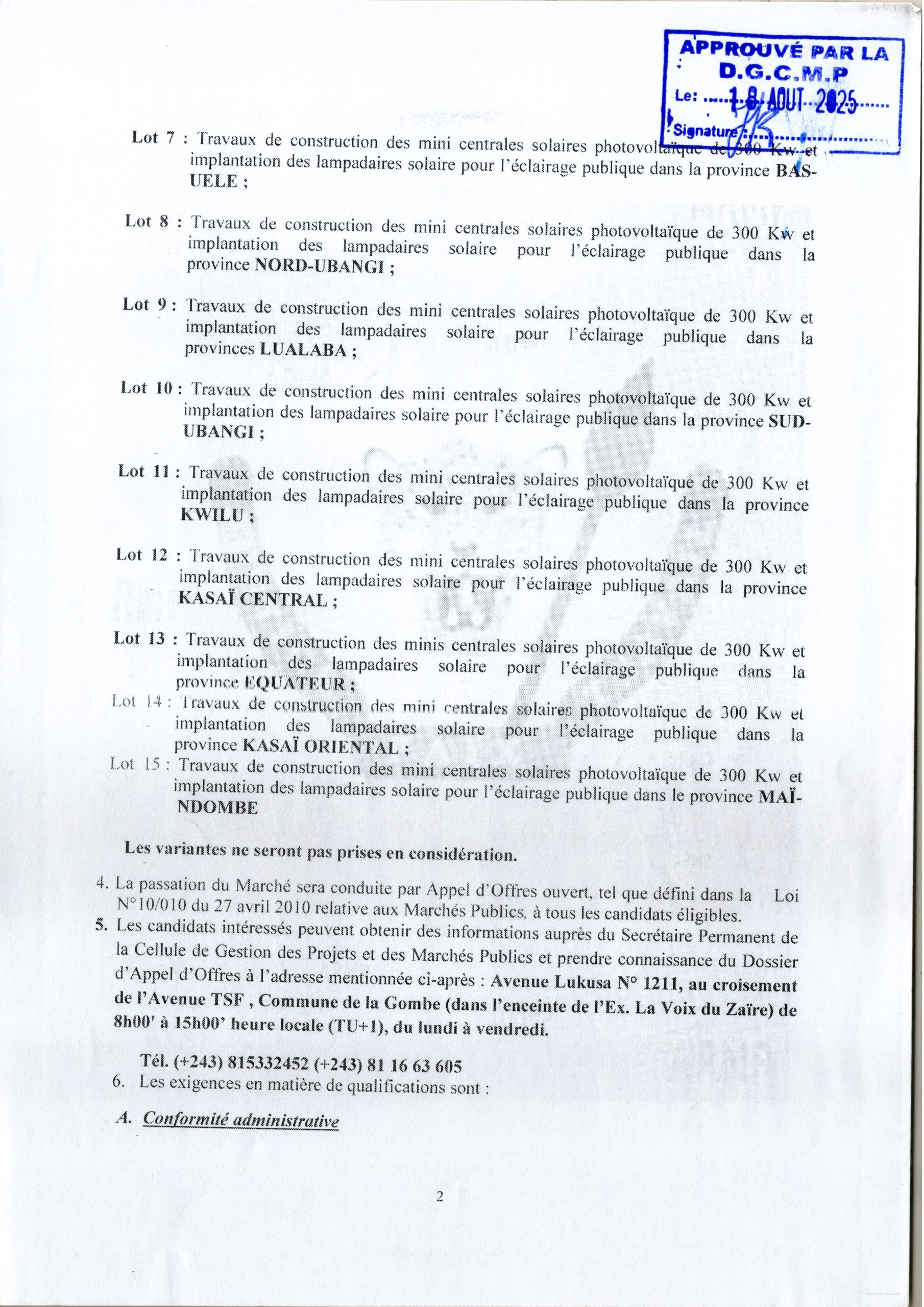 Travaux de construction des mini centrales solaires photovoltaïque de 300 Kw et implantation des lampadaires solaire pour l’éclairage publique dans les 15 Provinces