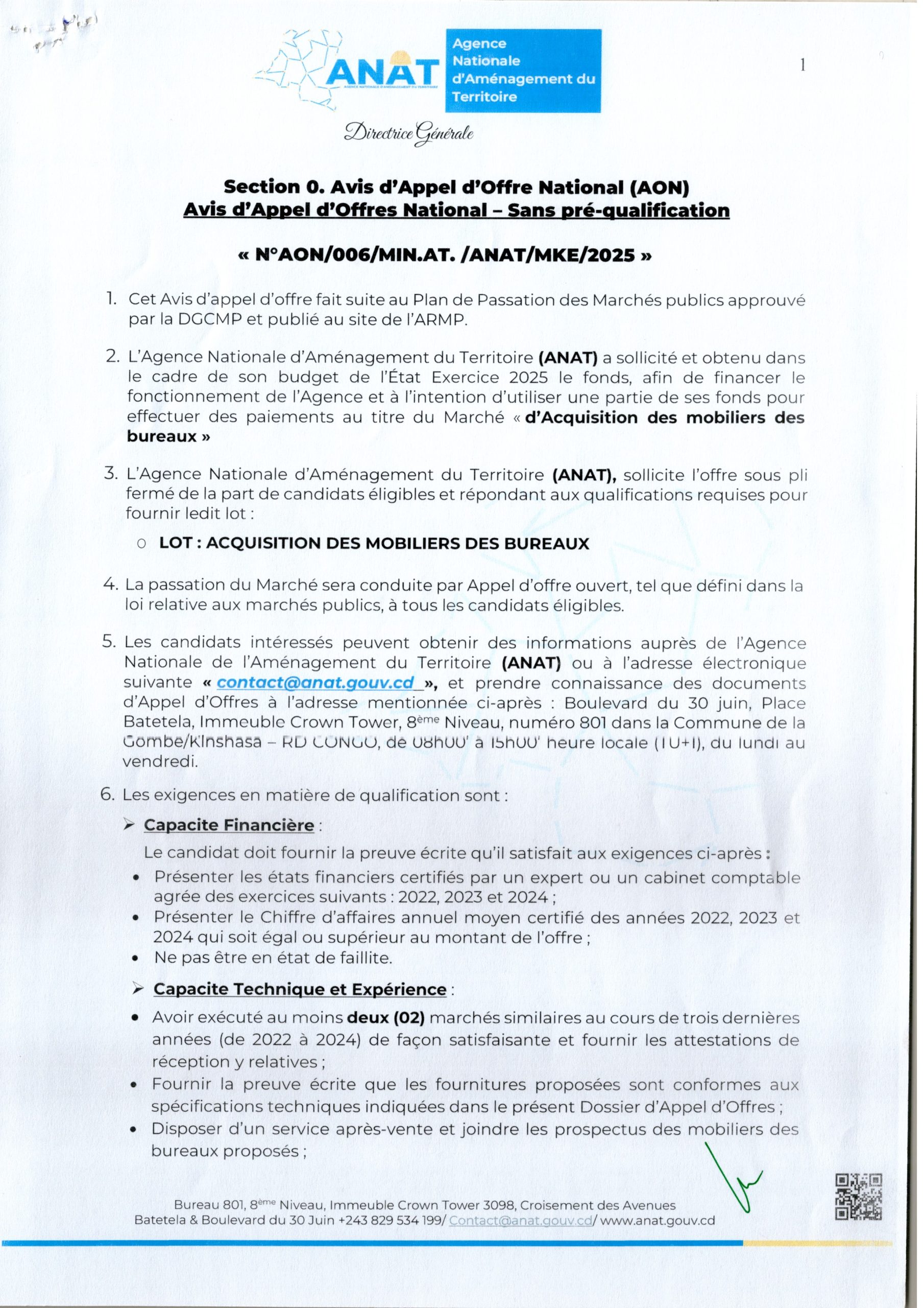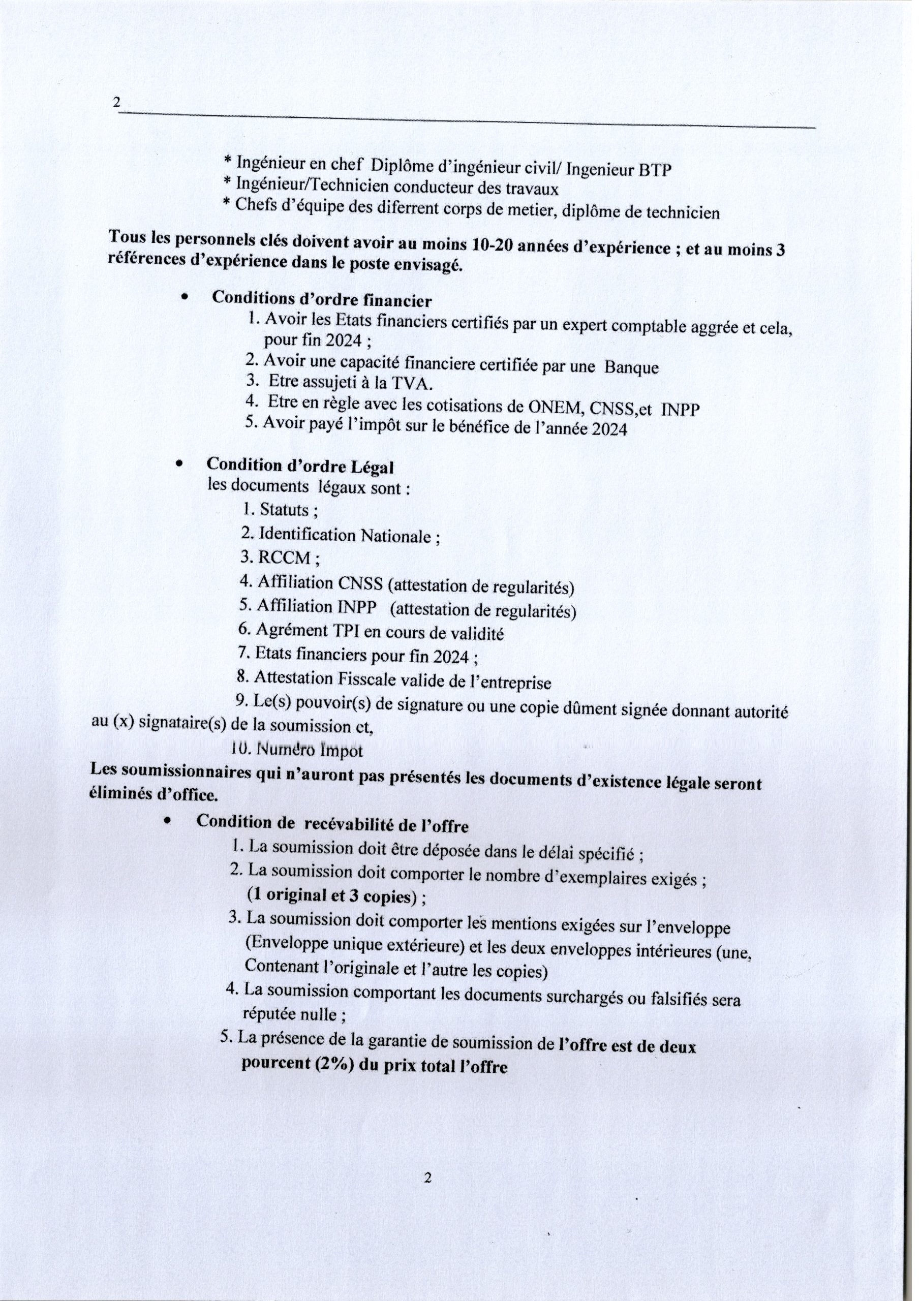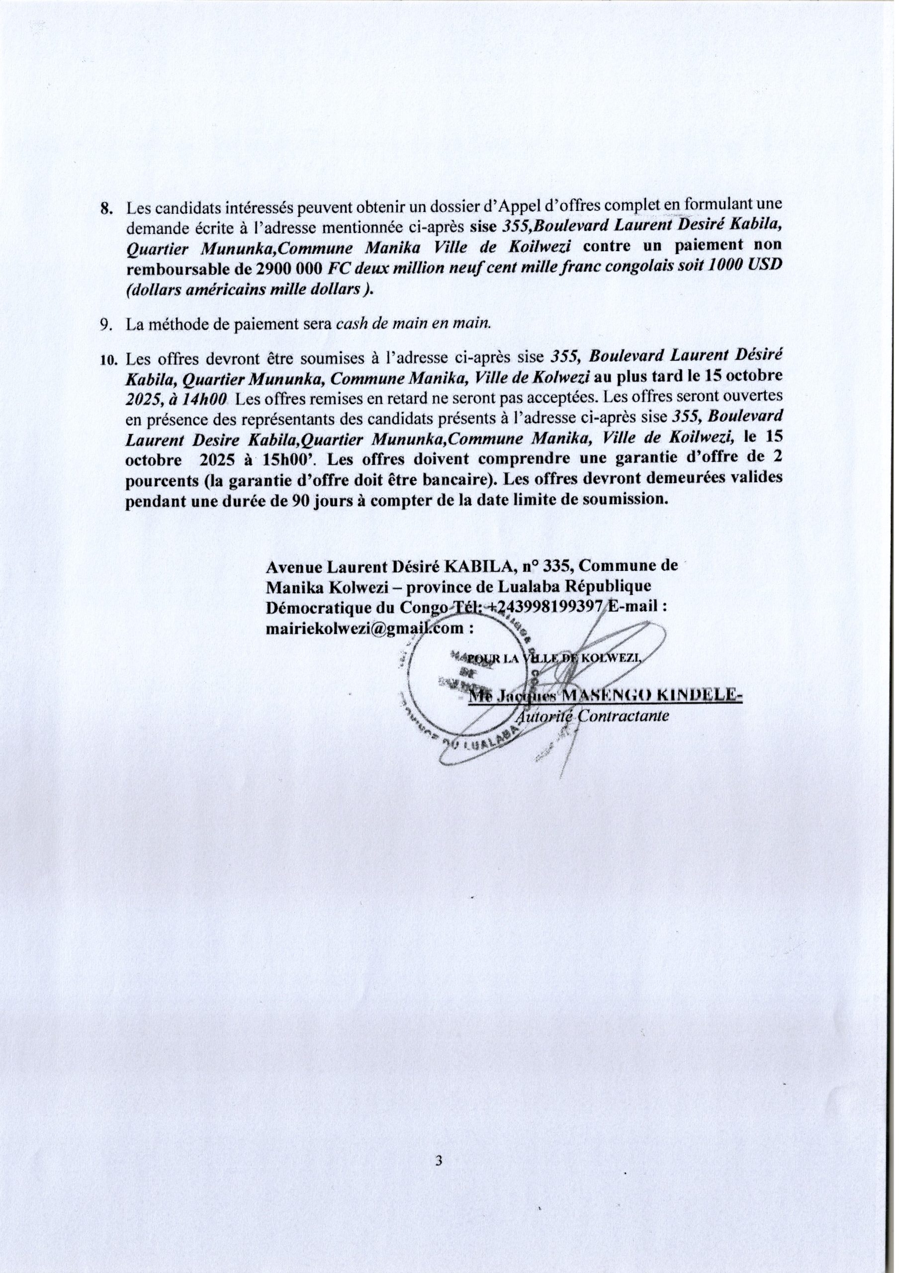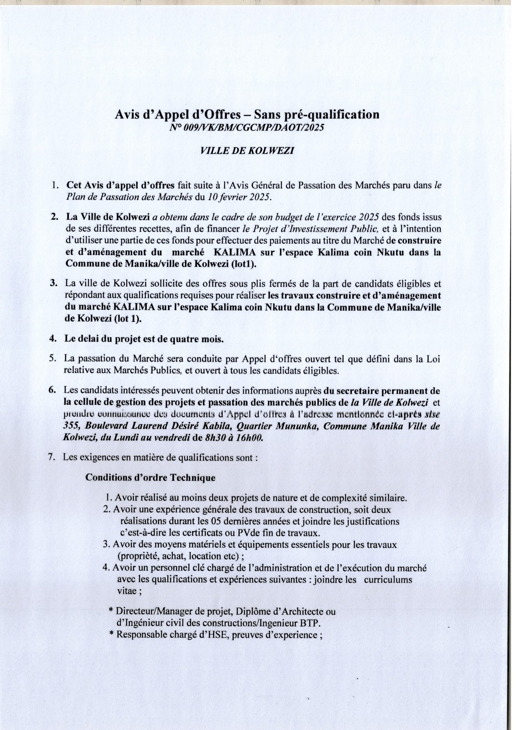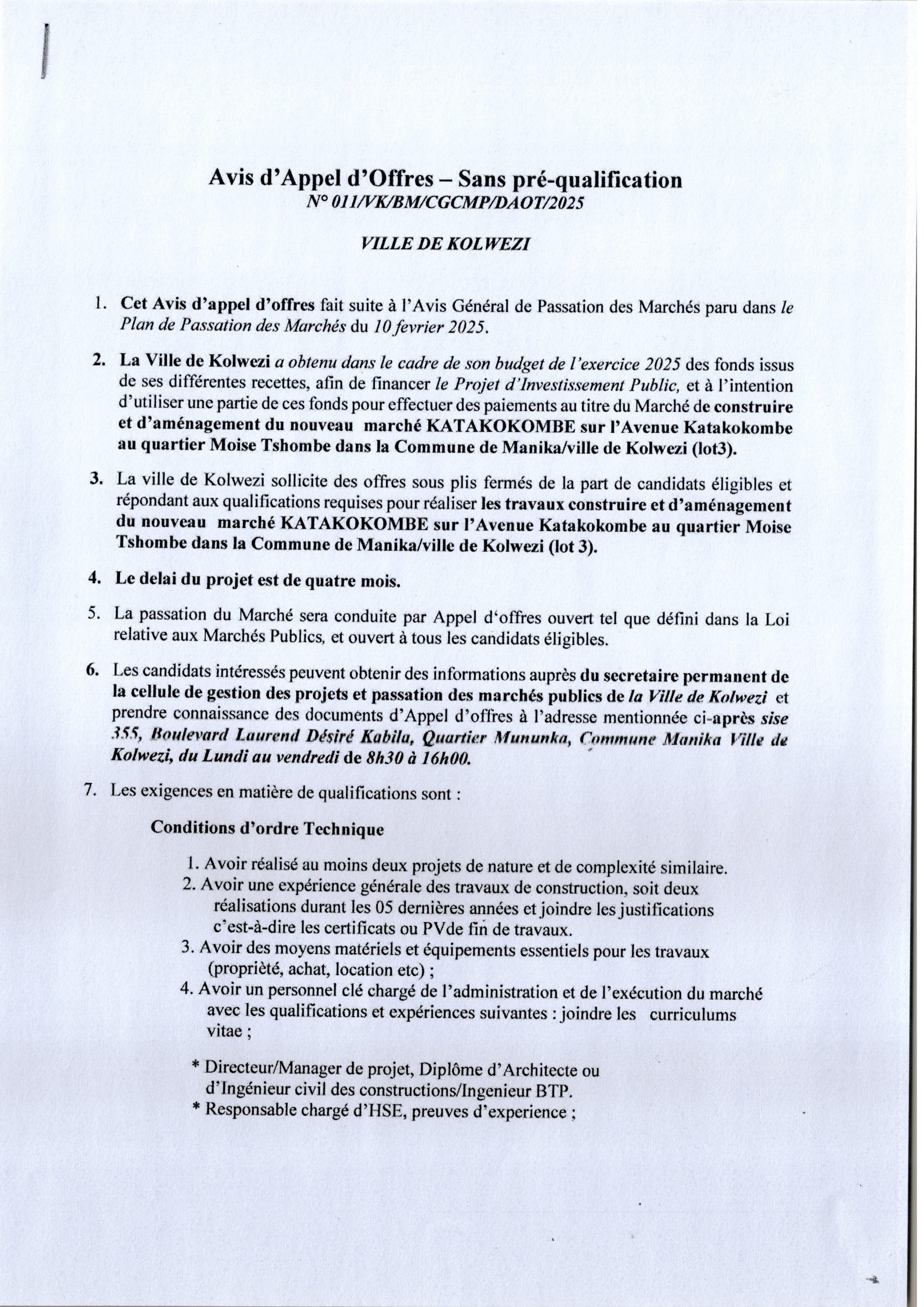 Construction et Aménagement du nouveau marché Diur sur l’avenue de la mission au quartier Moise Tshombe dans la Commune de Manika/ville de Kolwezi (lot 2).