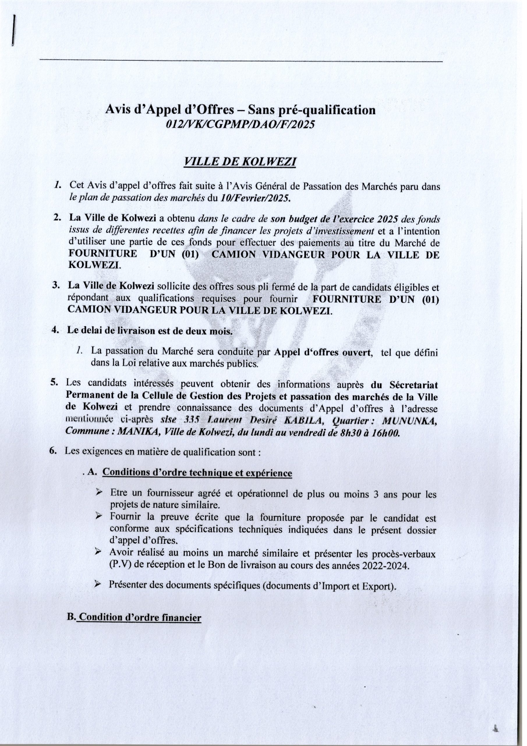 Fourniture d’un (01) Camion Vidangeur pour la Ville de Kolwezi