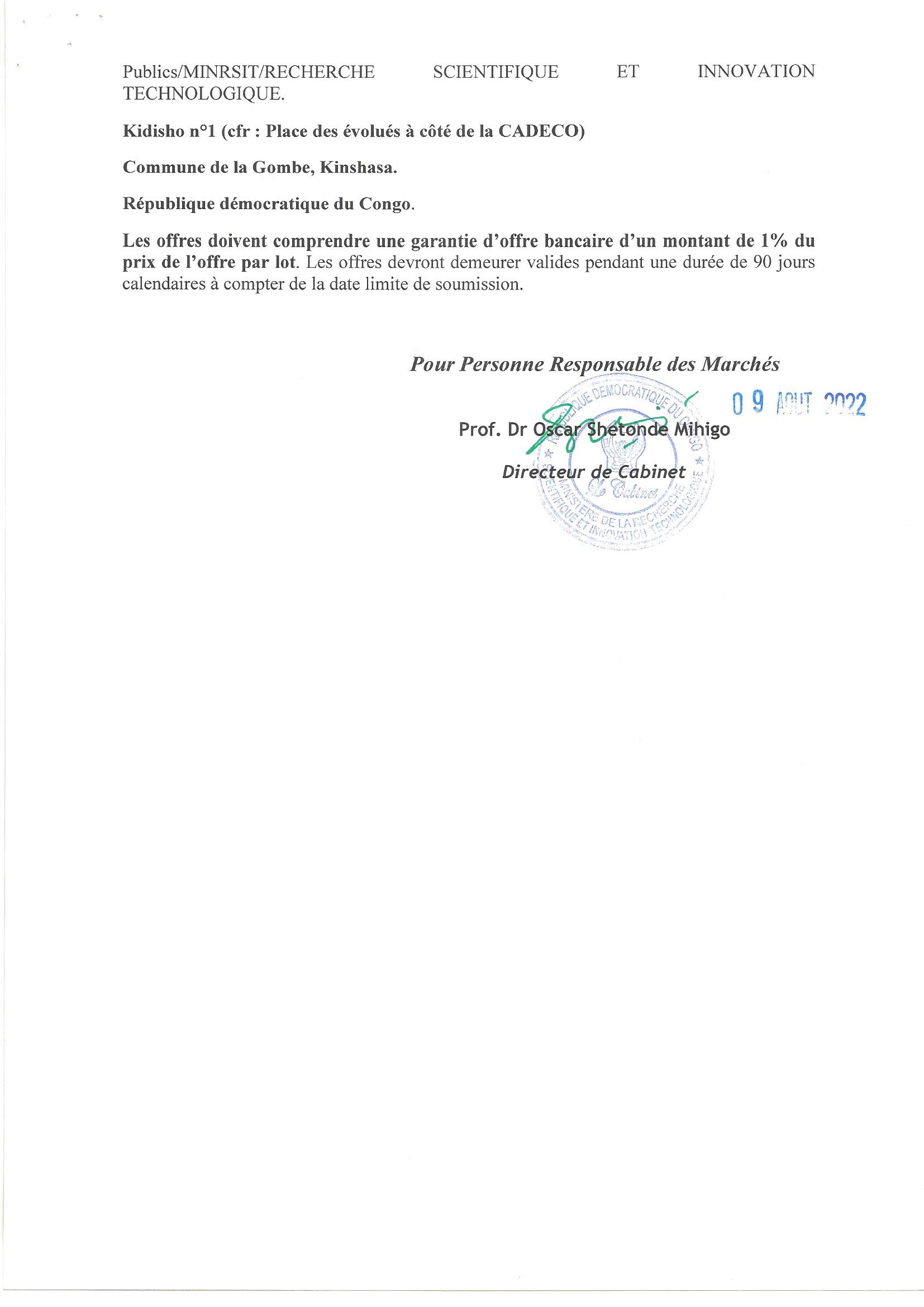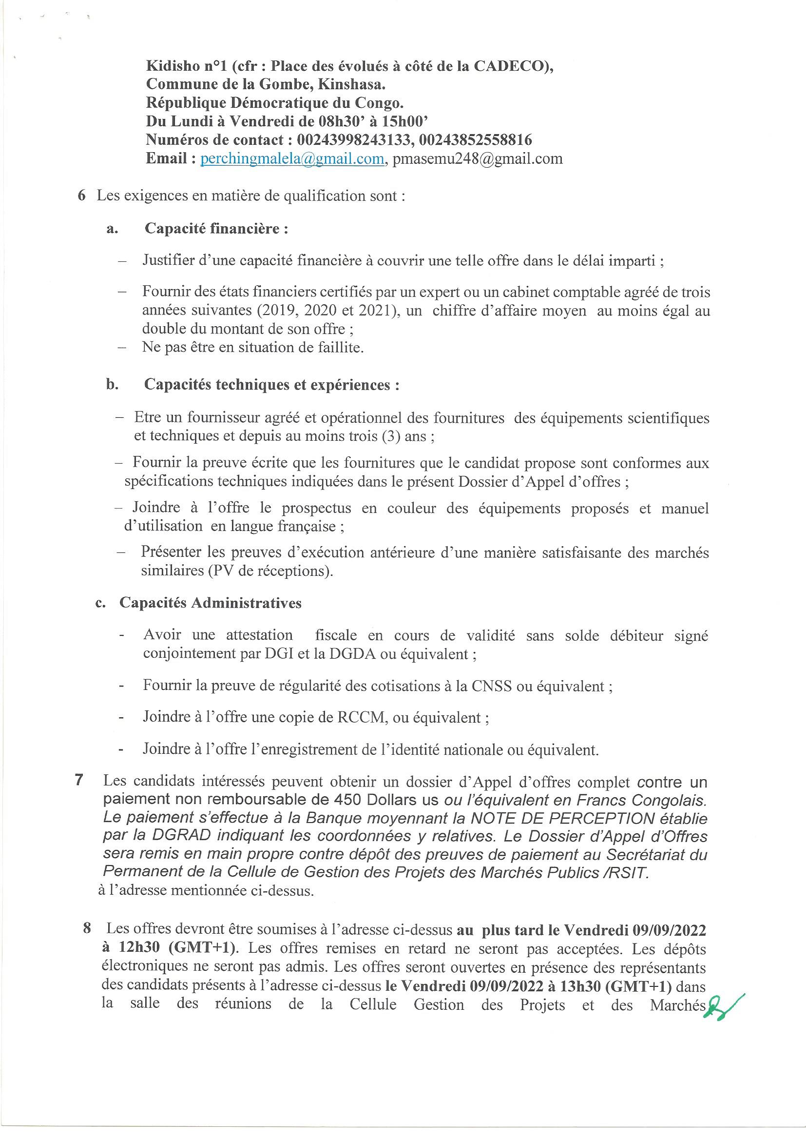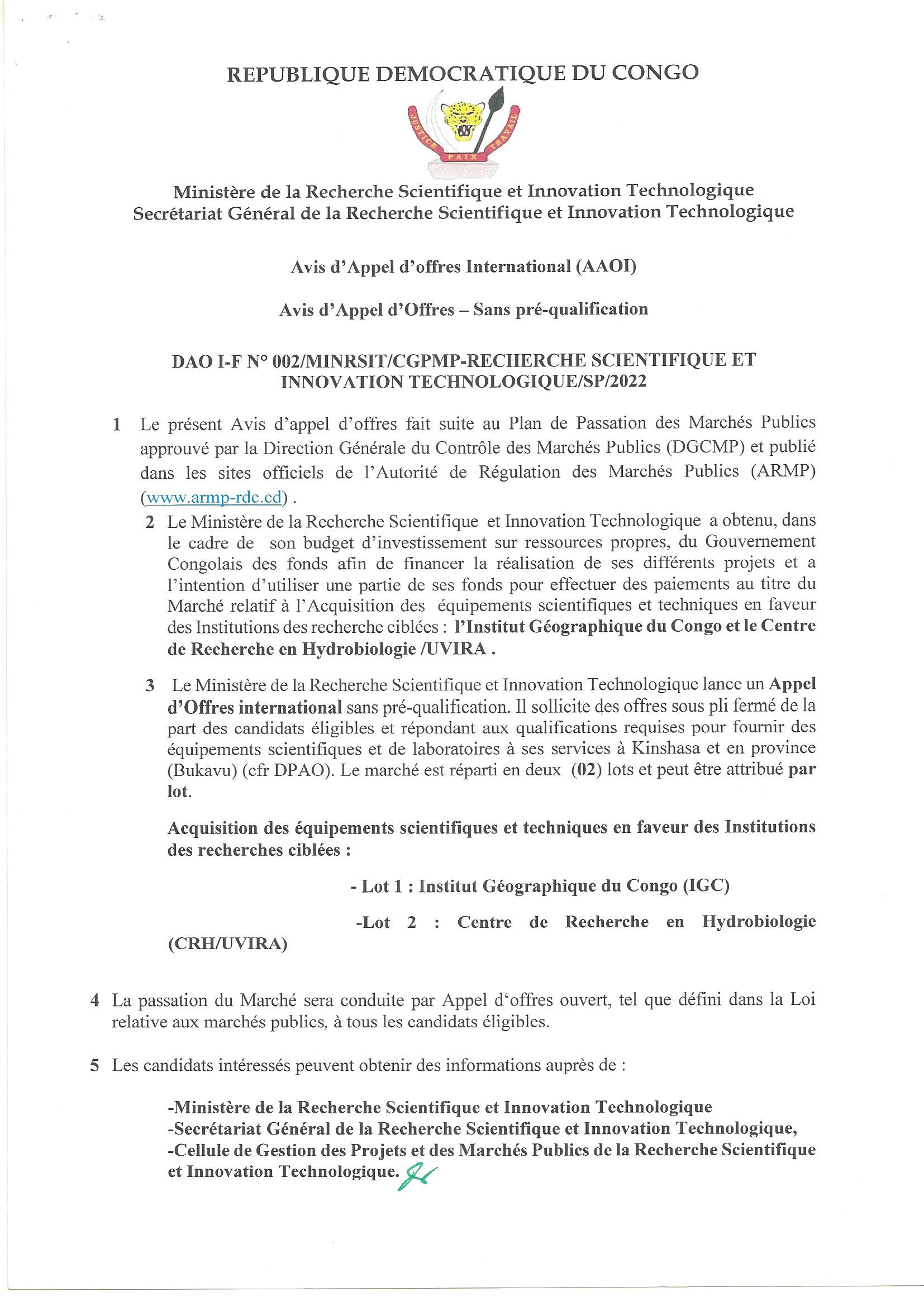 Acquisition des équipements scientifiques et techniques en faveur des institutions des recherches ciblées: l’institut géographique du Congo et le centre de recherche en hydrobiologie/Uvira.