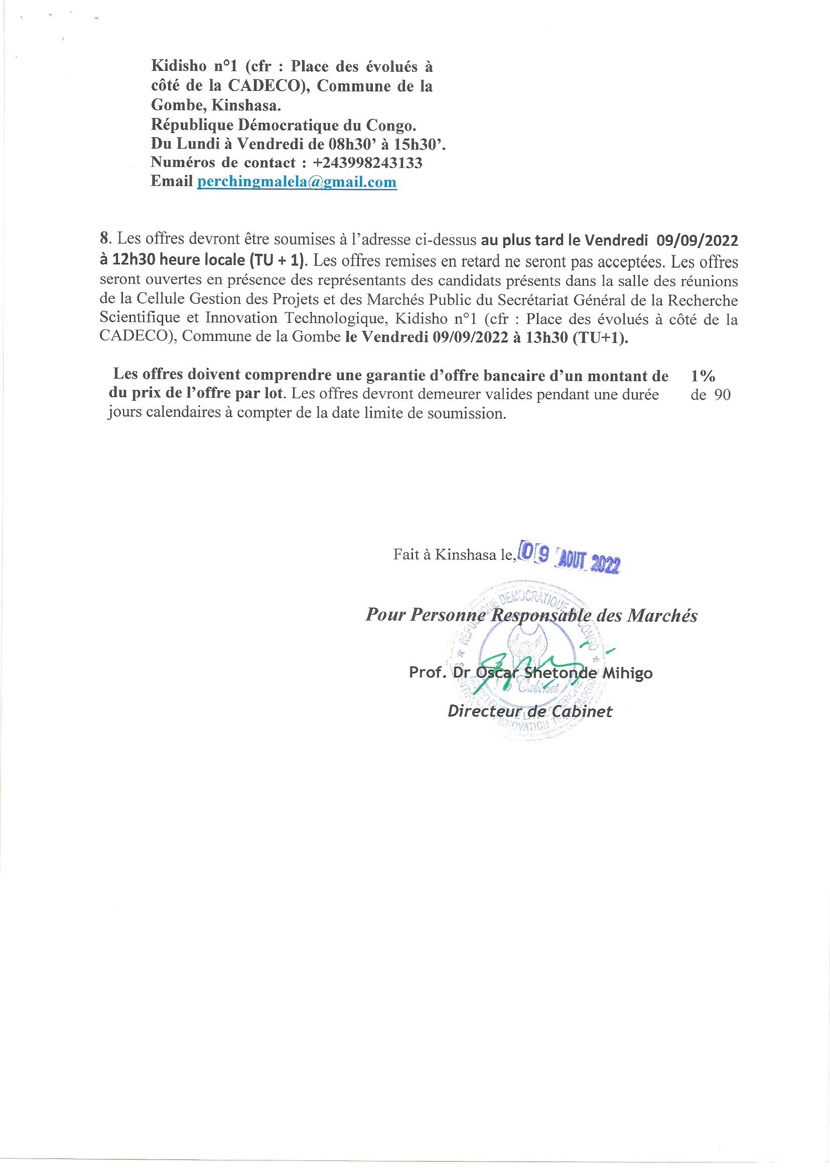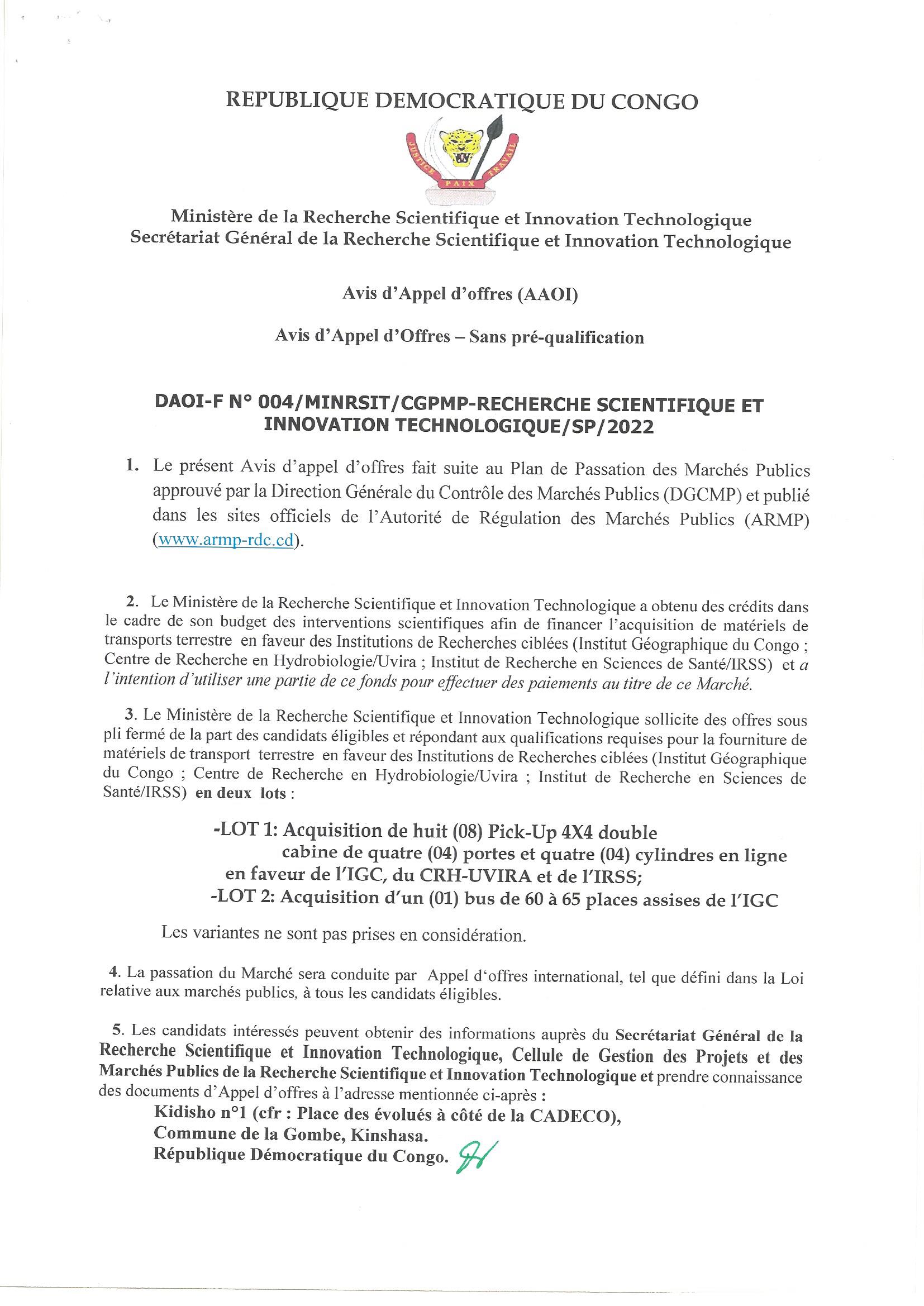 Acquisition de matériels de transports terrestre en faveur des institutions de recherches ciblées : institut géographique du Congo; centre de recherche en hydrobiologie/Uvira; institut de recherche en sciences de santé/IRSS.