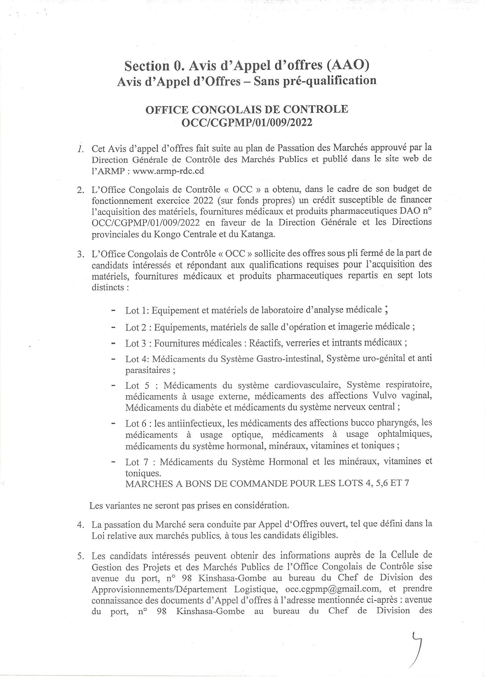 Acquisition des matériels, fournitures médicaux et produits pharmaceutiques repartis en sept lots distincts.