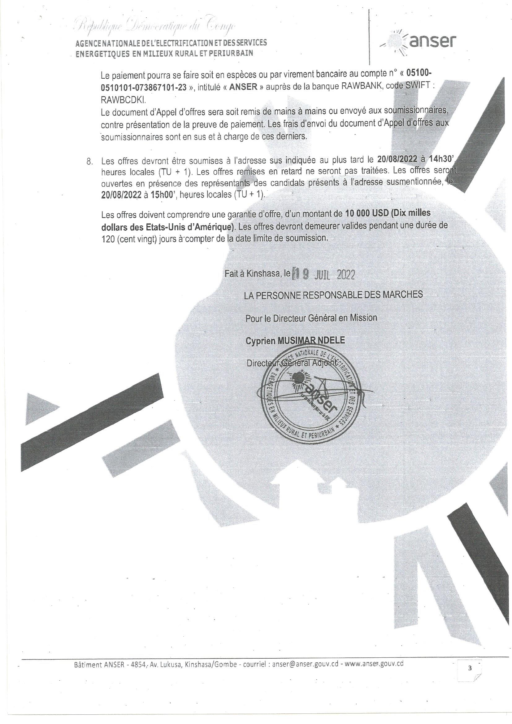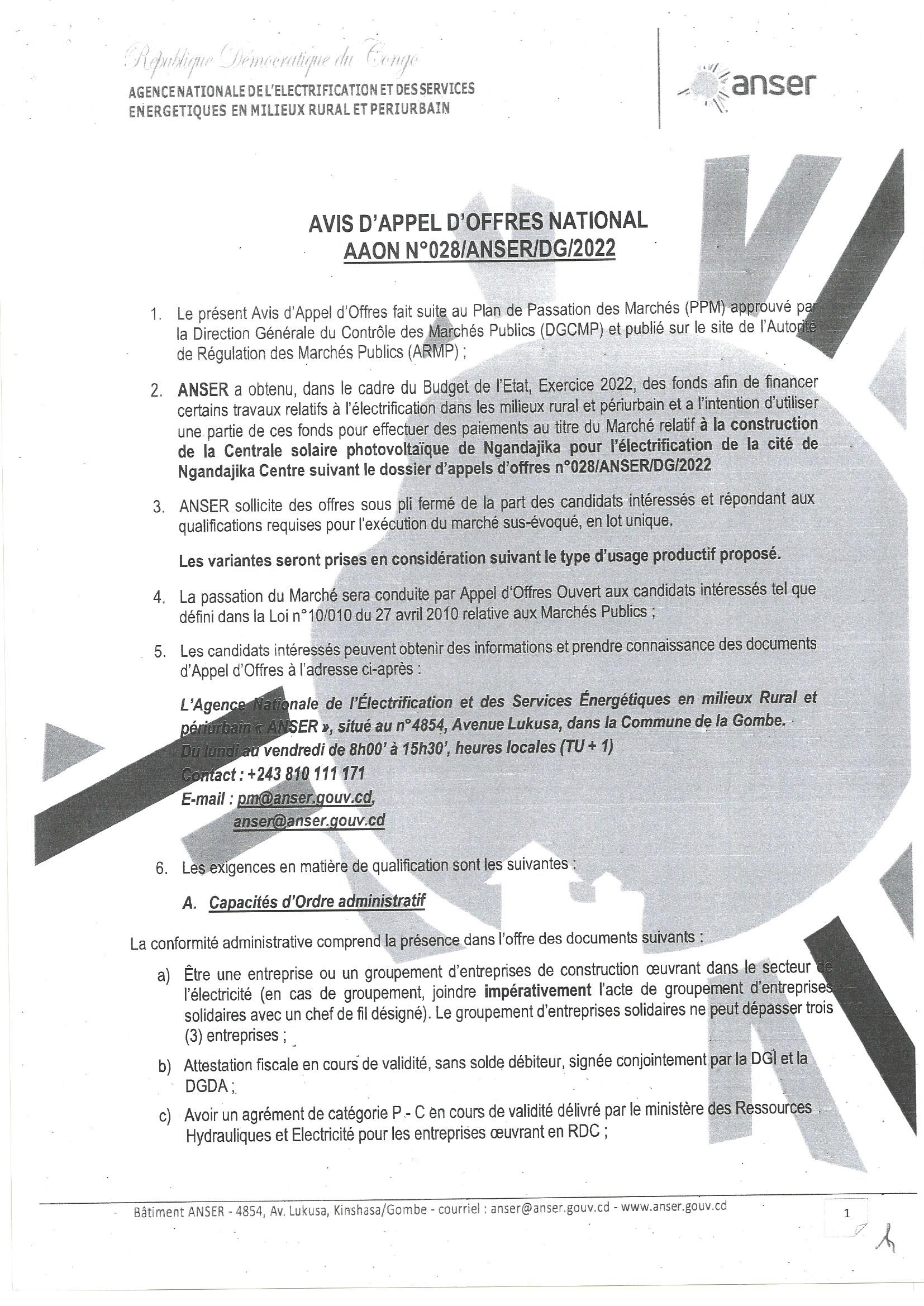 AVIS D’APPEL D’OFFRE RELATIF A LA CONSTRUCTION DE LA CENTRALE SOLAIRE PHOTOVOLTAIQUE DE KAMAYI (1MWC) POUR L’ELECTRIFICATION DE LA PERIPHERIE DE KANANGA…