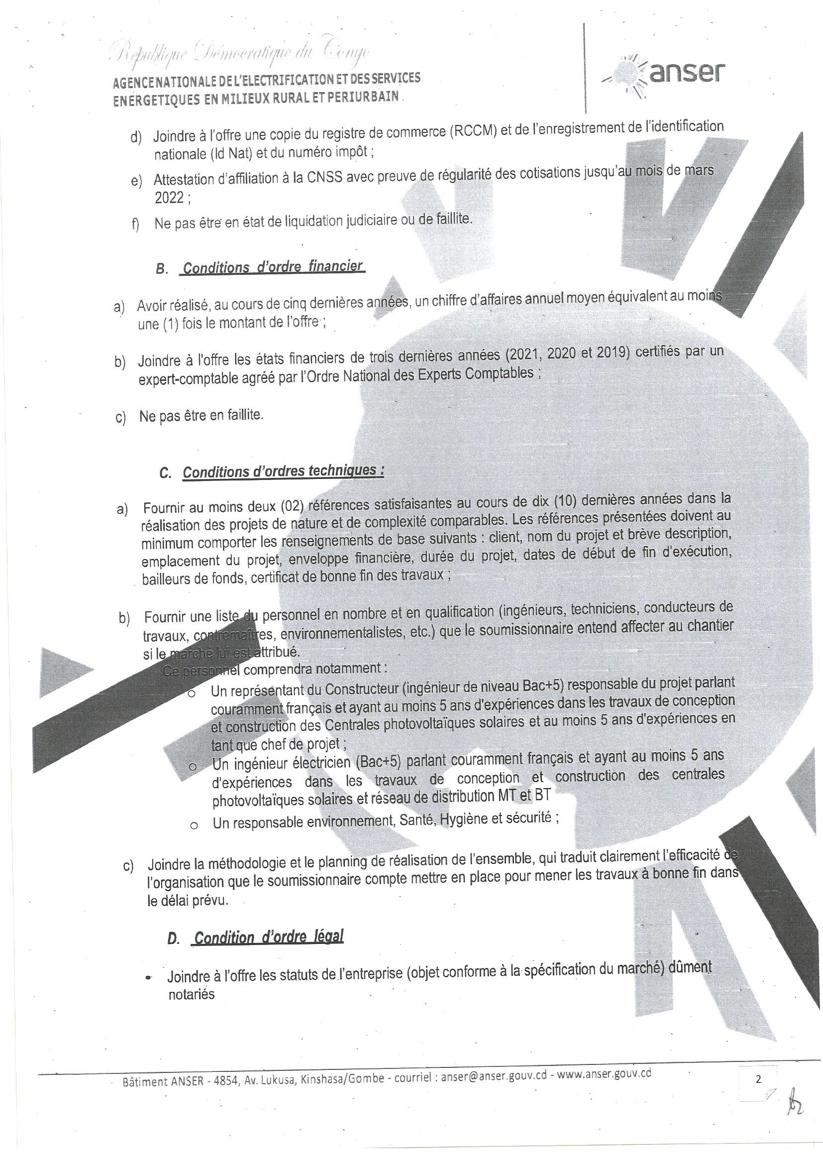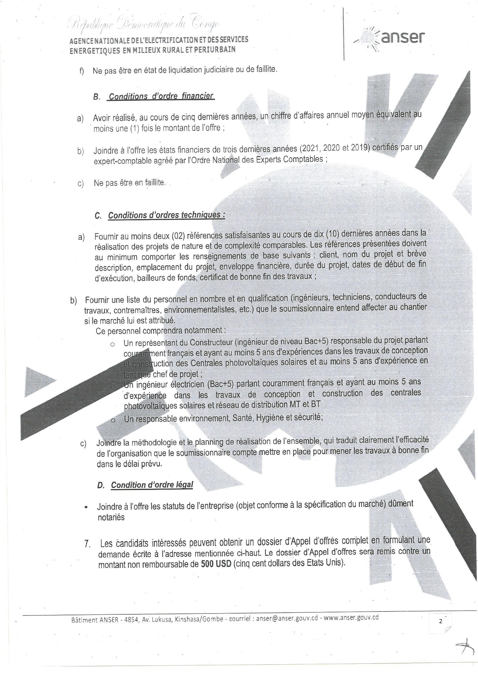 AVIS D’APPEL D’OFFRE RELATIF A LA CONSTRUCTION DE LA CENTRALE SOLAIRE PHOTOVOLTAIQUE DE LUBAO CENTRE (100KW) POUR L’ELECTRIFICATION DE LA CITE DE LUBAO CENTRE …