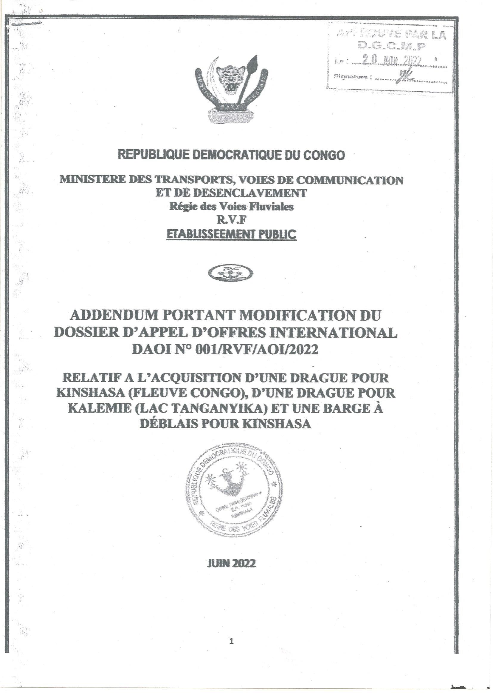 Addendum portant modification du dossier d’appel d’offres international DAOI N° 001/RVF/AOI/2022 relatif au marché des fournitures de la RVF