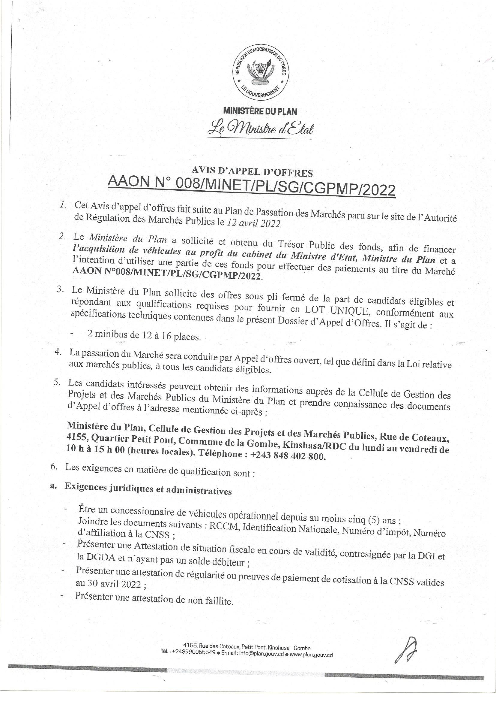 Acquisition de véhicules au profit du cabinet du ministre d’état, ministre du plan et a l’intention