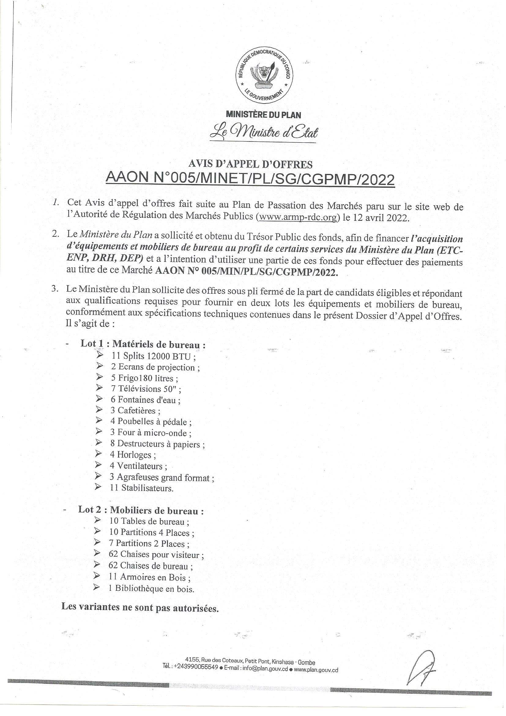 Acquisition d’équipements et mobiliers de bureau au profit de certains services du ministère du PLAN (ETC-ENP, DRH,DEP)