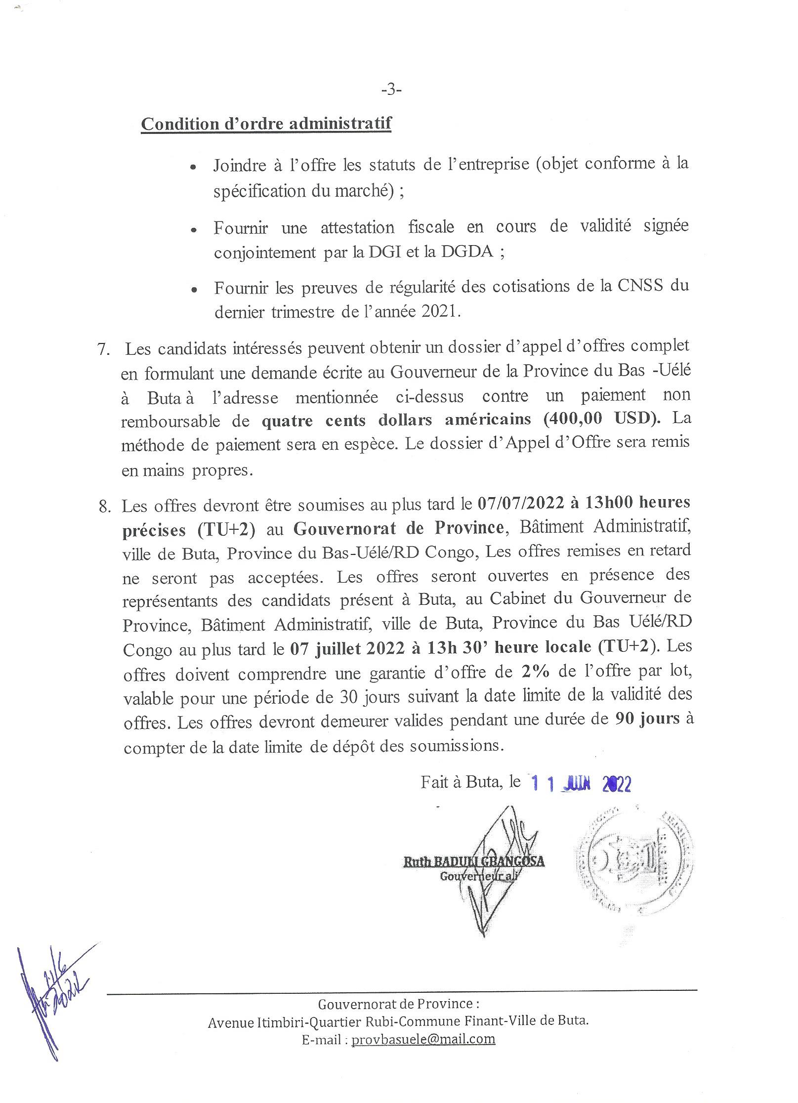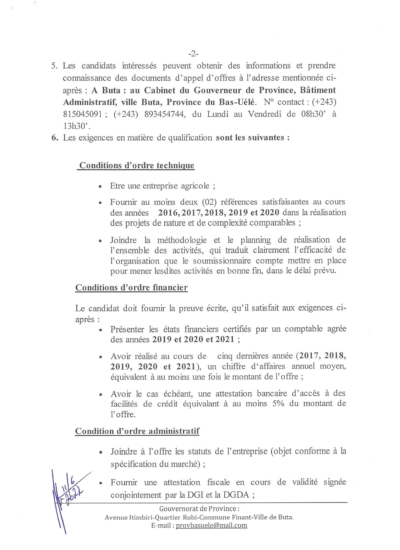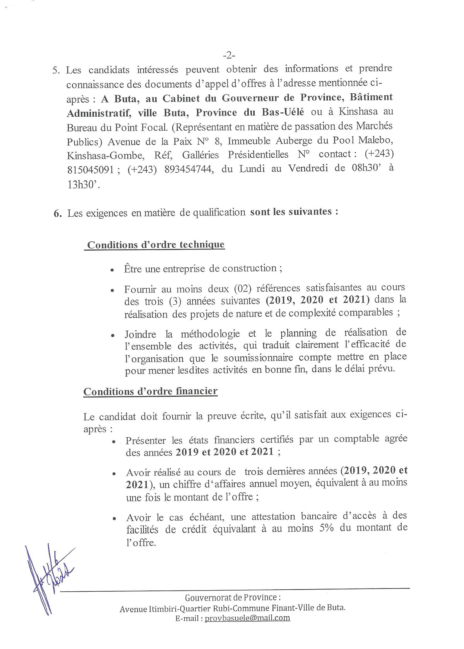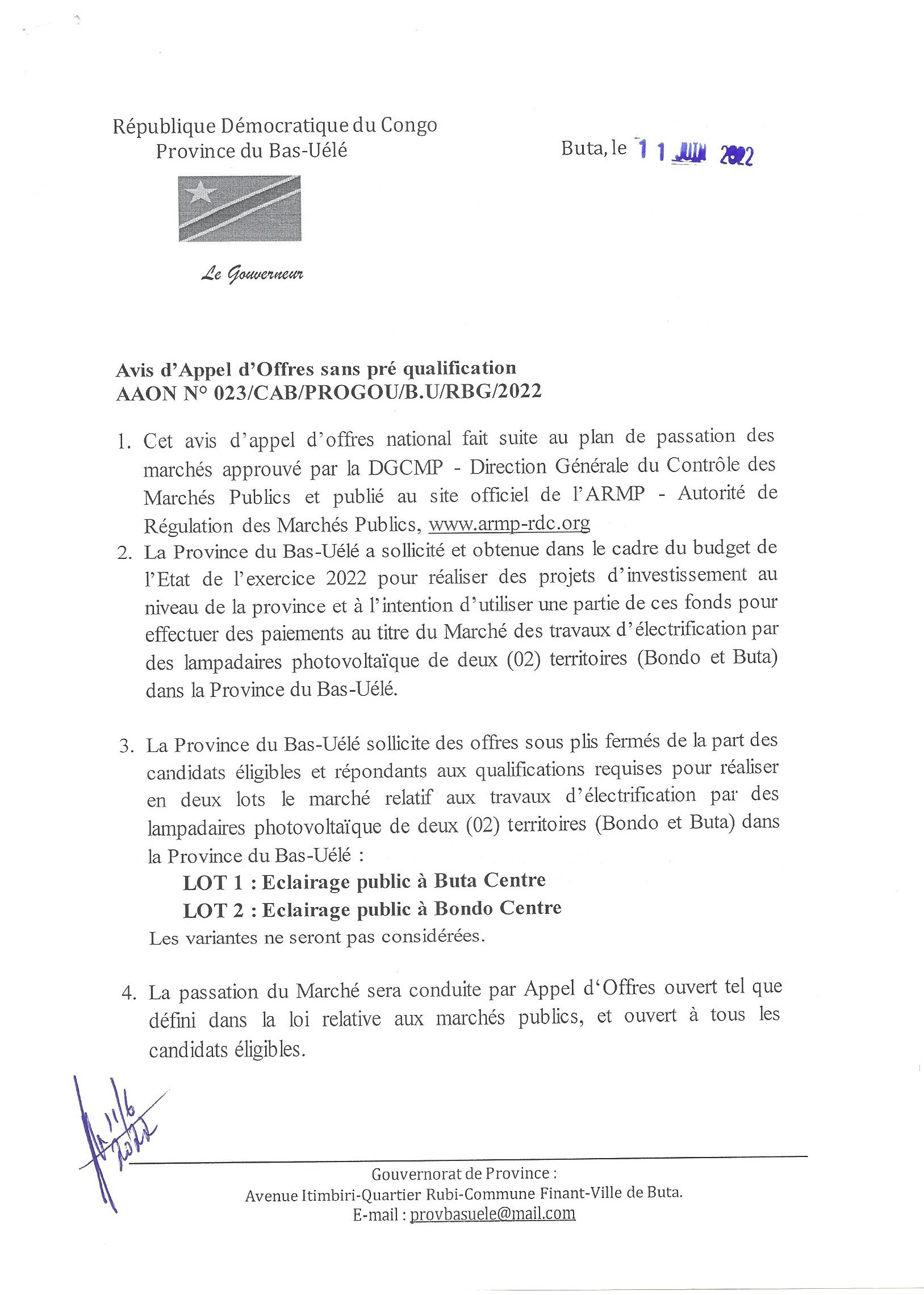 MARCHÉ DE TRAVAUX D’ÉLECTRIFICATION PAR DES LAMPADAIRES PHOTOVOLTAÏQUE DE DEUX (02) TERRITOIRES (BONDO & BUTA) DANS LA PROVINCE DU BAS-UELE.