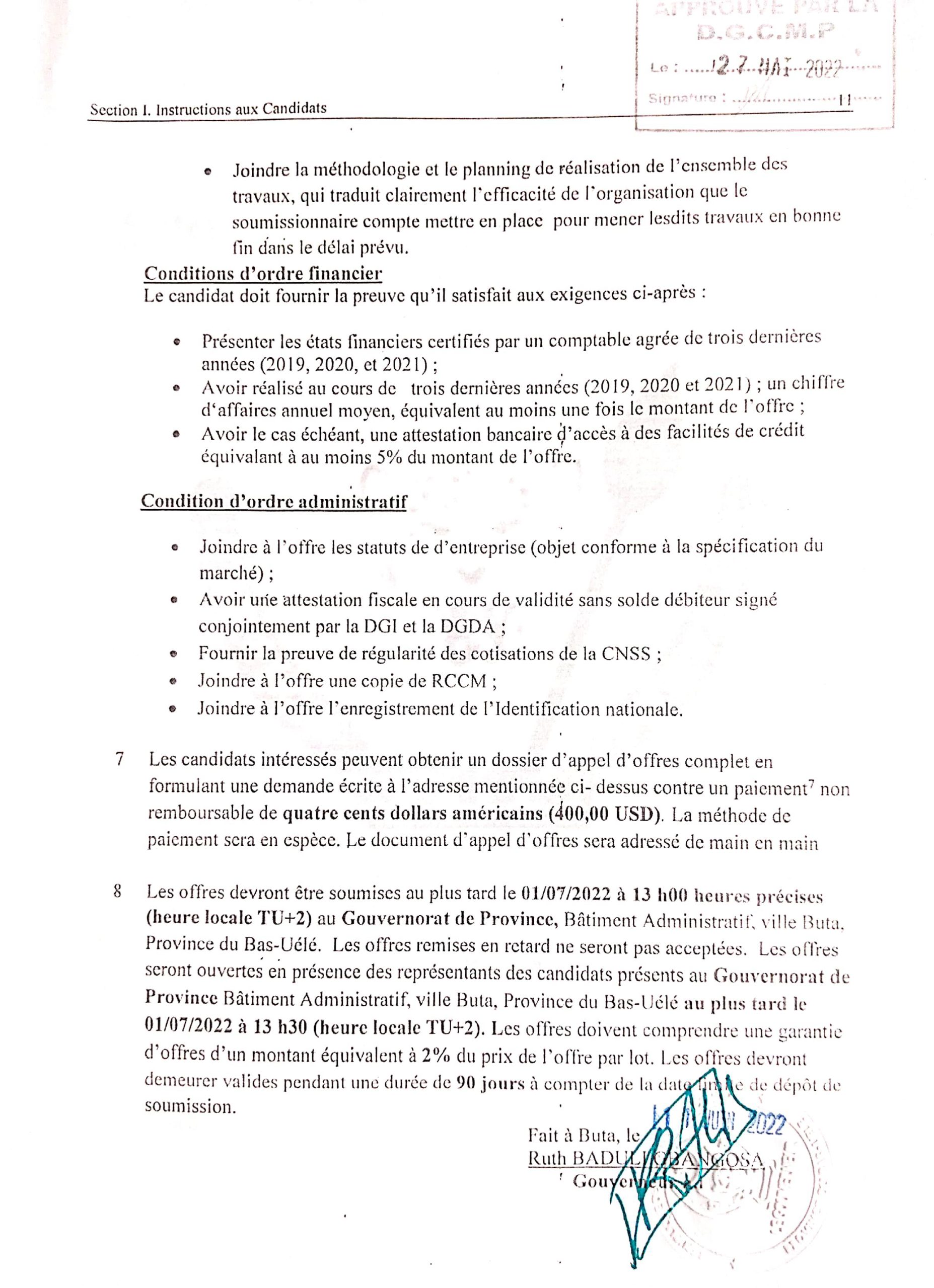 AVIS D’APPEL D’OFFRE POUR L’ADDITION DU BATIMENT DE LA DIRECTION GENERALE DE RECETTES DU KWILU A BANDUNDU VILLE