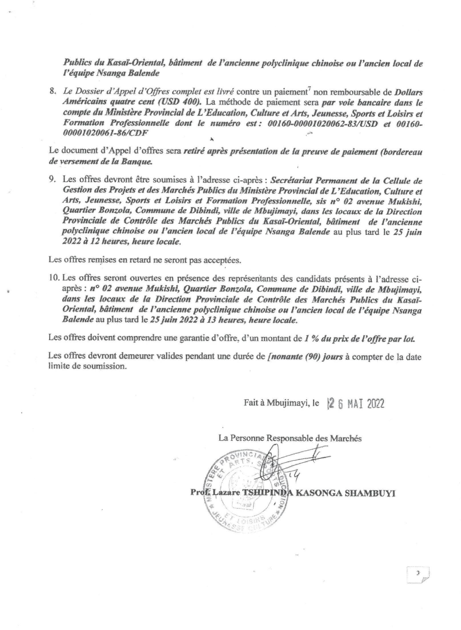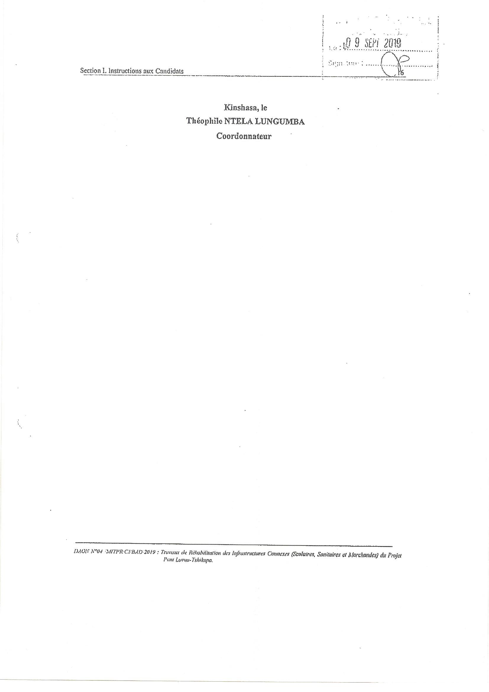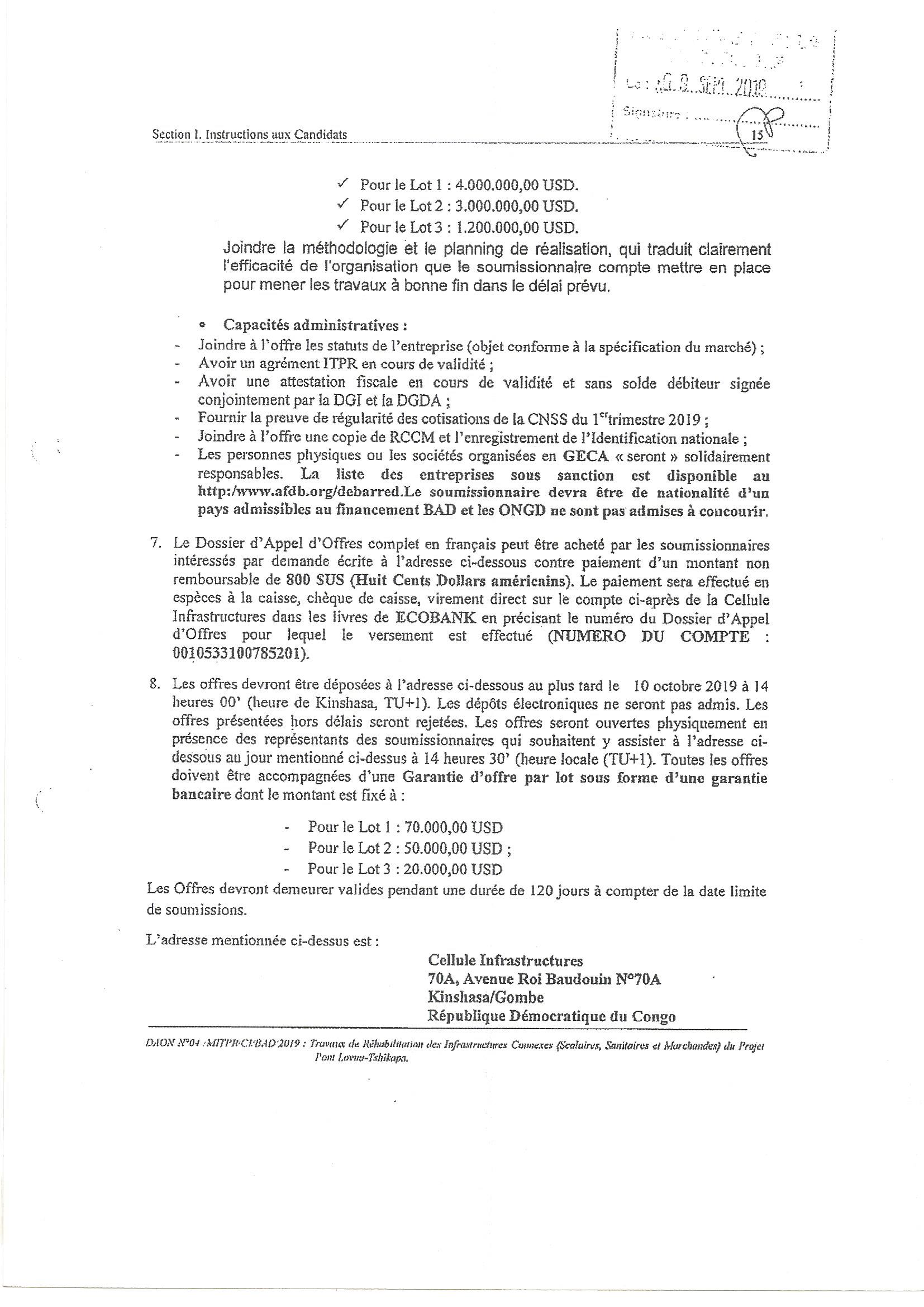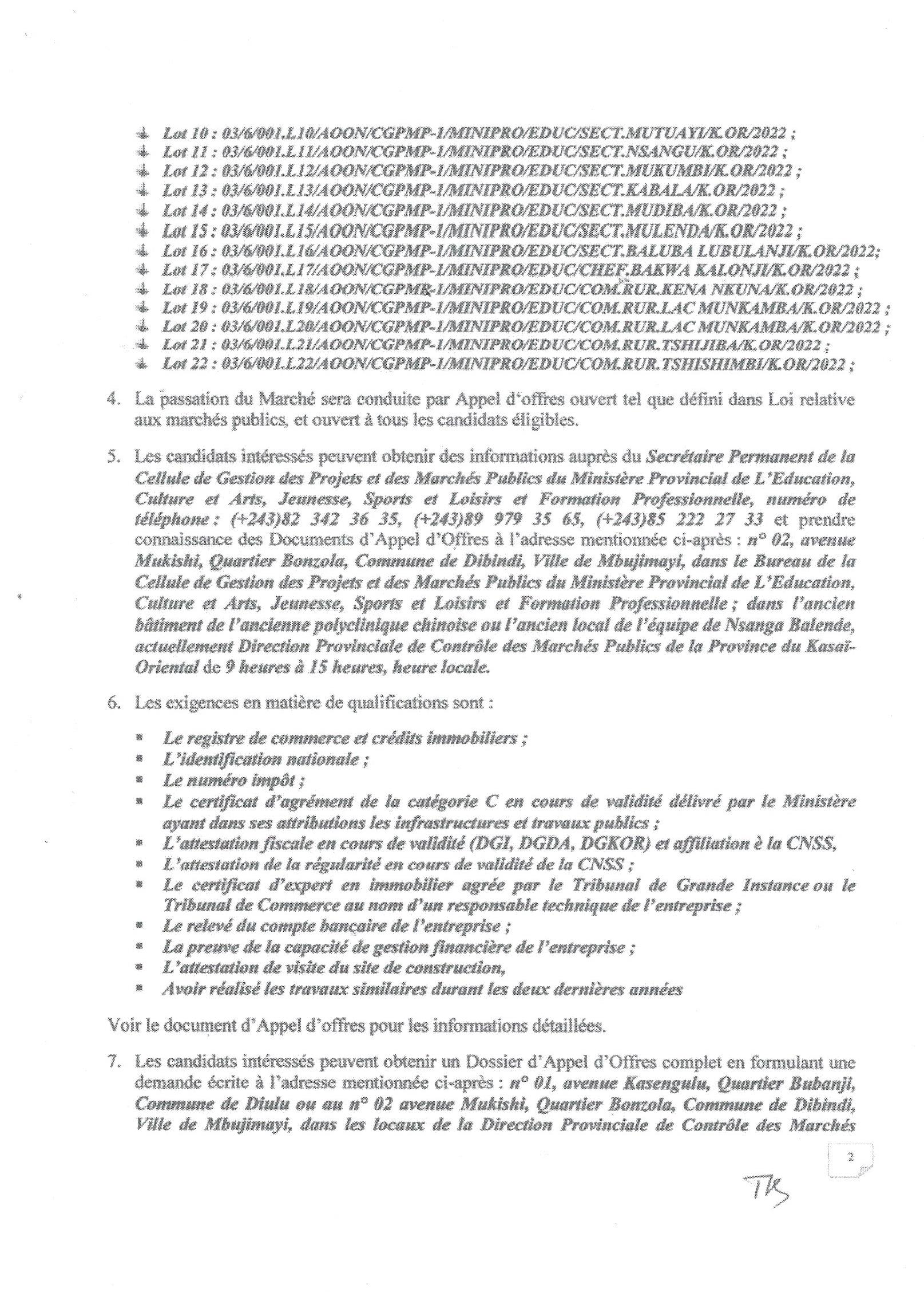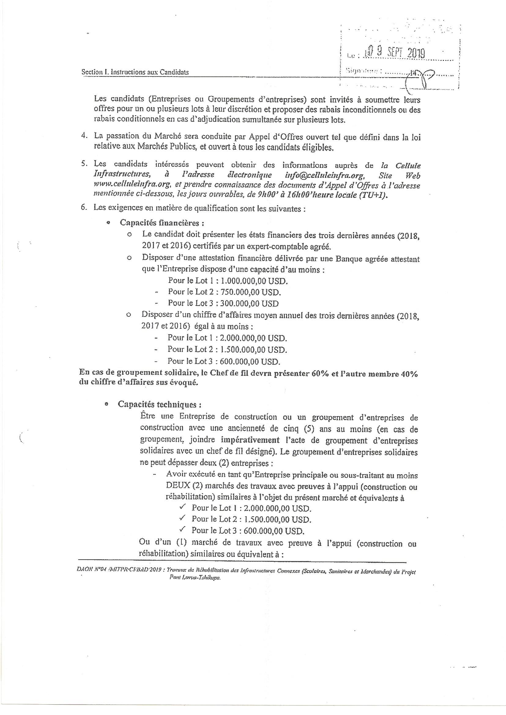 AVIS DE D’APPEL D’OFFRES DU MINISTERE DES INFRASTRUCTURES, TRAVAUX PUBLICS ET RECONSTRUCTION RELATIF AUXTRAVAUX DE REHABILITATION DES INFRASTRUCTURES CONNEXES (SCOLAIRES, SANITAIRES ET MARCHANDES) DU PROJET PONT LOVUA-TSHIKAPA.