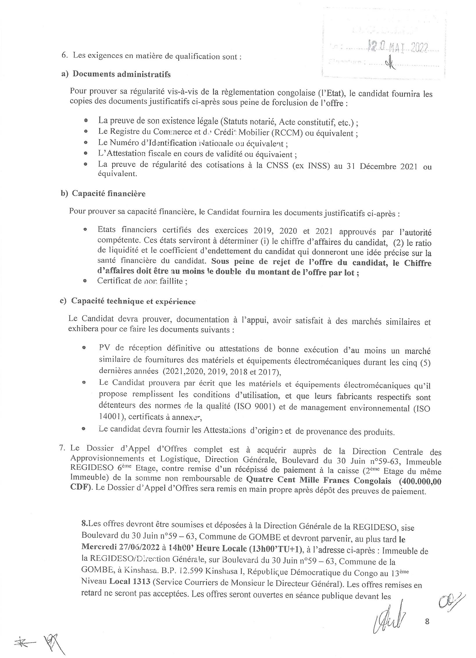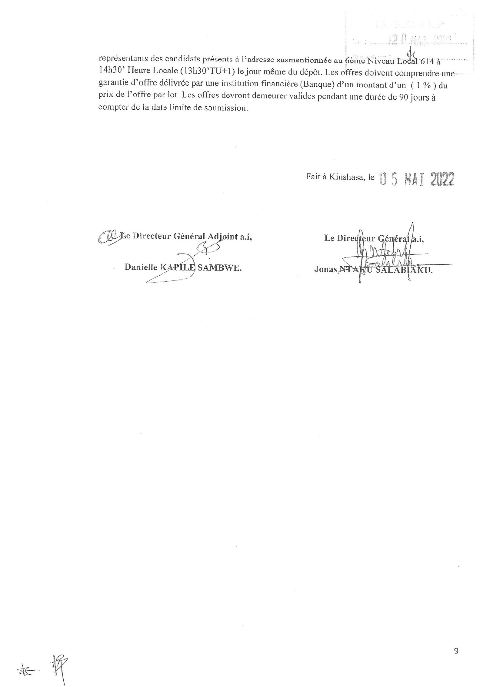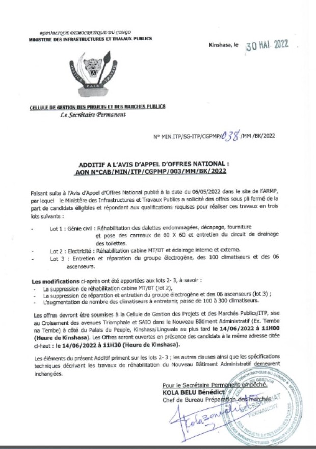 AVIS D’APPEL D’OFFRES ADDITIF DU MINISTERE DES INFRASTRUCTURES ET TRAVAUX PUBLICS RELATIF AU MARCHE DES TRAVAUX