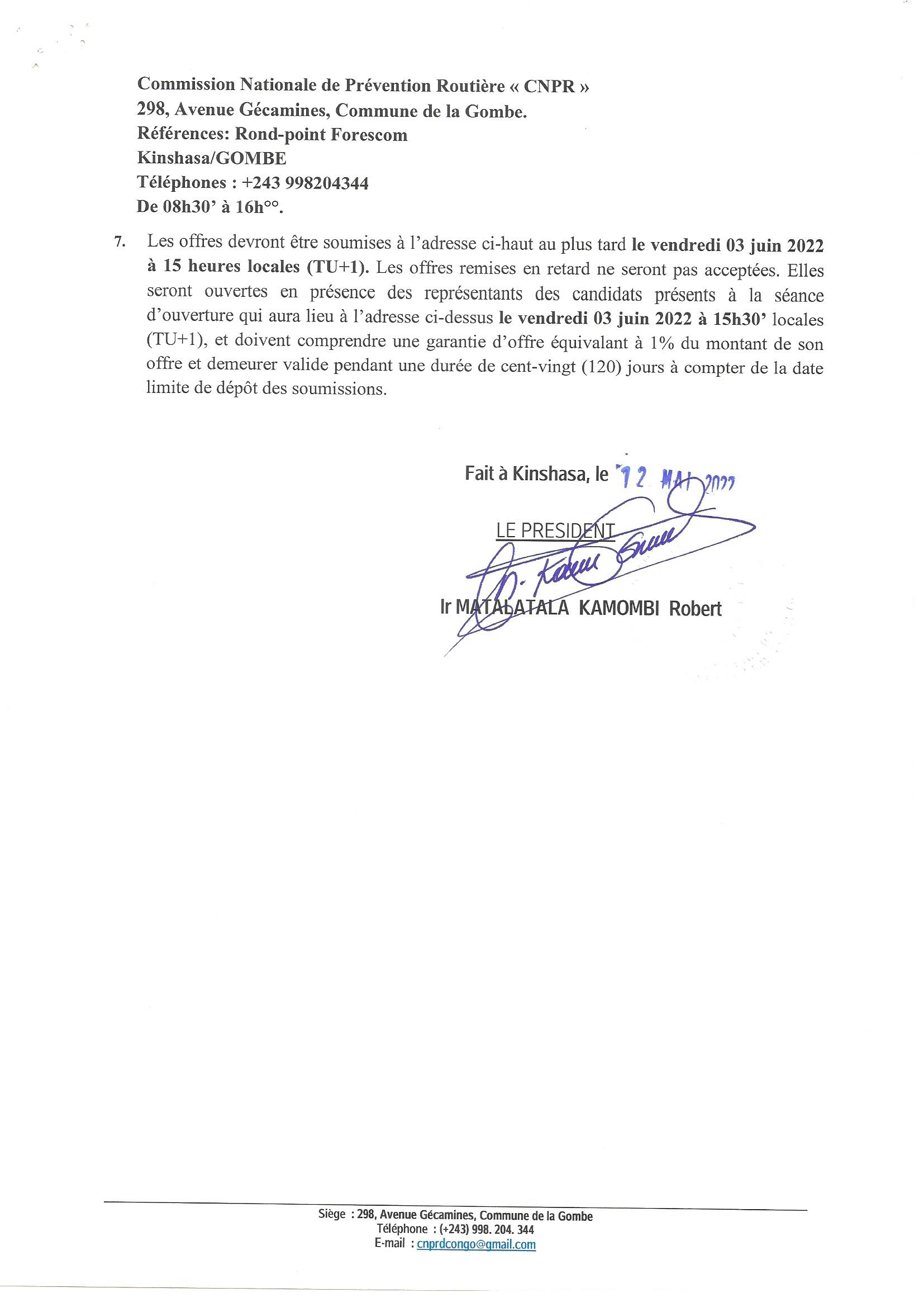 8. Les offres devront être soumises à l’adresse ci-après : Local 8 de la Cellule d’Exécution du Projet (PADSP-CE), sise 90, Boulevard du 30 juin, 2ème étage, Immeuble le PARADISO, Commune de la Gombe, Ville de Kinshasa, BP: 9378 Kin I, RDC, courriel secretariat.padsp@padsp-ce.cd et réserver une copie aux e-mails : vincentnkutulabund@gmail.com et fatimkaba@hotmail.com; Tél (+243) 81 22 32 914 / 99 35 54 57 / 81.59 92 080, au plus tard le lundi 30 Mai 2022 à 15 heures locales (TU+1). Les offres remises en retard ne seront pas acceptées. Les offres seront ouvertes en présence des représentants des candidats présents à l’adresse ci-dessus le même lundi 30 Mai 2022 à 15 h30’ (TU+1). Les offres devront demeurer valides pendant une durée de 90jours à compter de la date limite de soumission. Les offres doivent comprendre une garantie d’offres d’un montant de 5.390 USD. Cette garantie doit être valide pour une période de 30 jours après la date limite de la validité des offres.