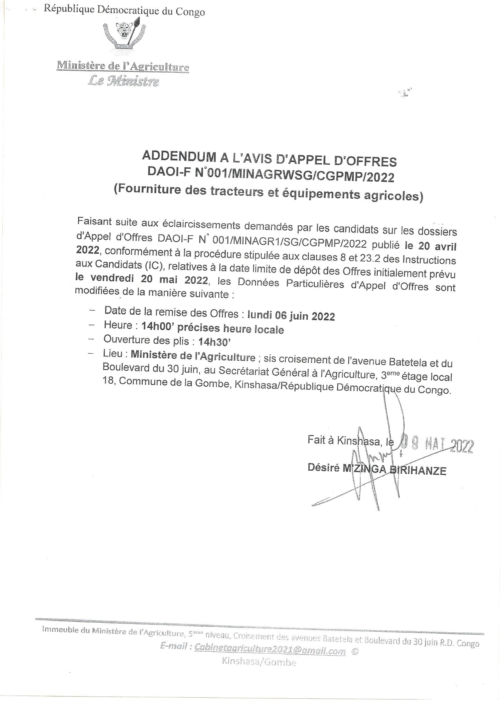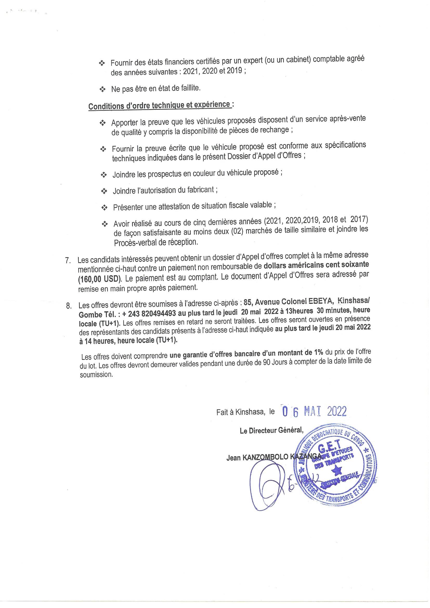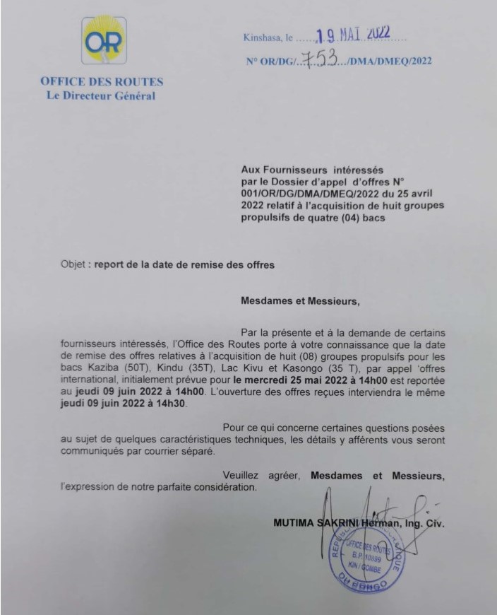 Acquisition de huit (08) groupes propulsifs pour bacs Kazabi, Kindu, lac Kivu et Kasongo prévue pour le mercredi 25 mai 2022 à 14hoo est reportée au jeudi 09 juin 2022 à 14hoo