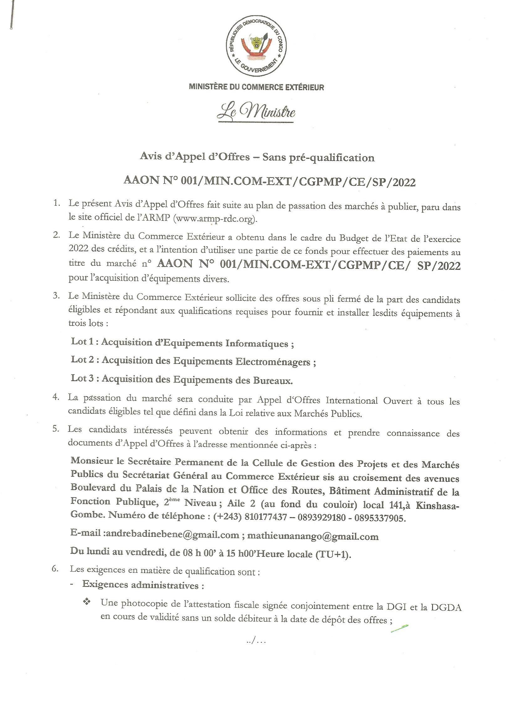 Acquisition d’équipements divers en faveur du ministère du commerce extérieur.