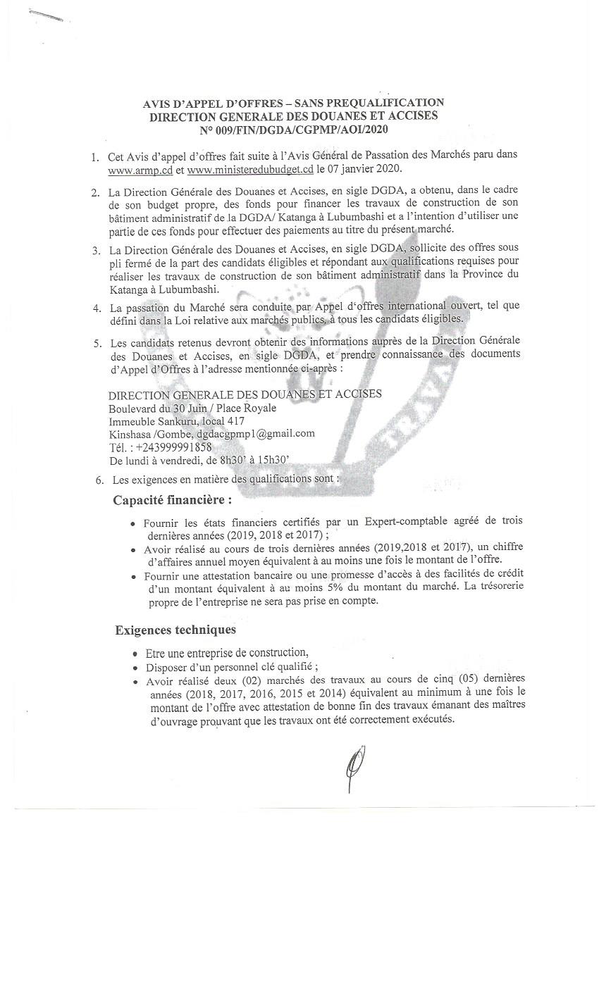 TRAVAUX DE CONSTRUCTION DU BÂTIMENT ADMINISTRATIF DE LA DGDA KATANGA À LUBUMBASHI.