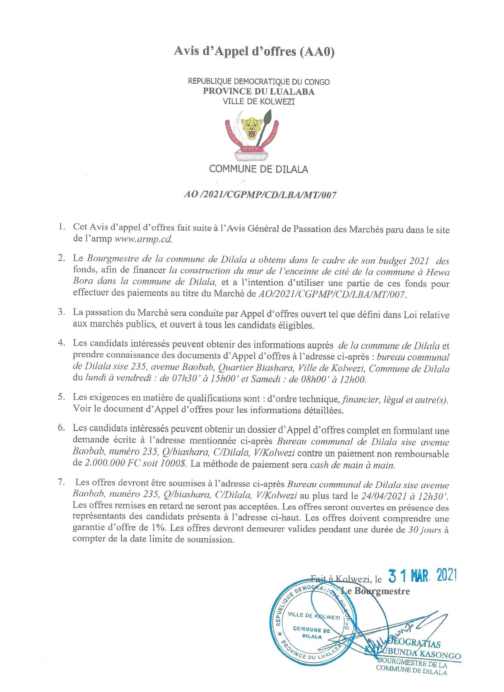 AVIS D’APPEL D’OFFRE POUR LES TRAVAUX D’AFFORESTATION AVEC ESSENCES A CROISSANCE RAPIDE (90HA) ET LE DEVELOPPEMENT DE L’AGROFORESTERIE (70HA) A DEMBA, DIMBELENGE ET KAZUMBA AU KASAI-CENTRAL.
