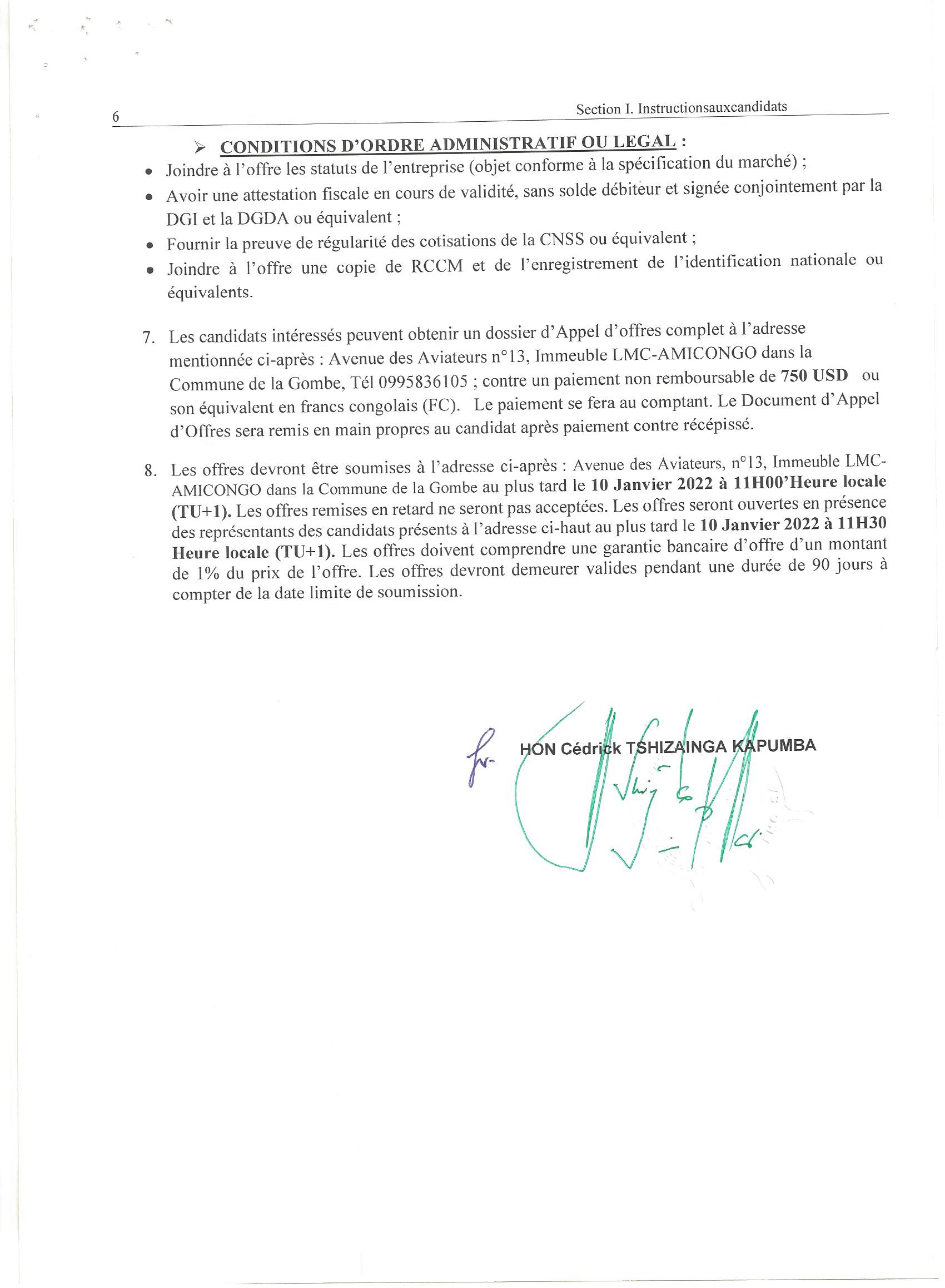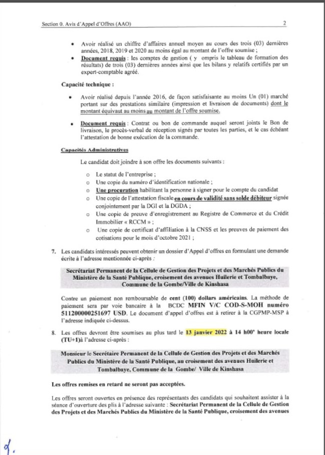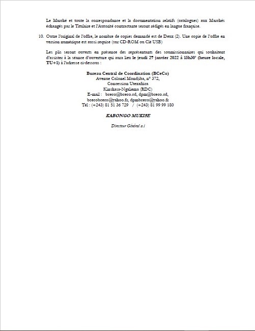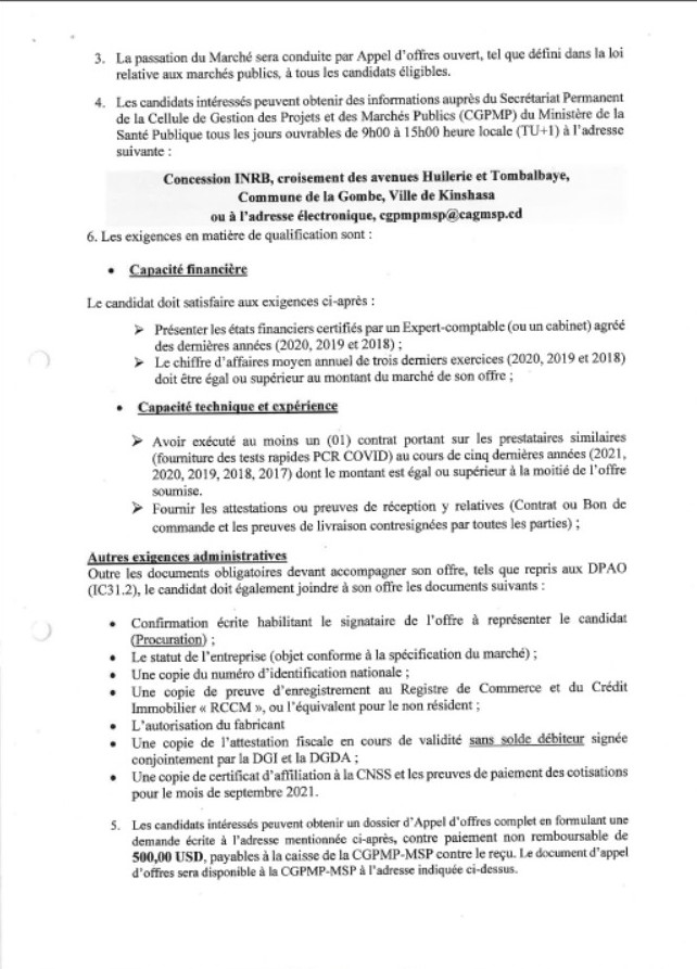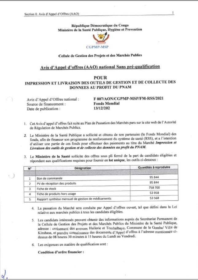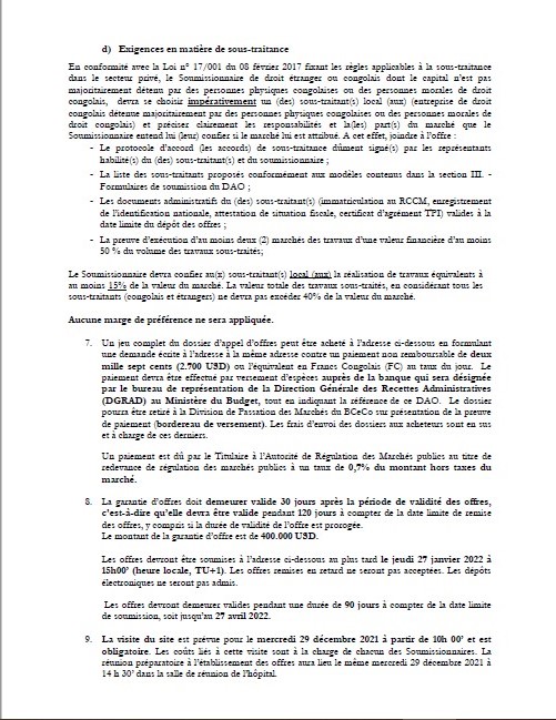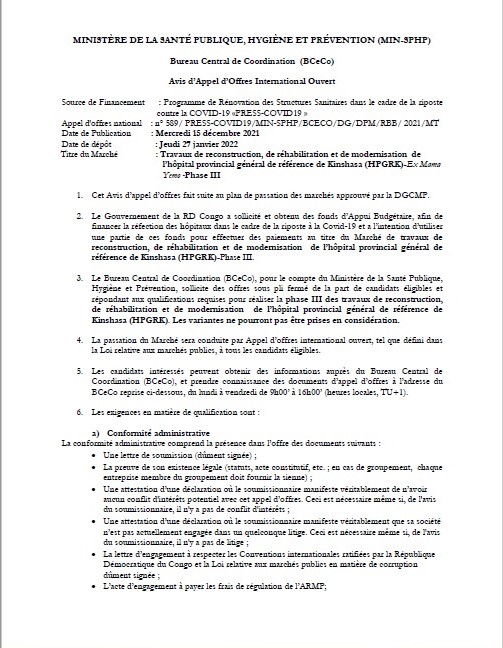 AVIS D’APPEL D’OFFRE POUR LES TRAVAUX DE RECONSTRUCTION, DE RÉHABILITATION ET DE MODERNISATION DE L’HÔPITAL PROVINCIAL GÉNÉRAL DE RÉFÉRENCE DE KINSHASA (HPGRK)-EX MAMA YEMO -PHASE III