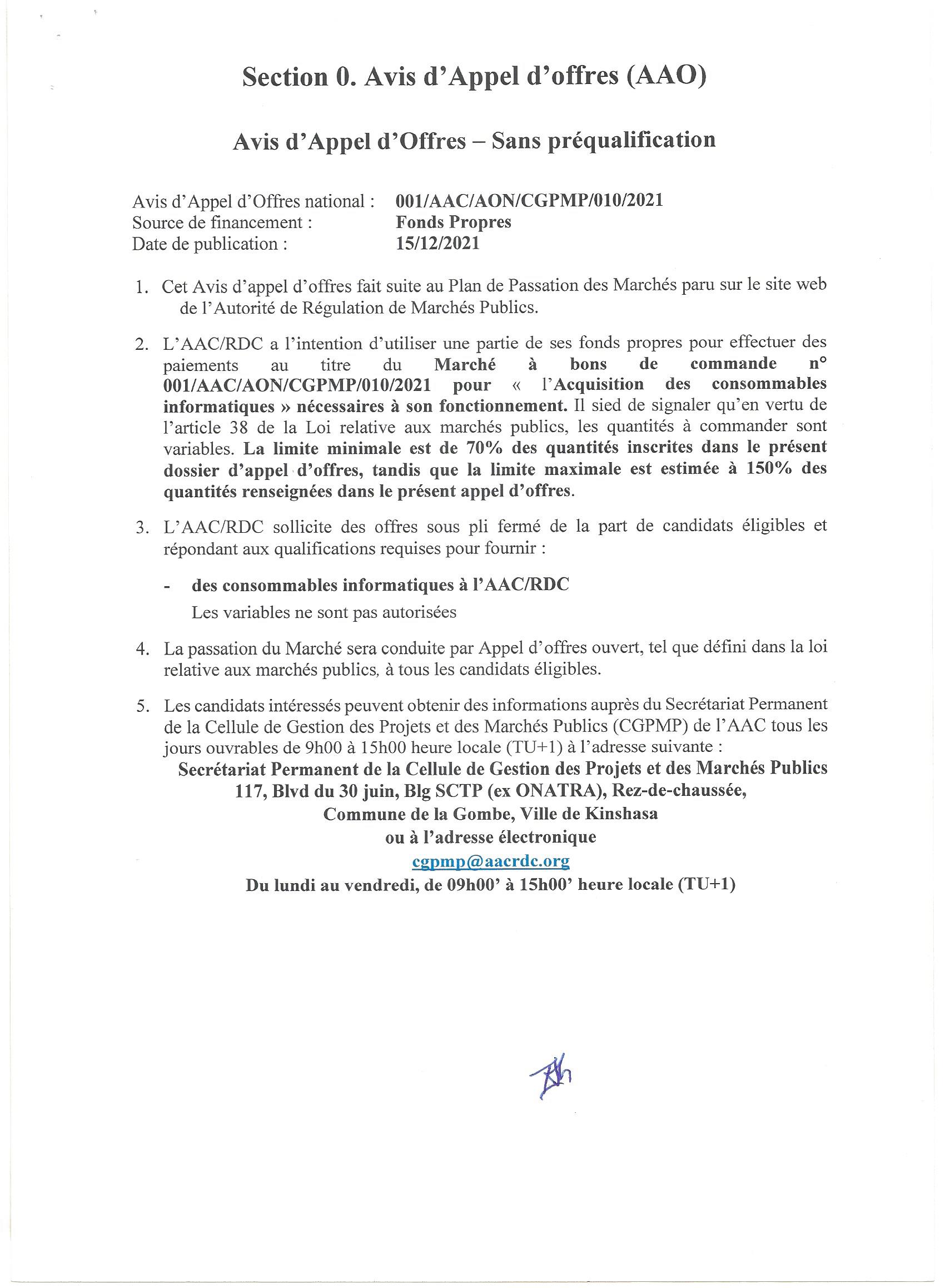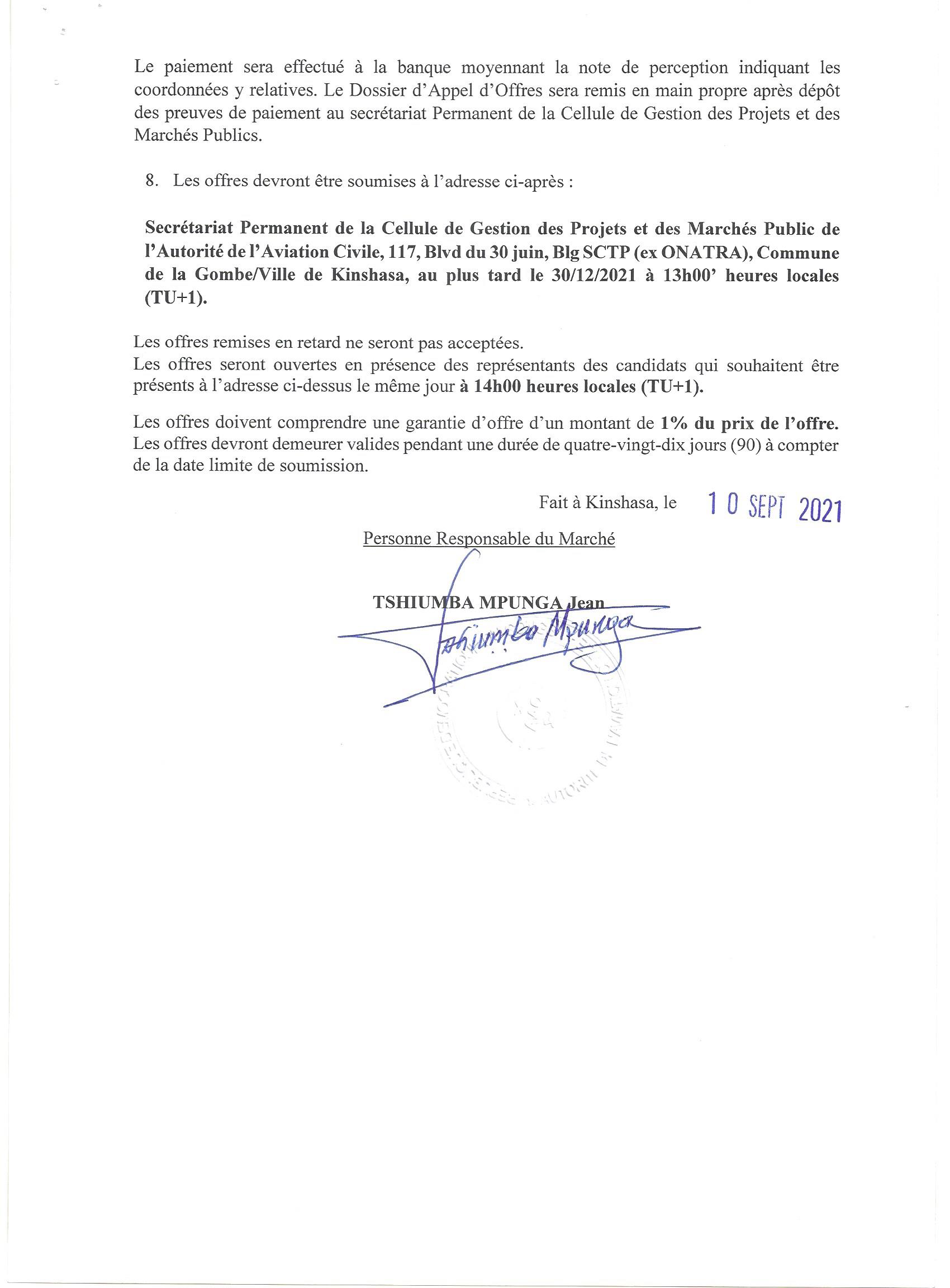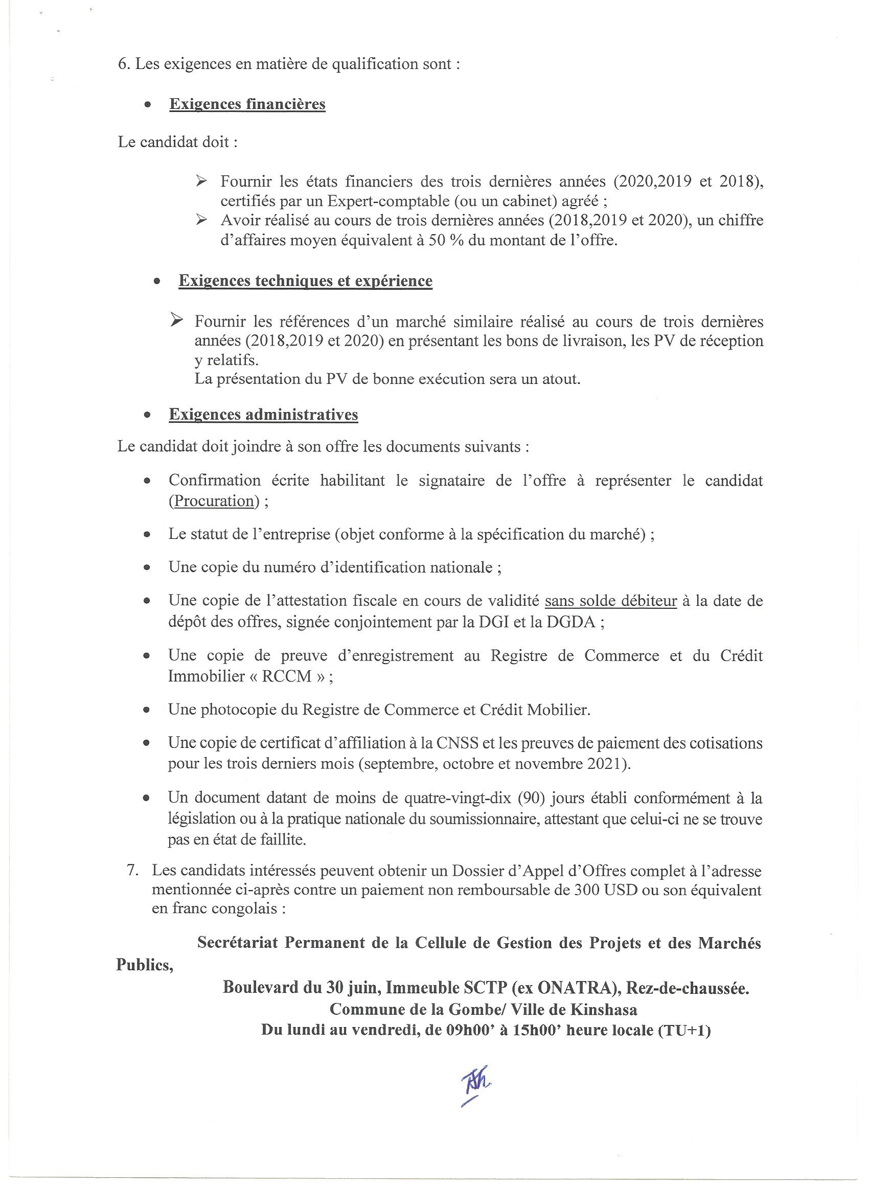 AVIS D’APPEL D’OFFRE NATIONAL POUR LES TRAVAUX DE REHABILITATION DE L’INSTITUT MOTEYI A MBANDAKA