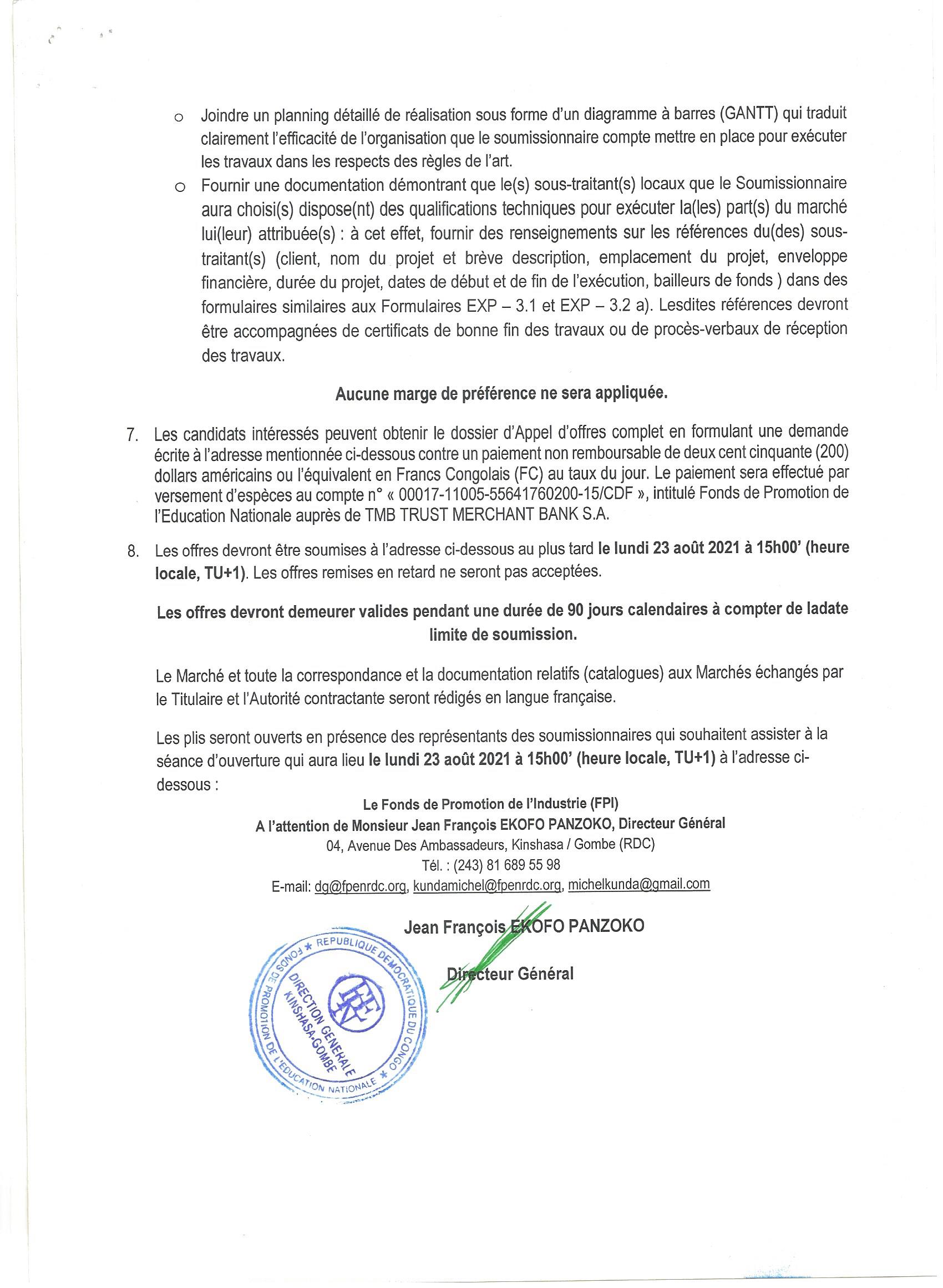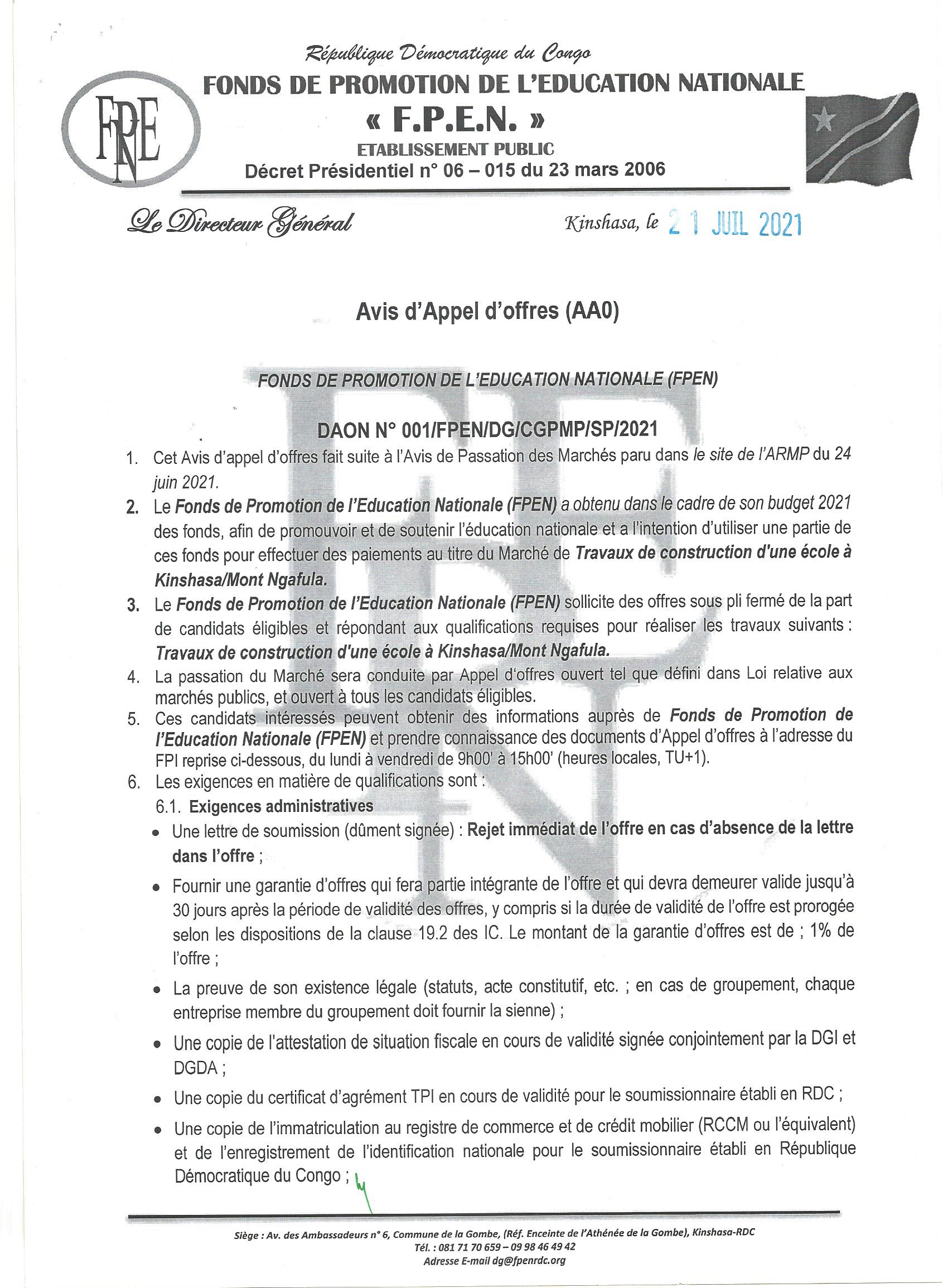 AVIS D’APPEL D’OFFRE POUR LA CONSTRUCTION D’UNE ECOLE A KINSHASA/MONT NGAFULA