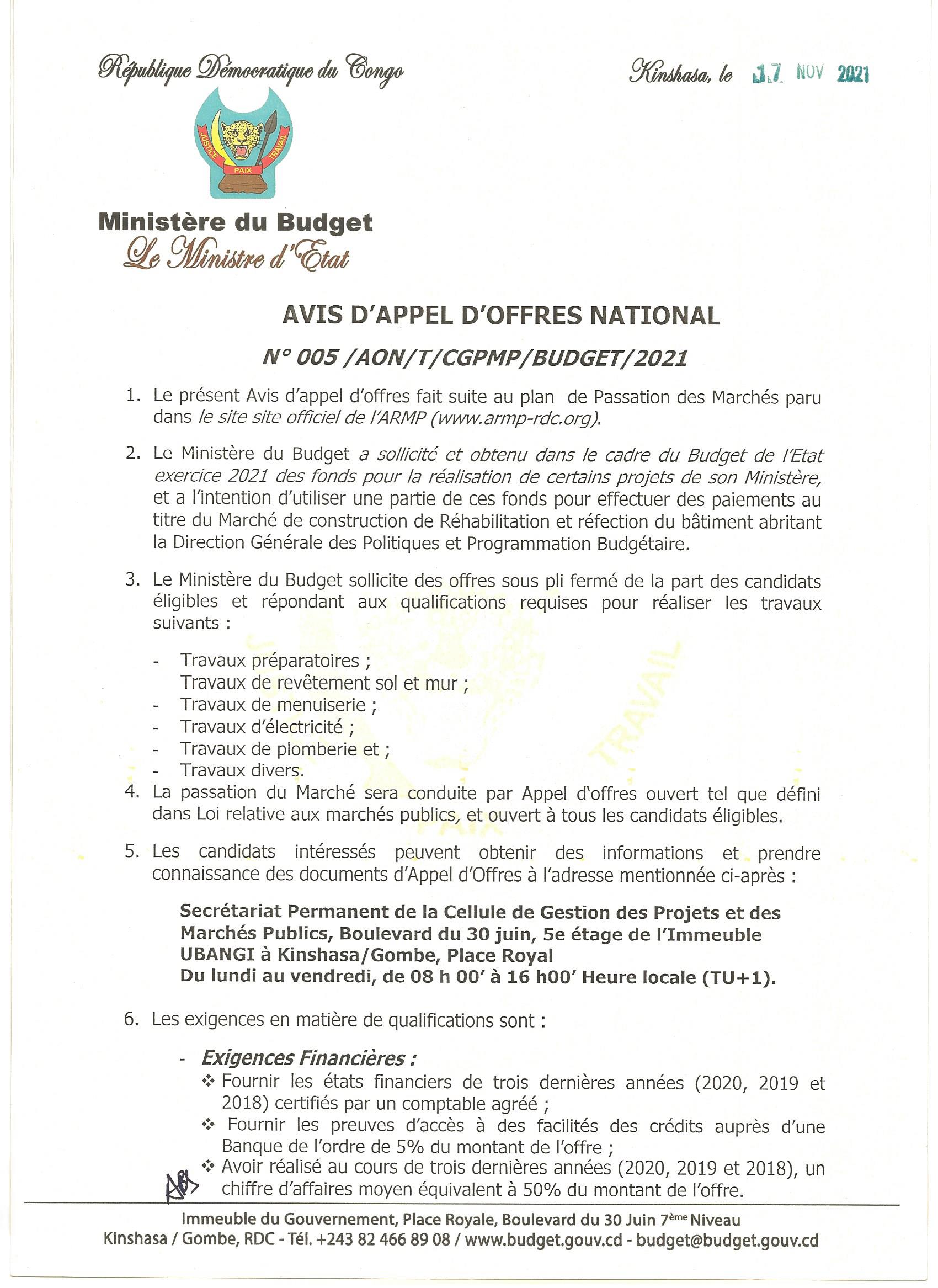 AVIS D’APPEL D’APPEL D’OFFRES NATIONAL DU MINISTERE DU BUDGET RELATIF AUX MARCHES DES TRAVAUX