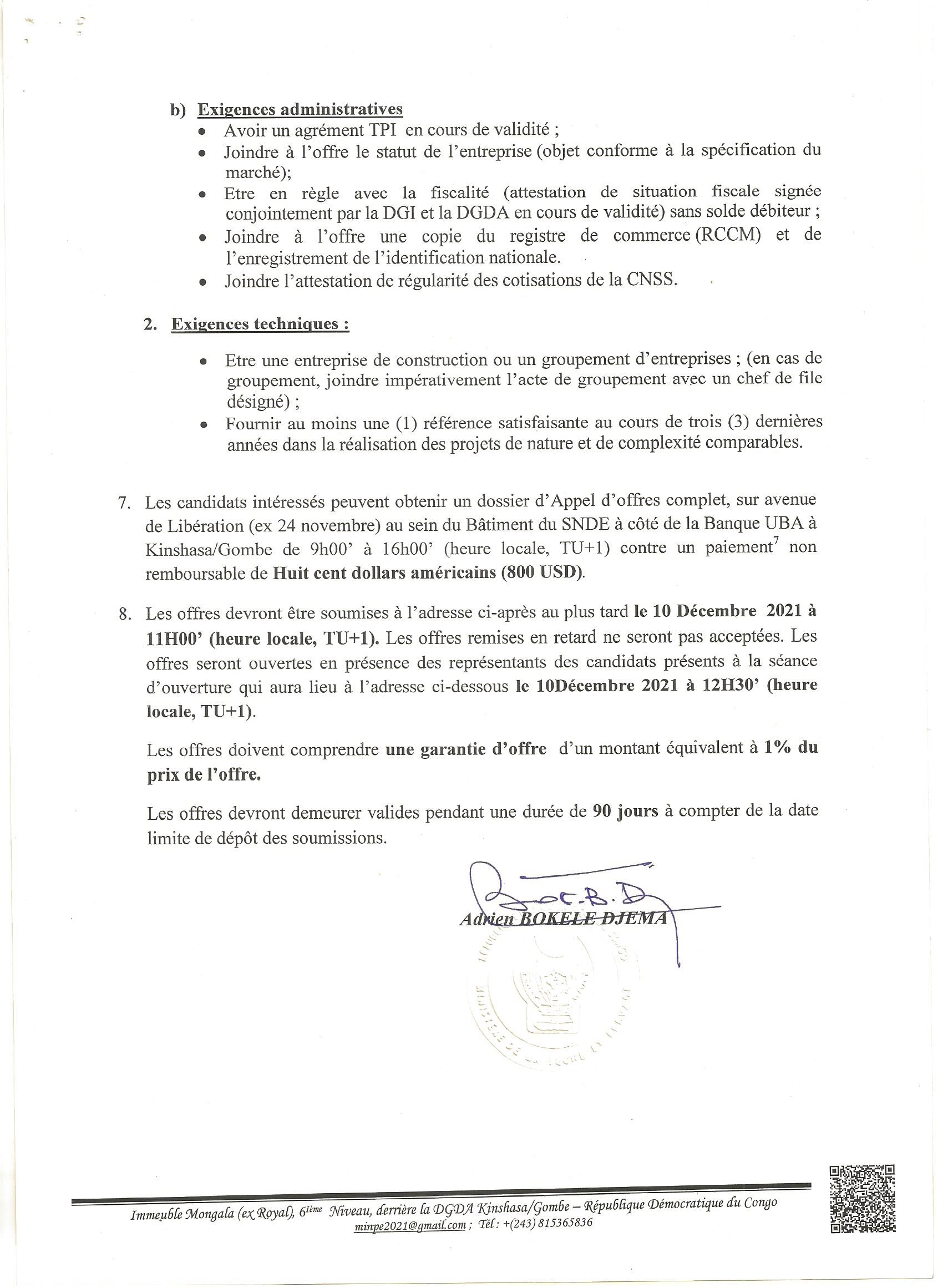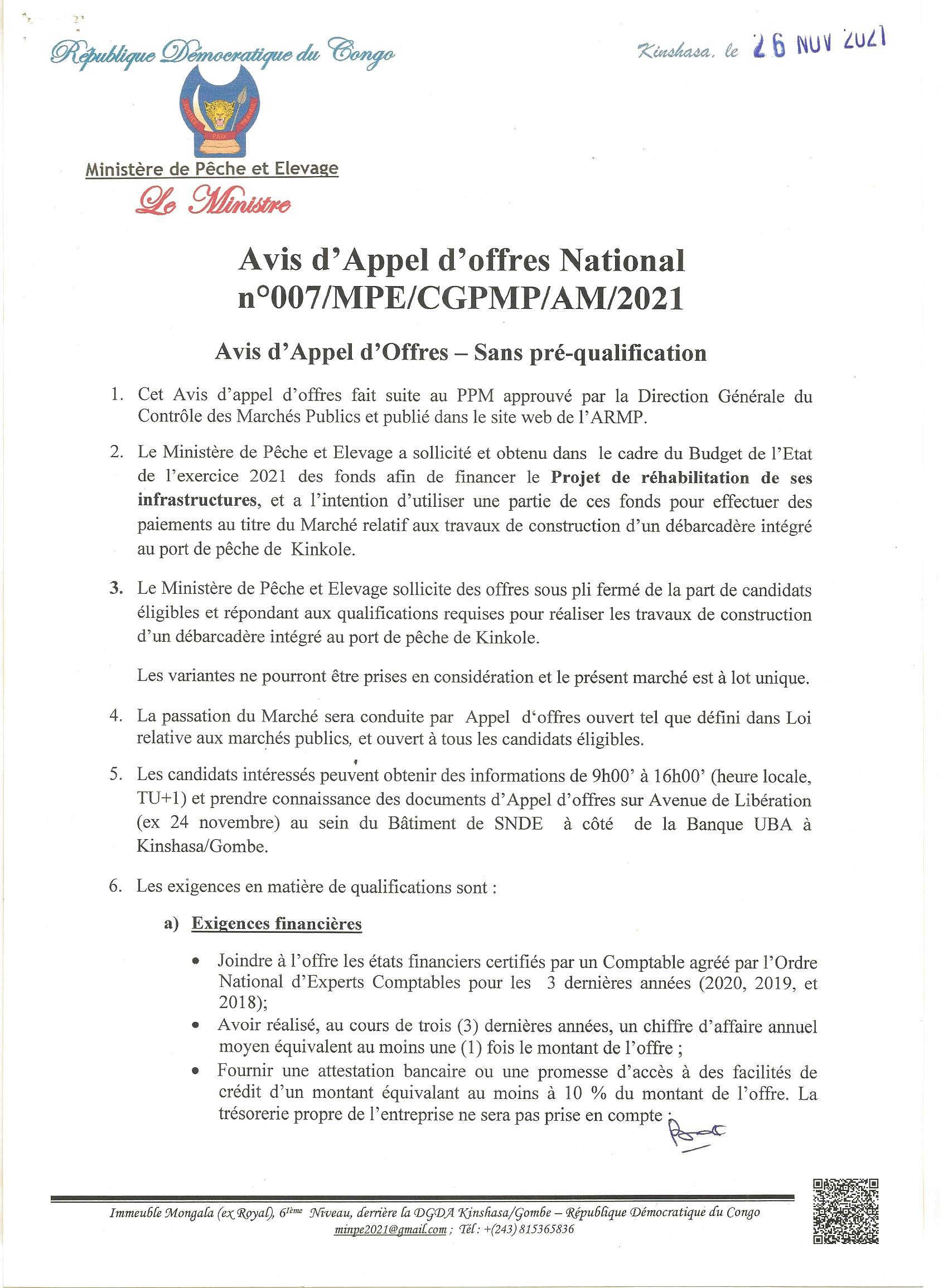AVIS D’APPEL D’OFFRES NATIONAL DU MINISTERE DE PECHE ET ELEVAGE RELATIF AUX TRAVAUX DE CONSTRUCTION D’UN DEBARCADERE INTEGRE AU PORT DE PECHE DE KINKOLE.