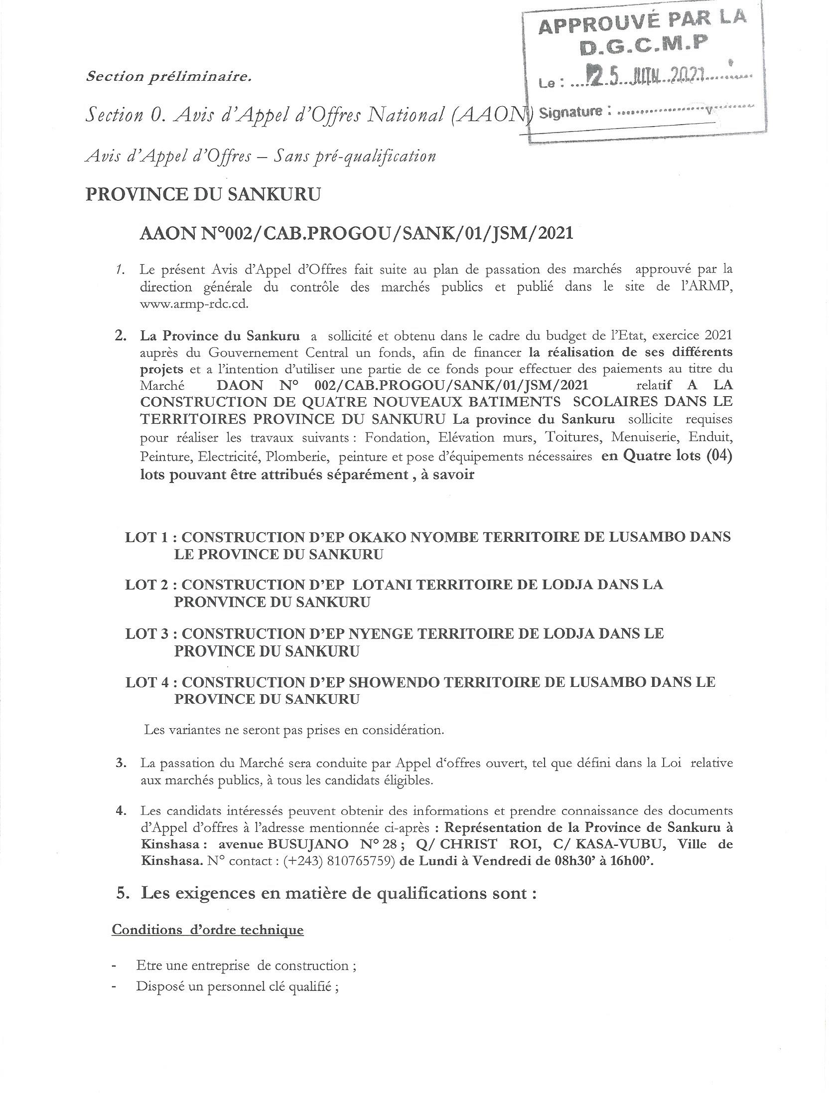 CONSTRUCTION DE QUATRE NOUVEAUX BÂTIMENTS SCOLAIRES DANS LES TERRITOIRES PROVINCE DU SANKURU(N°002)