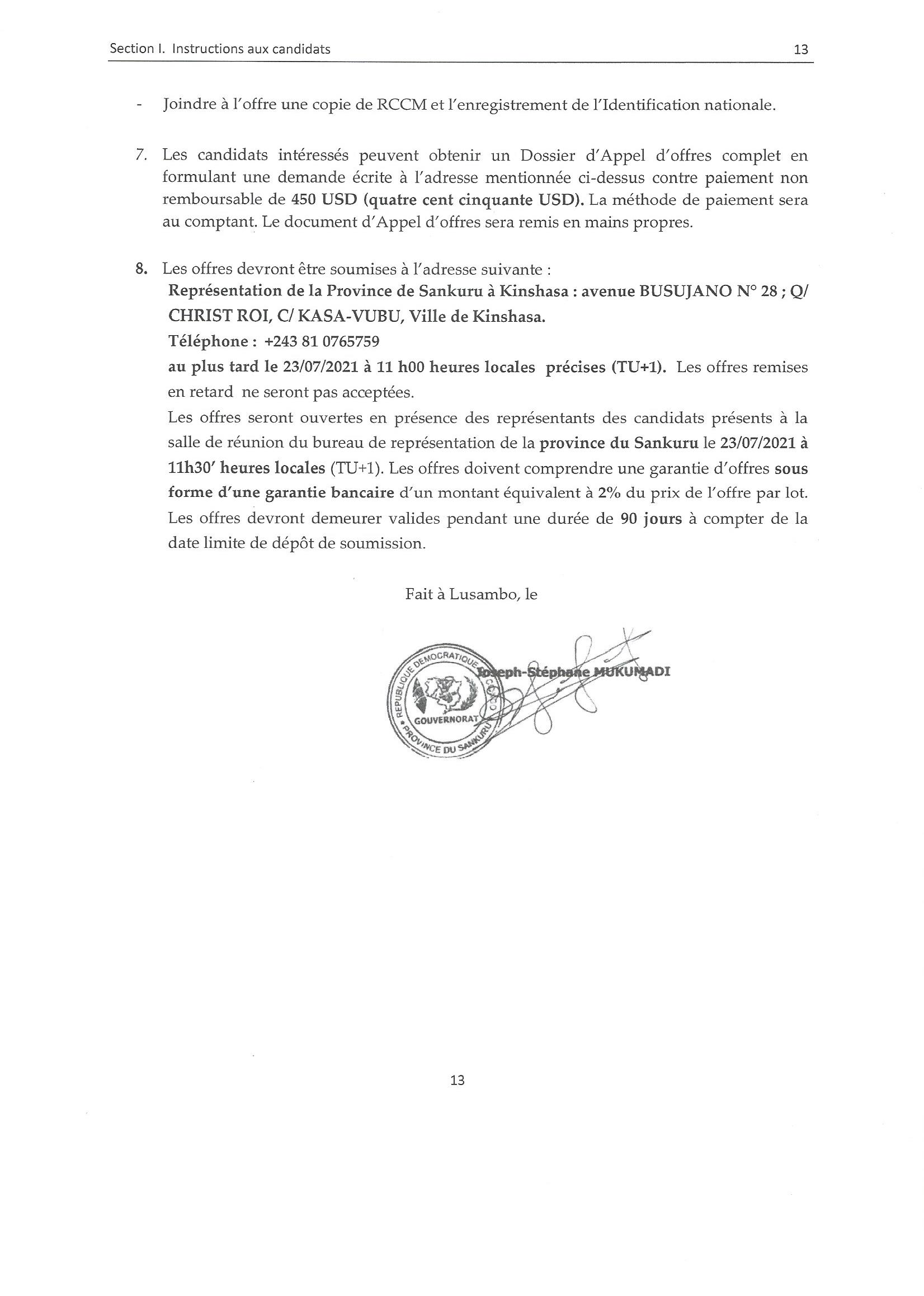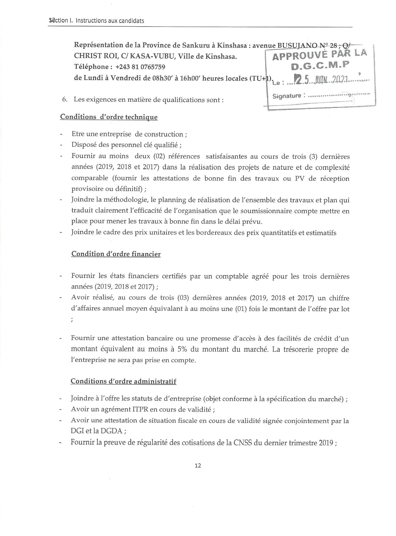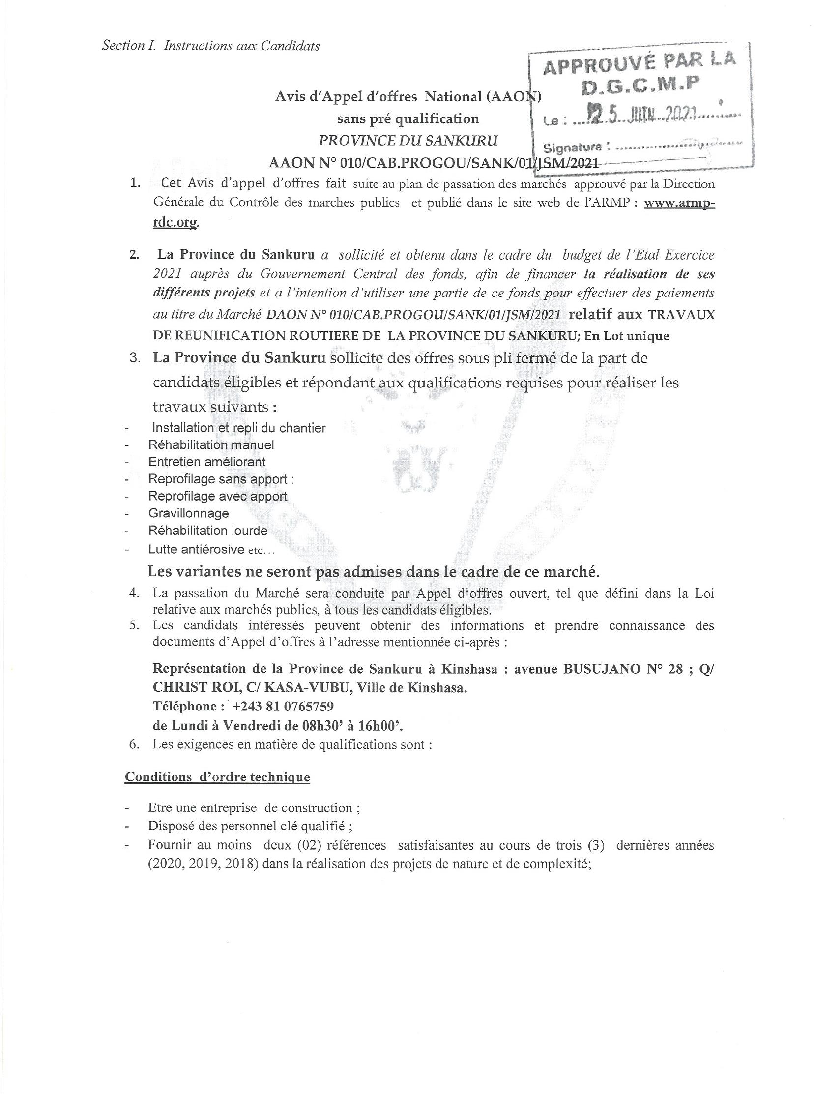 TRAVAUX DE RÉUNIFICATION ROUTIÈRE DE LA PROVINCE DU SANKURU ; EN LOT UNIQUE