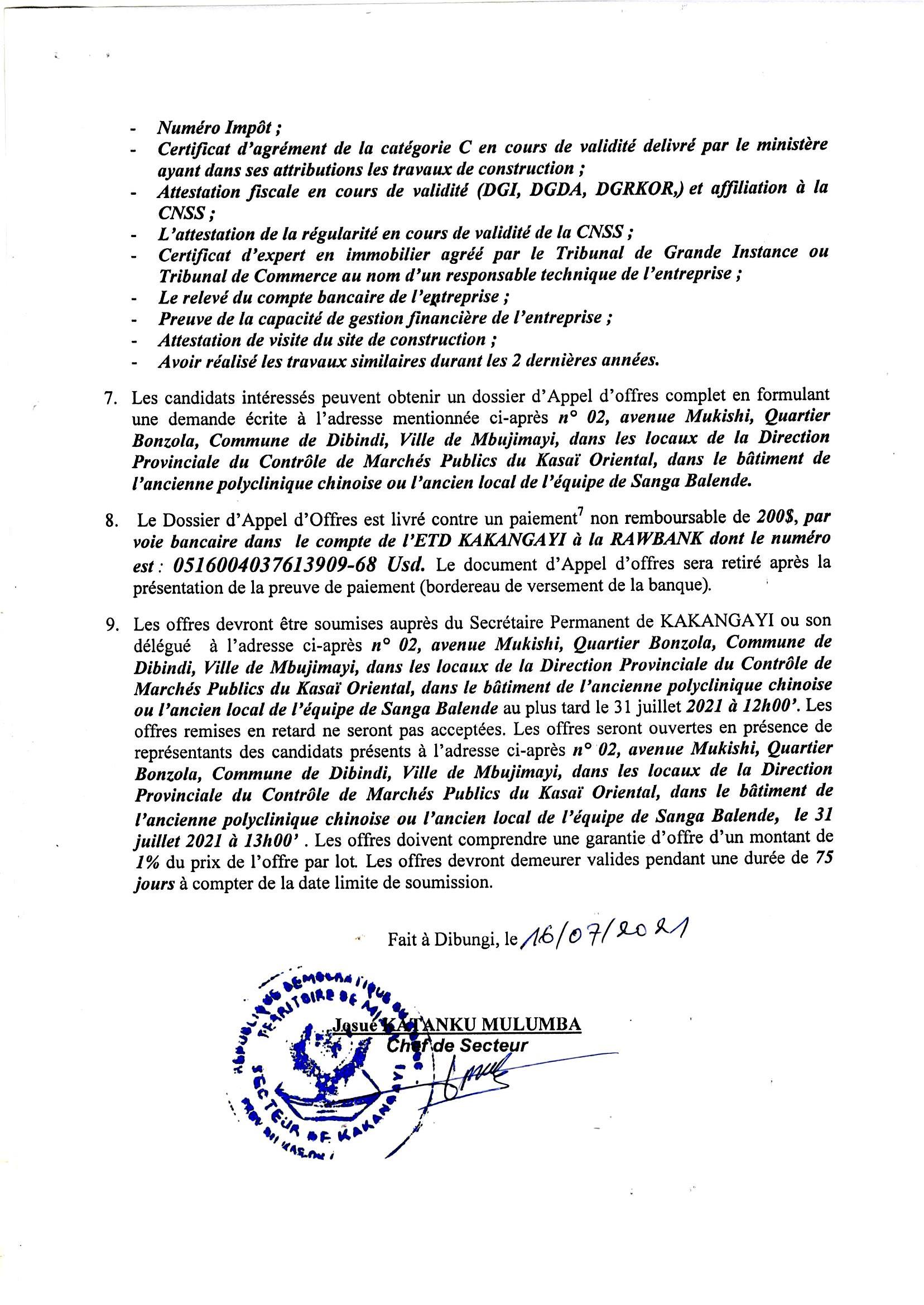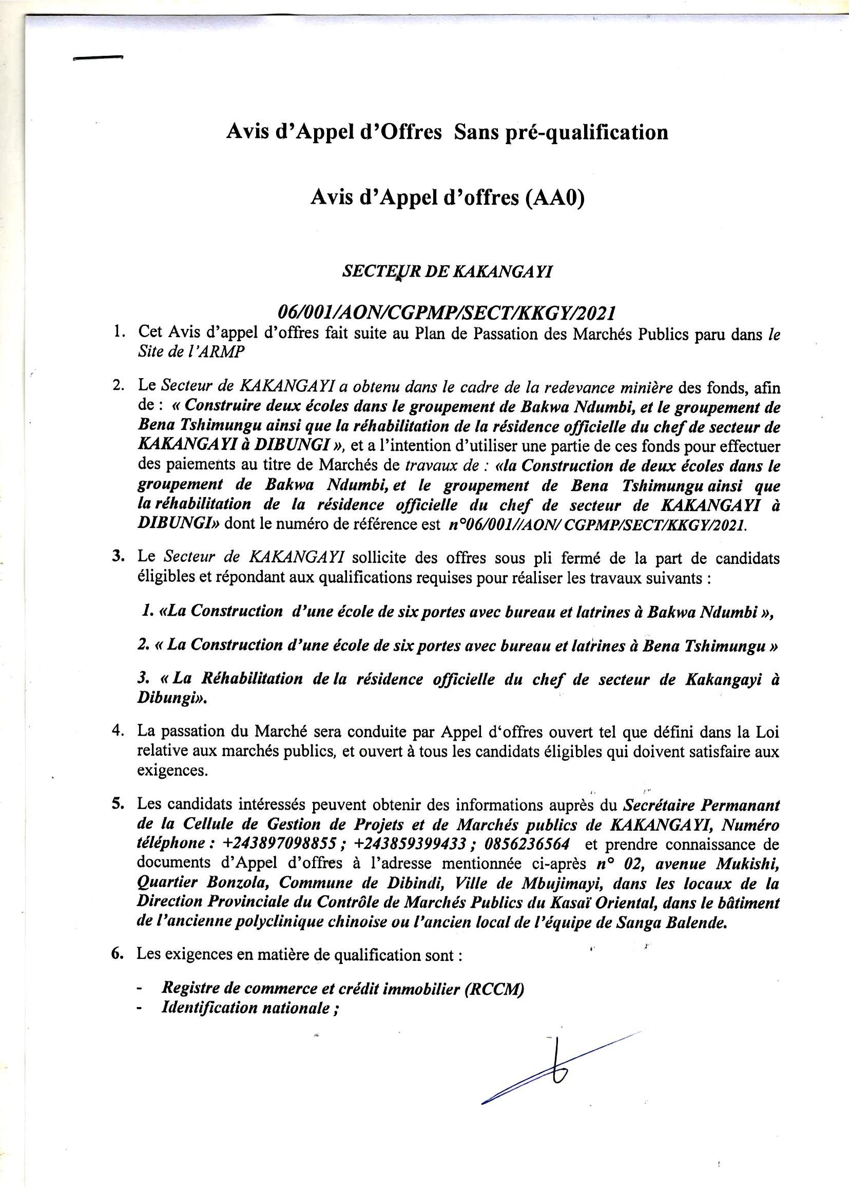 CONSTRUCTION DE DEUX ÉCOLES DANS LE GROUPEMENT BAKWA NDUMBI ET LE REGROUPEMENT BENA TSHIMUNGU AINSI QUE LA RÉHABILITATION DE LA RÉSIDENCE OFFICIELLE DU CHEF DE SECTEUR KAKANGAYI À DIBUNGI.