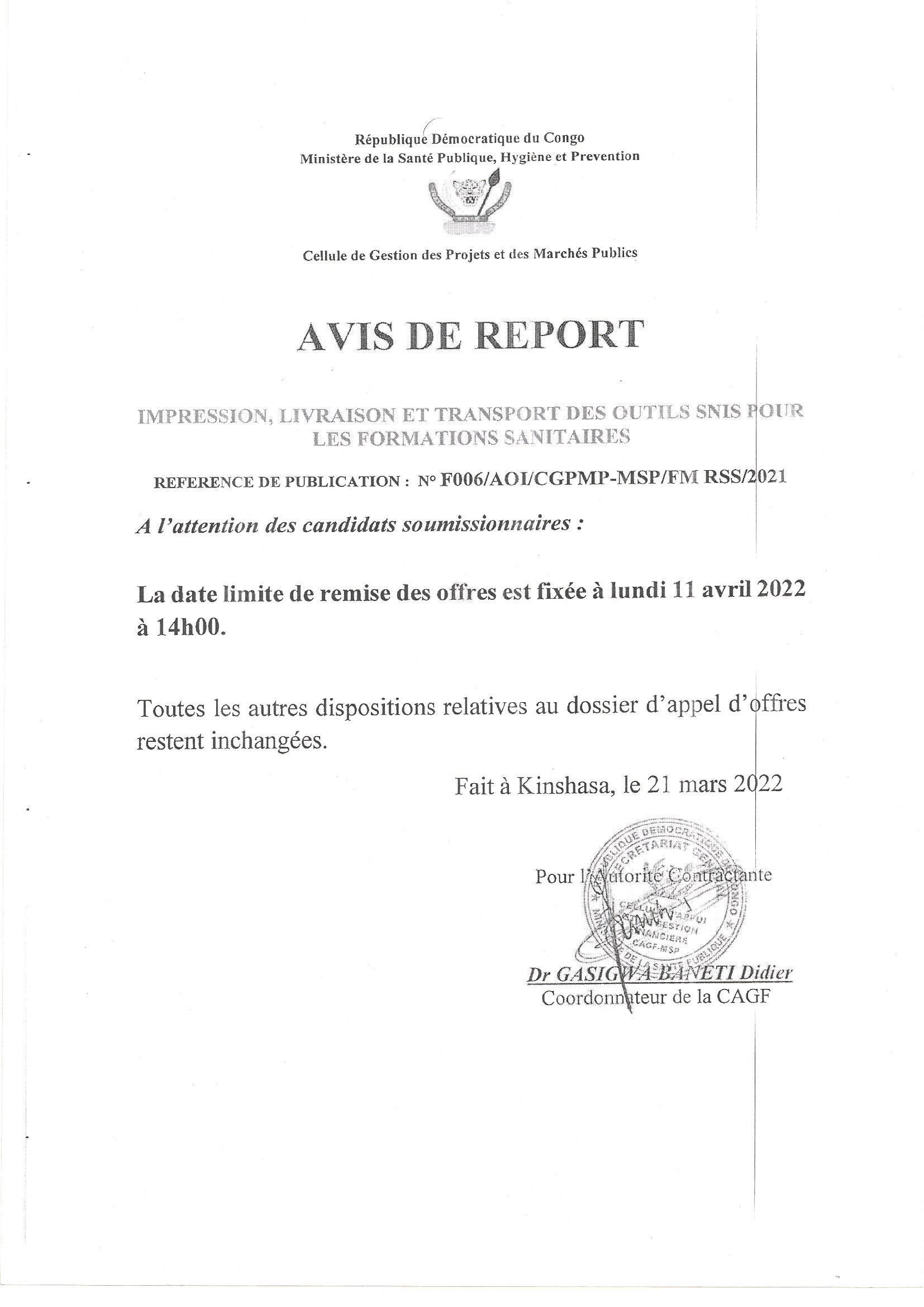 AVIS DE REPORT DU MINISTERE DE LA SANTE PUBLIQUE, HYGIENE ET PREVENTION RELATIF AU MARCHE DE L’IMPRESSION, LIVRAISON ET TRANSPORT DES OUTILS SNIS POUR LES FORMATIONS SANITAIRES.