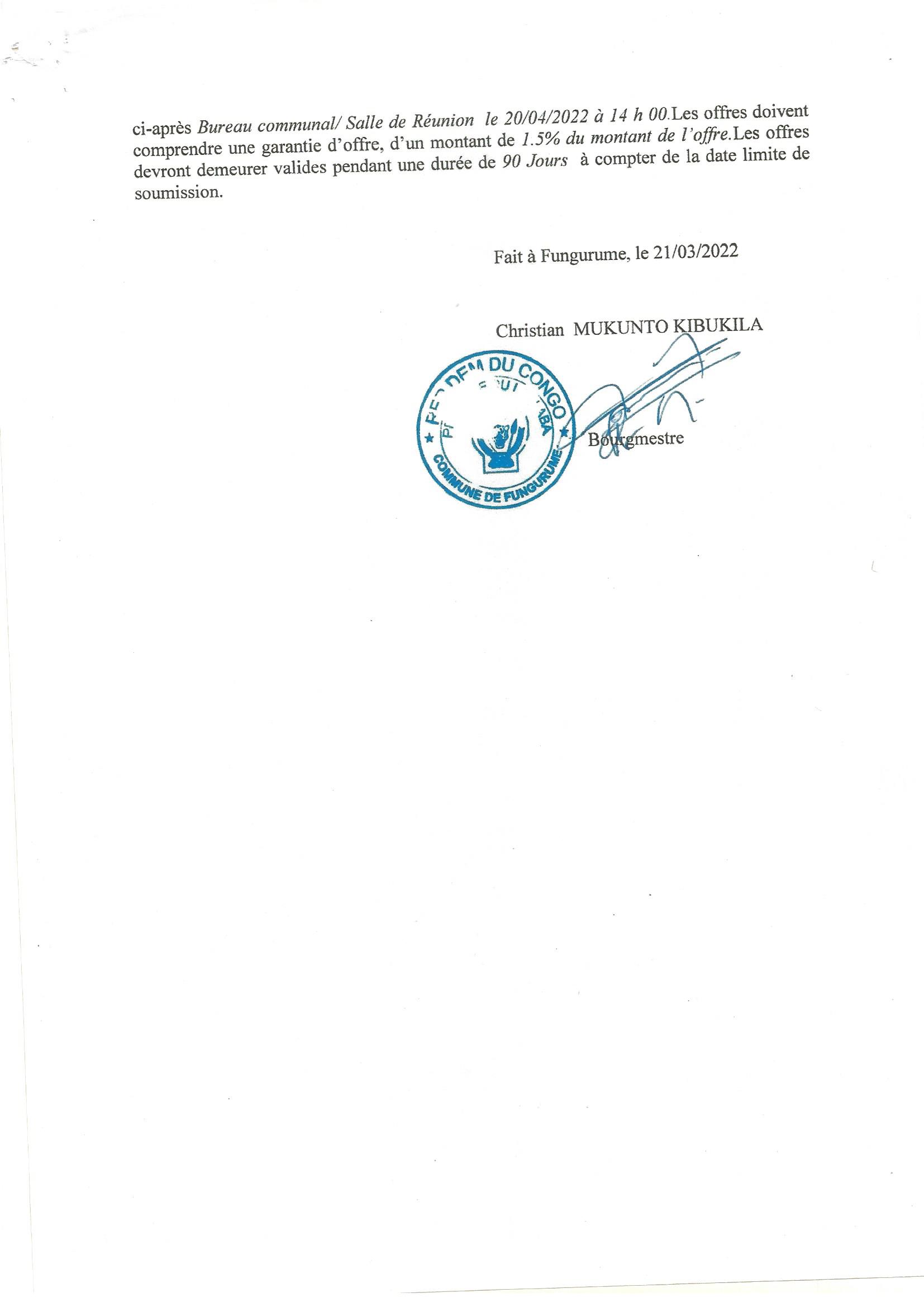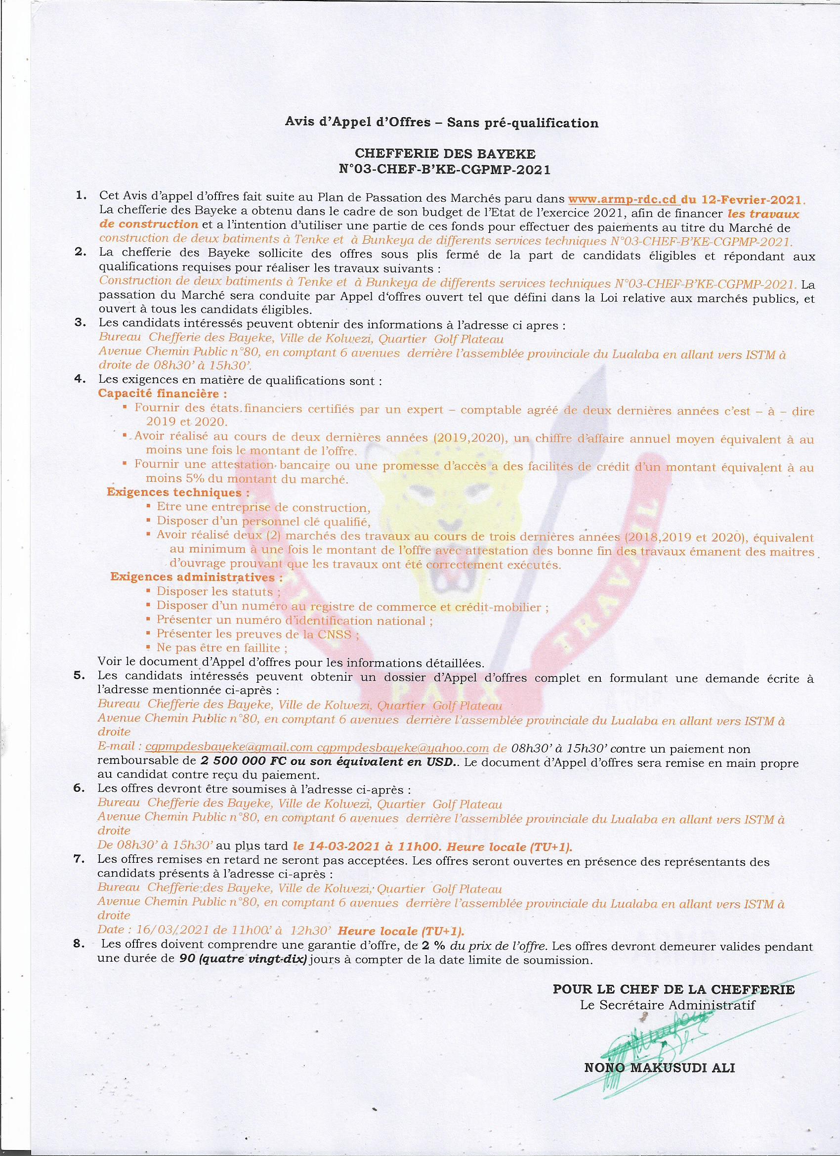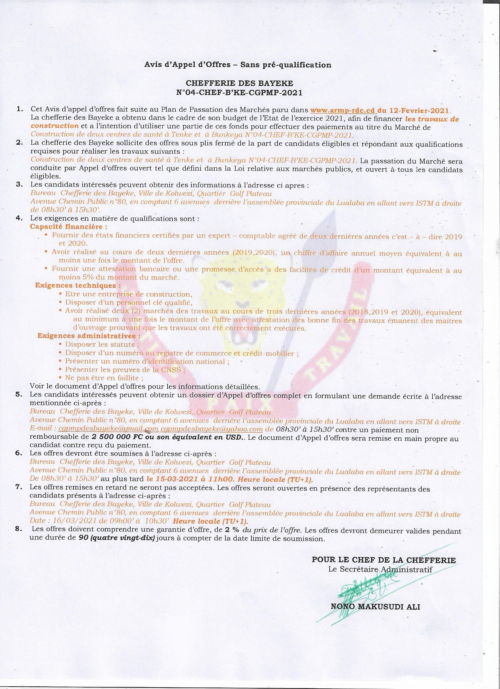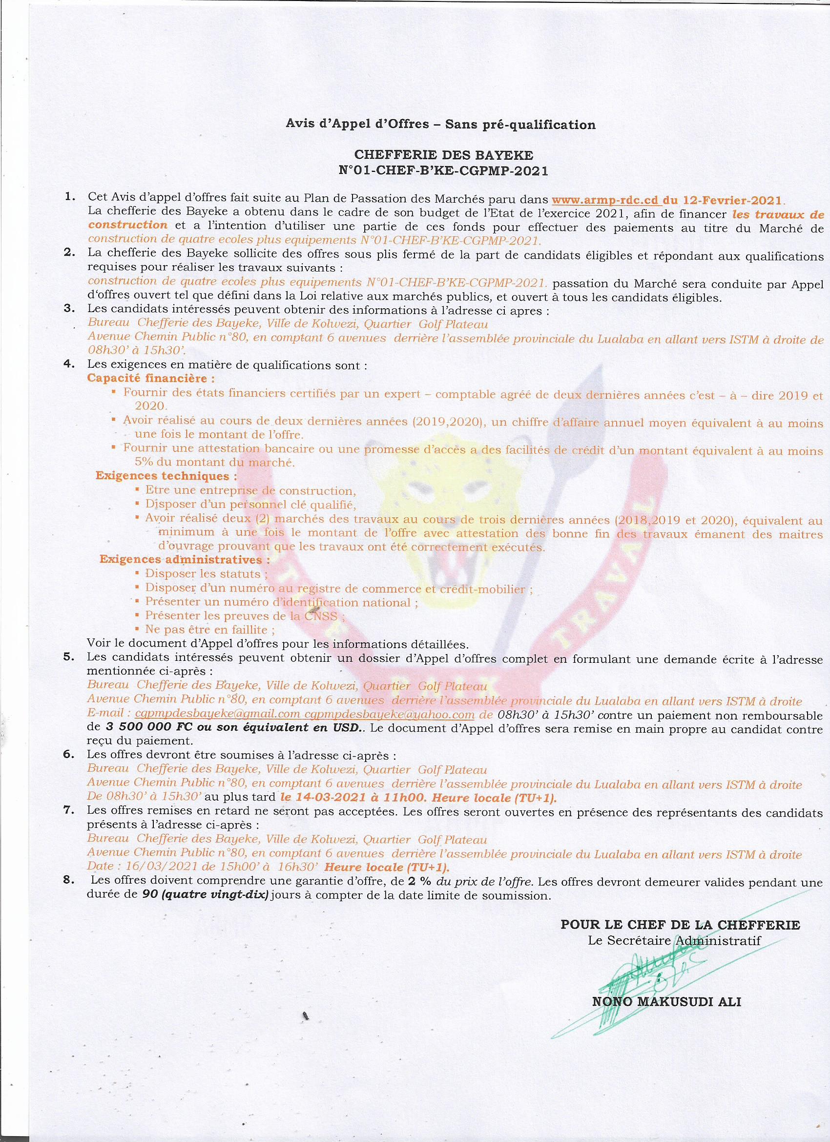 AVIS D’APPEL D’OFFRE SANS PRE-QUALIFICATION POUR LA CONSTRUCTION DE DEUX BATIMENTS A TENKE ET A BUNKEYA DE DIFFERENTS SERVICES TECHNIQUES