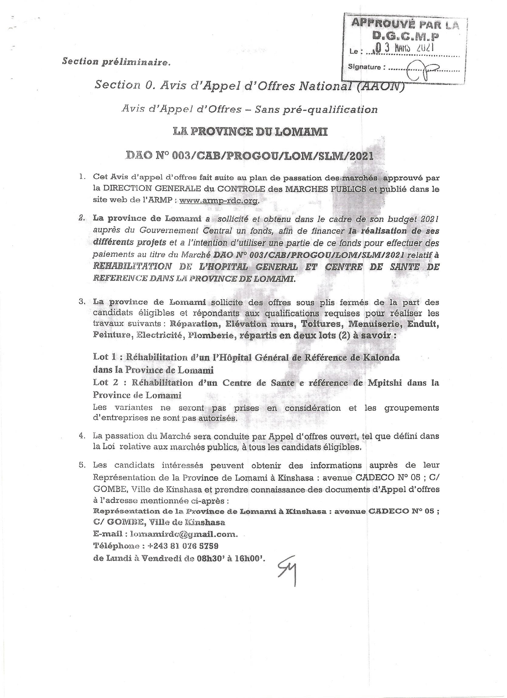 MARCHÉ DE RÉHABILITATION DE L’HÔPITAL GÉNÉRAL ET CENTRE DE SANTE DE REFERENCE DANS LA PROVINCE DE LOMAMI