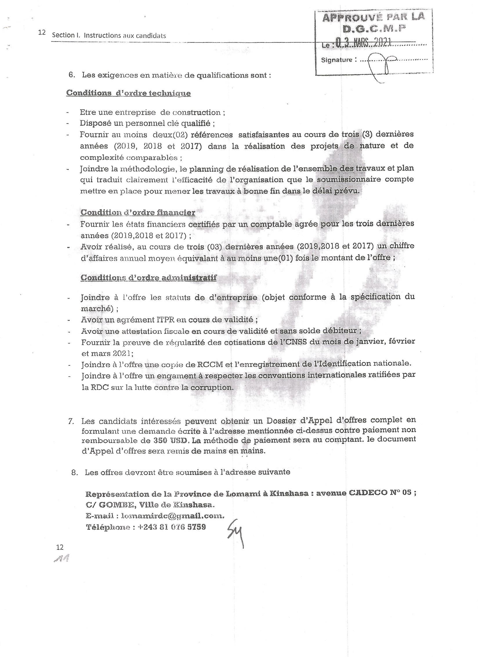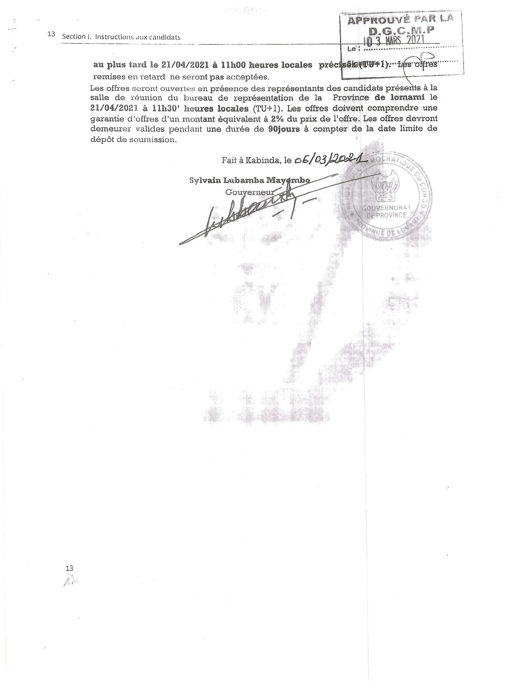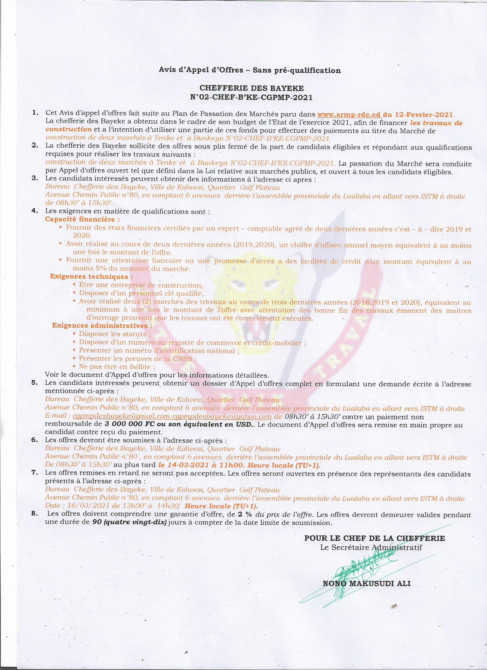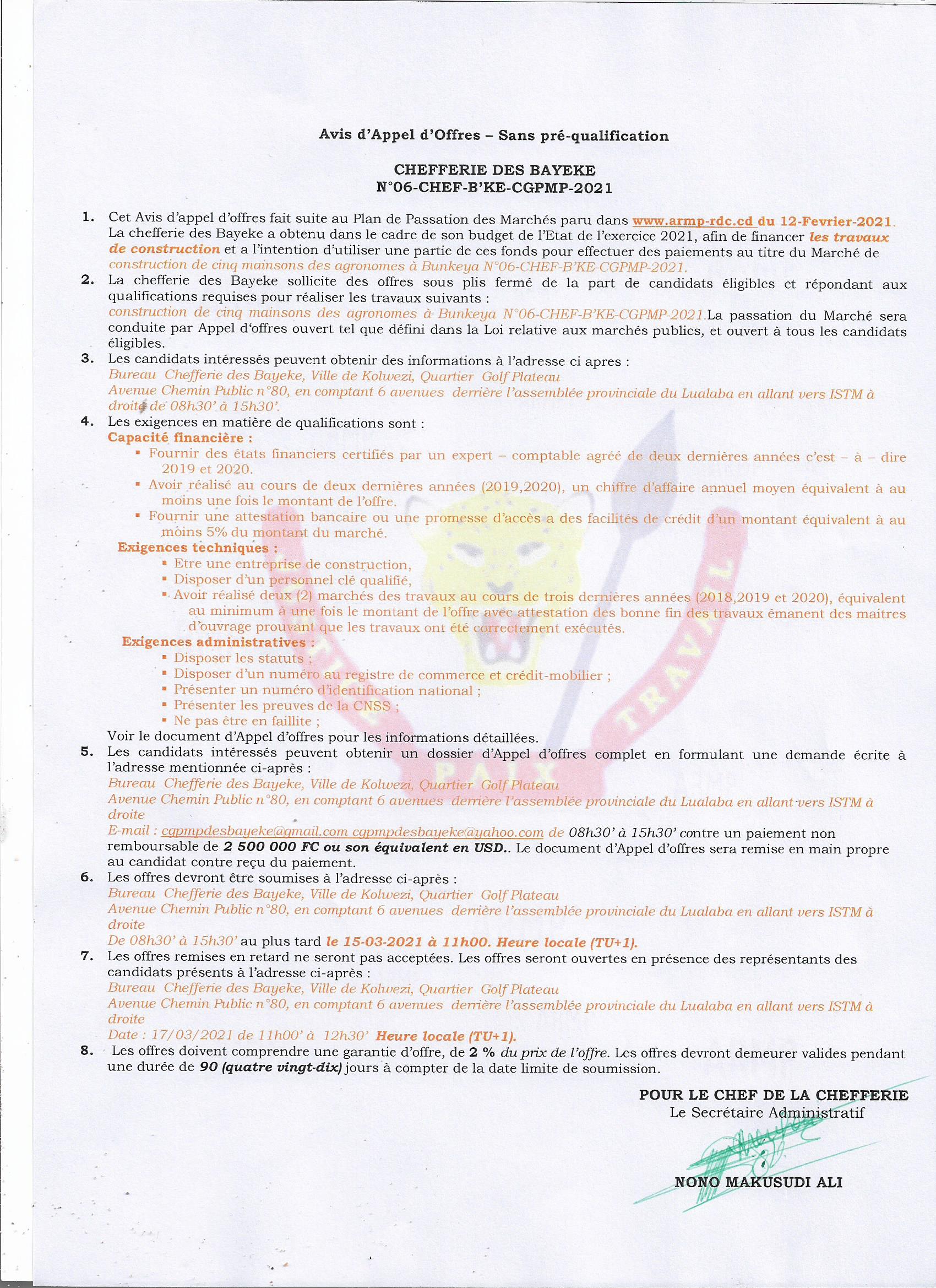 AVIS D’APPEL D’OFFRES DE LA PROVINCE DU LUALABA RELATIF AU MARCHES DES CONSTRUCTION D’UNE MAISON DE PASSAGE SELON LES DETAILS DANS LE DOSSIER D’APPEL D’OFFRES.