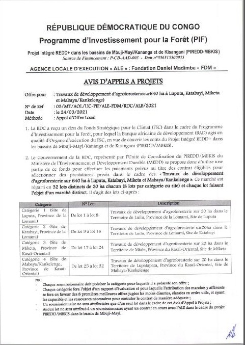 TRAVAUX DE DEVELOPPEMENT D’AGROFORESTERIE SUR 640 HA A LUPUTA, KATABAYI, MIKETA ET MABAYA/KANKELENGE
