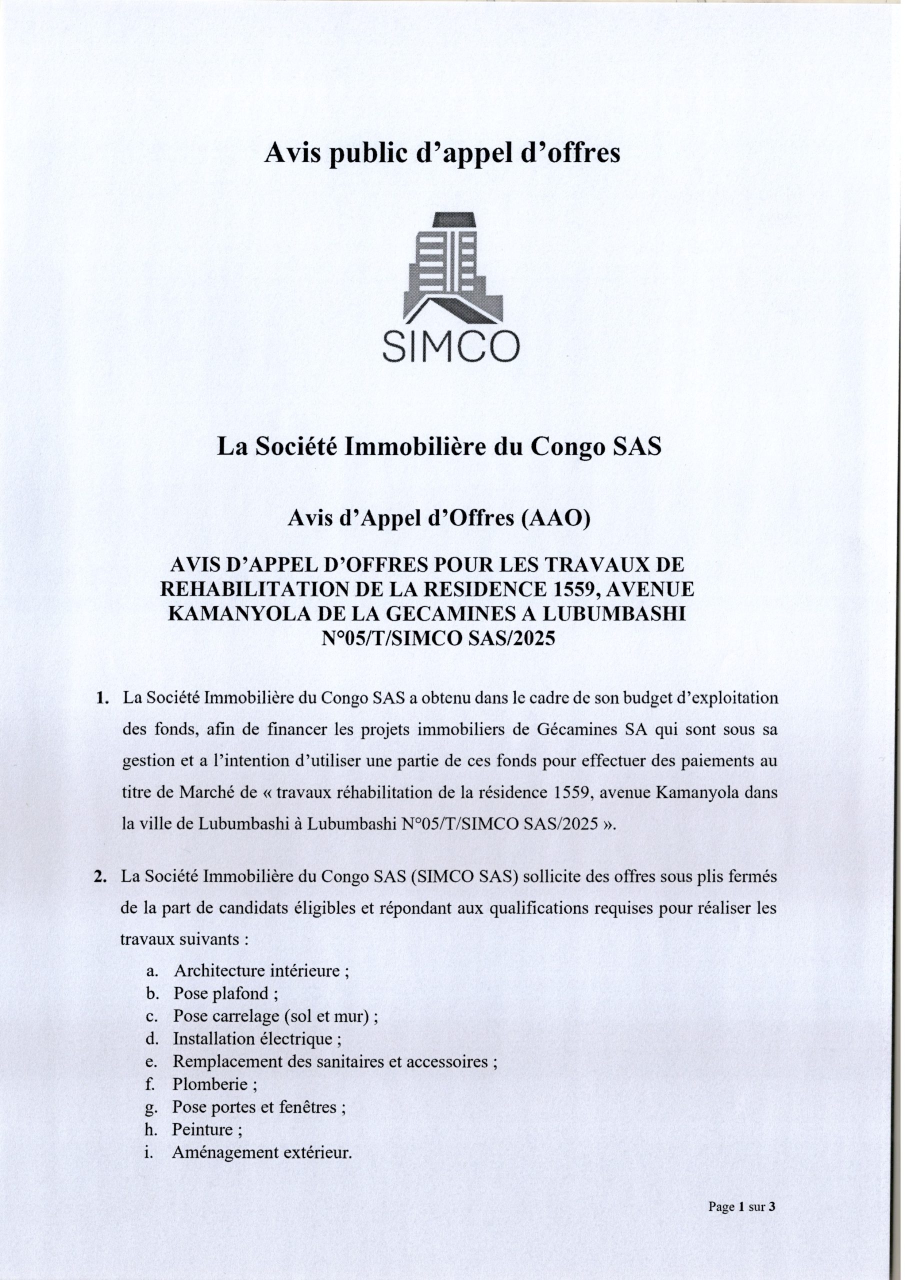 Travaux de Réhabilitation de la résidence 1559, avenue Kamanyola de la GECAMINES Lubumbashi