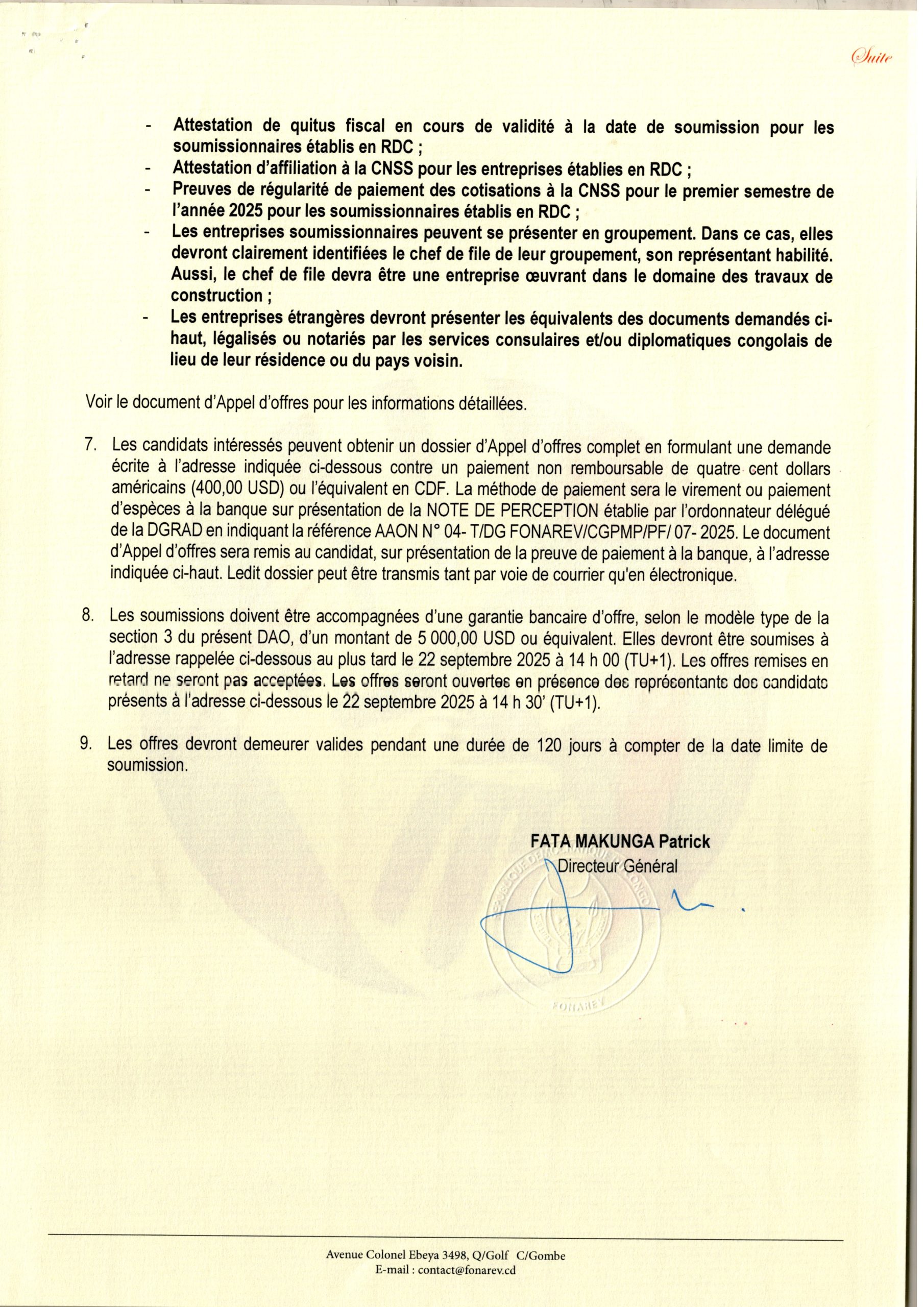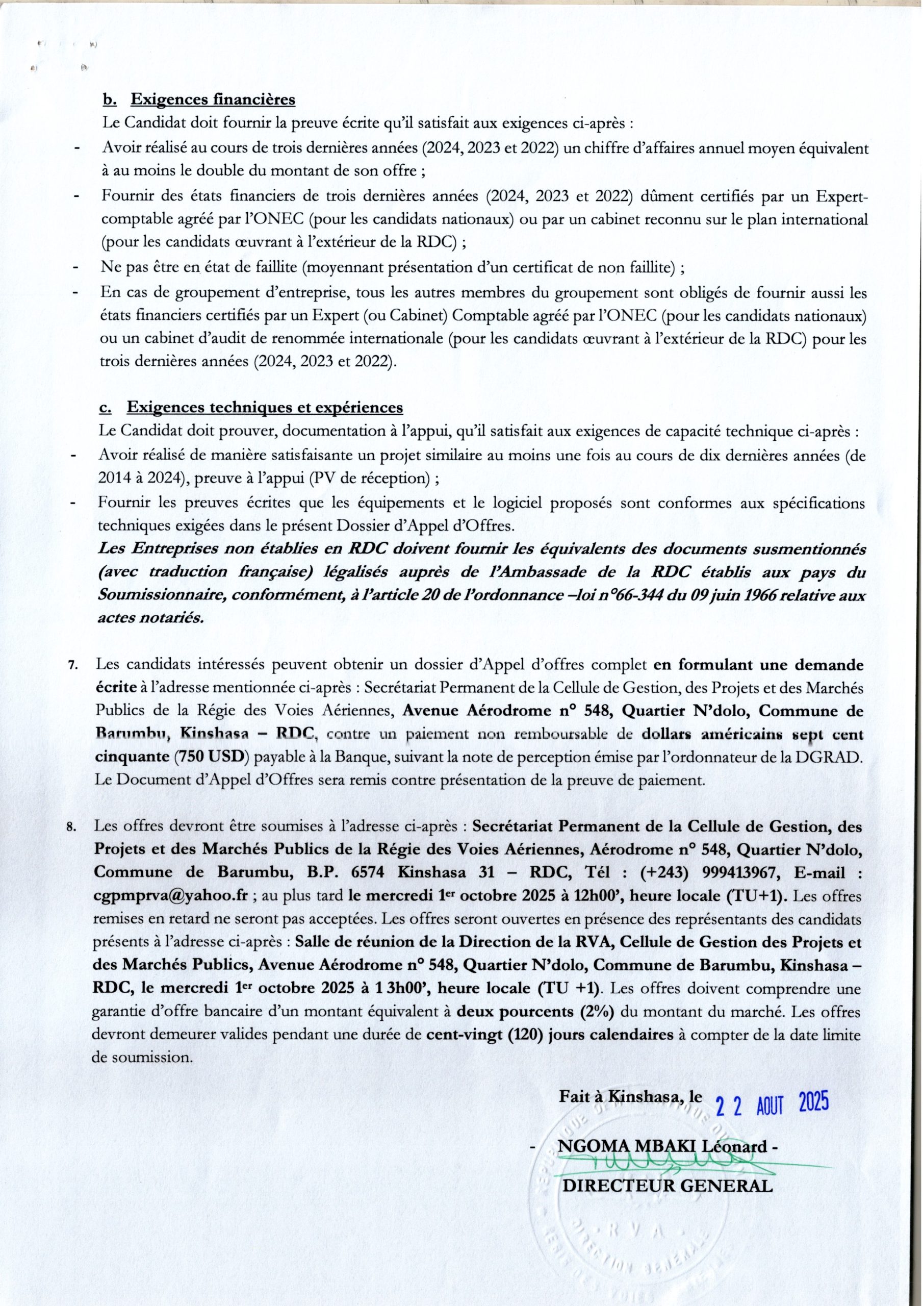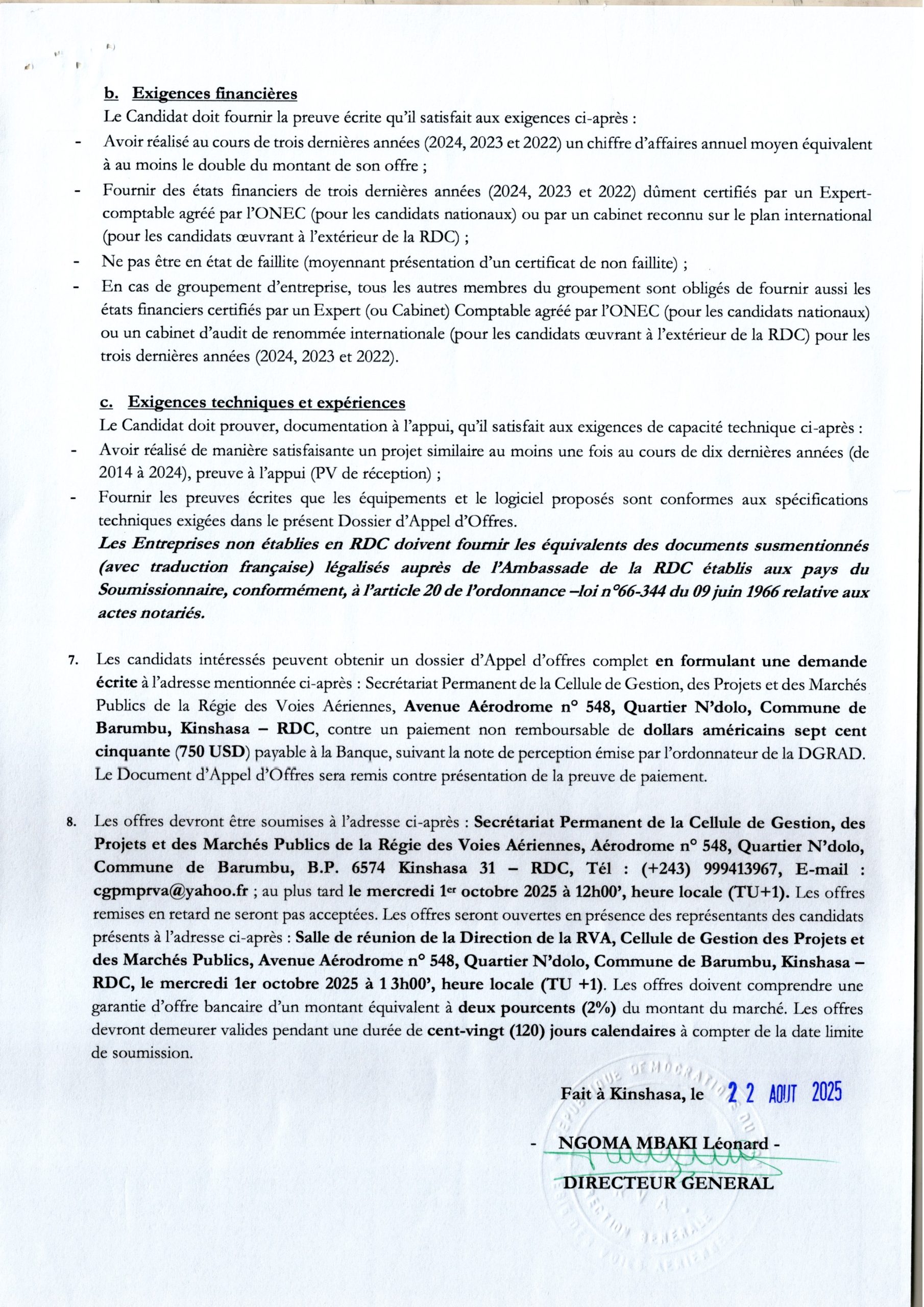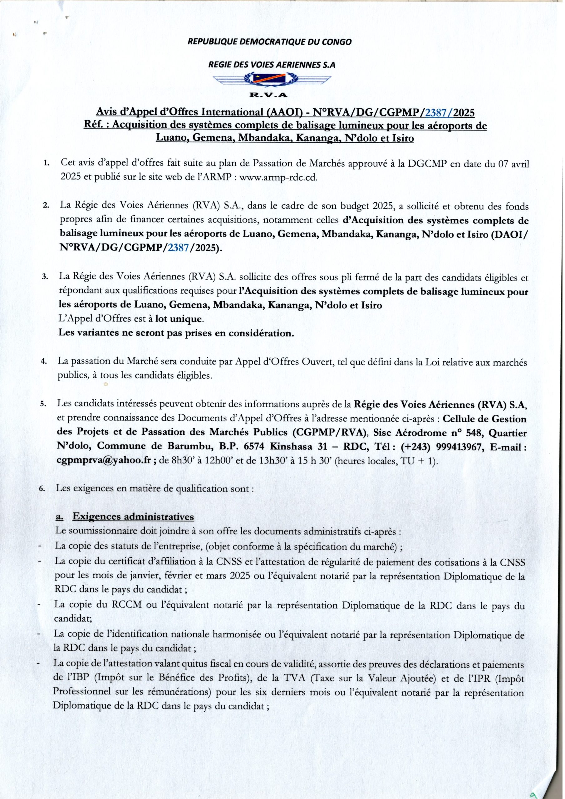 Acquisition des sydtèmes complets de balisage lumineux pour les aéroports de Luano, Gemena, Mbandaka, Kananga, N’dolo et Isiro.