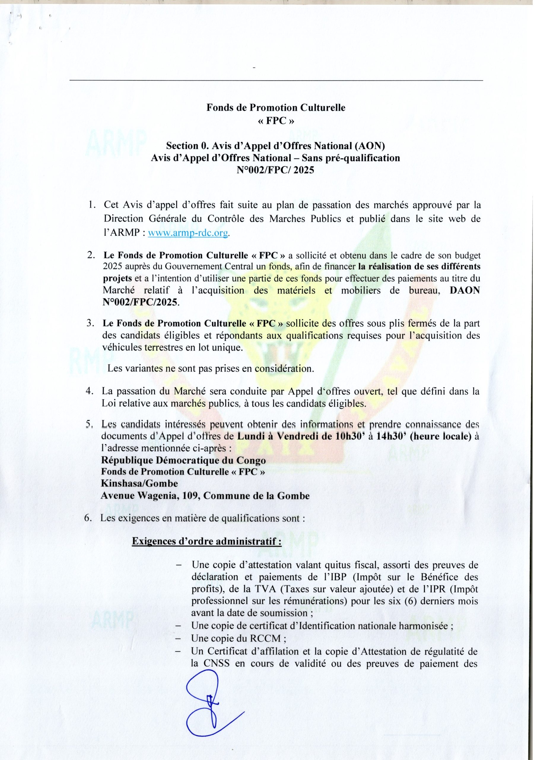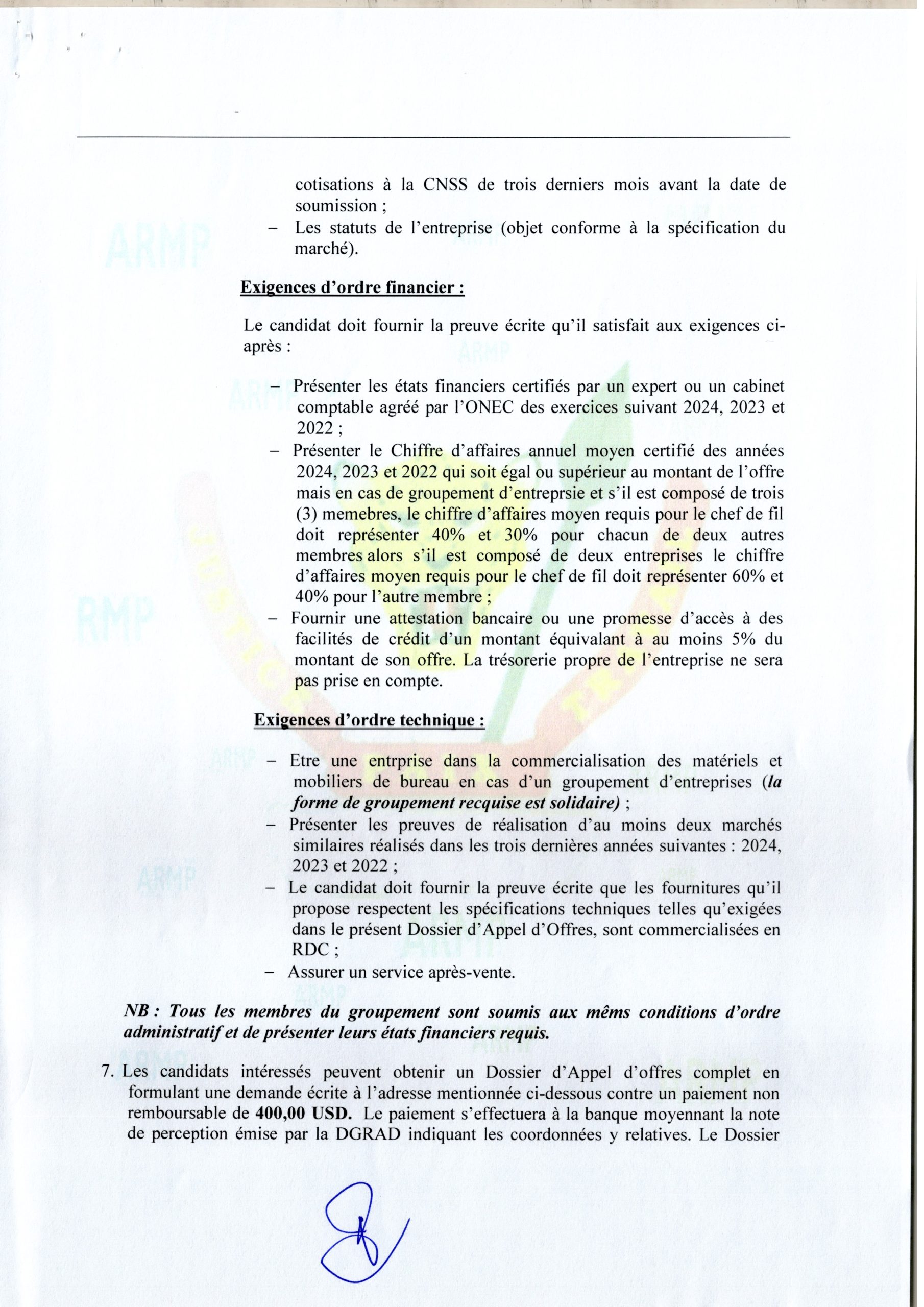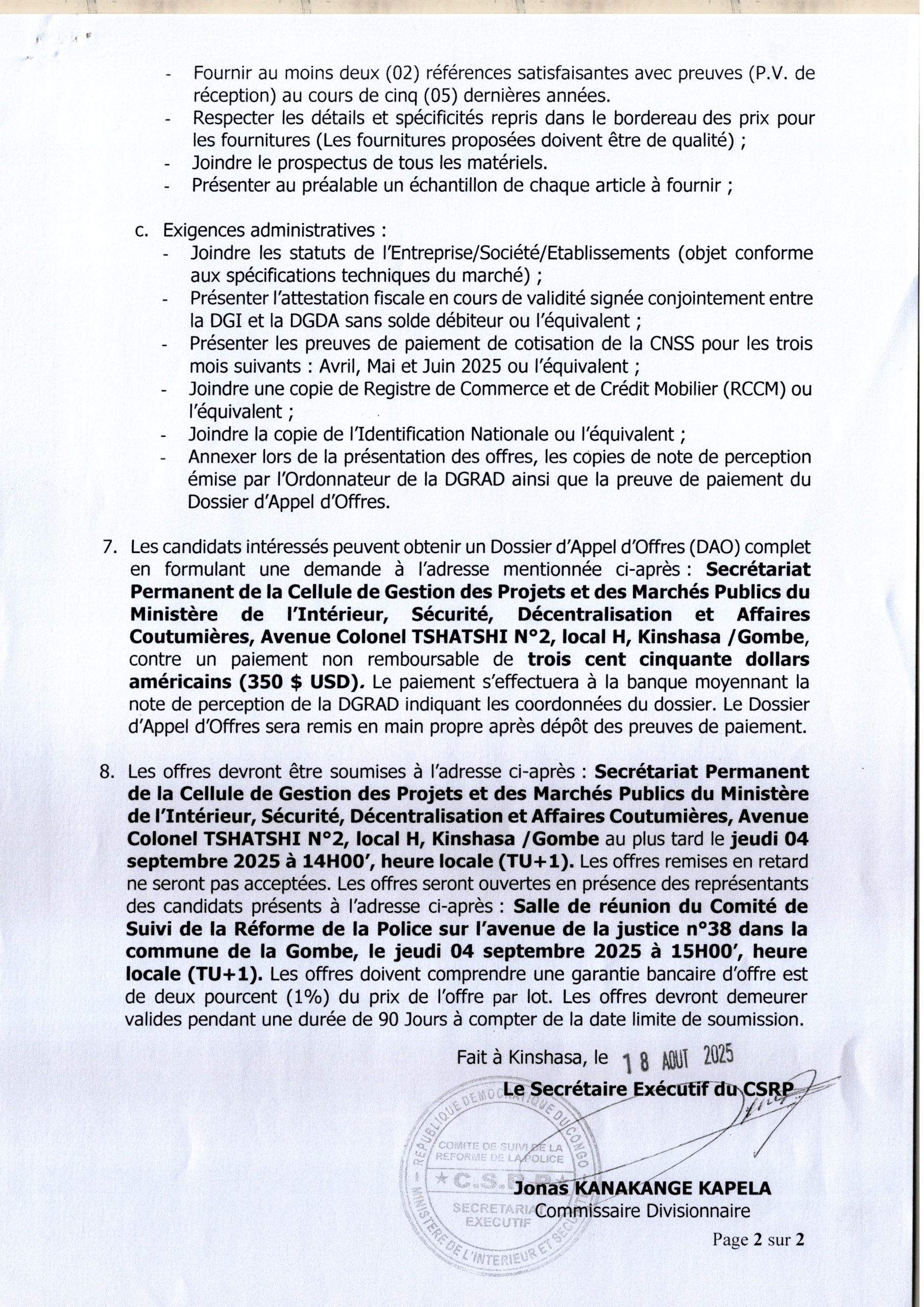 Acquisition des fournitures et petits matériels de bureaux au profit du Commité de Suivi de la Réforme de la Police.