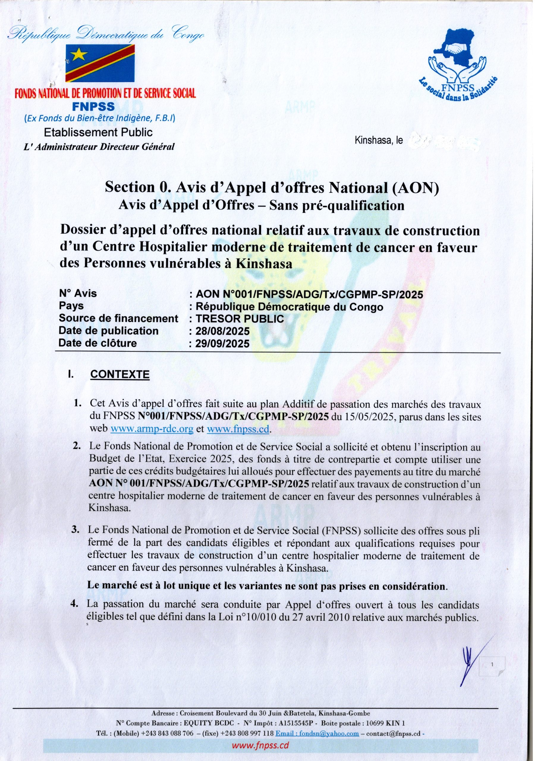Travaux de construction d’un Centre Hospitalier moderne de traitement de cancer en faveur des personnes vulnérables à Kinshasa.