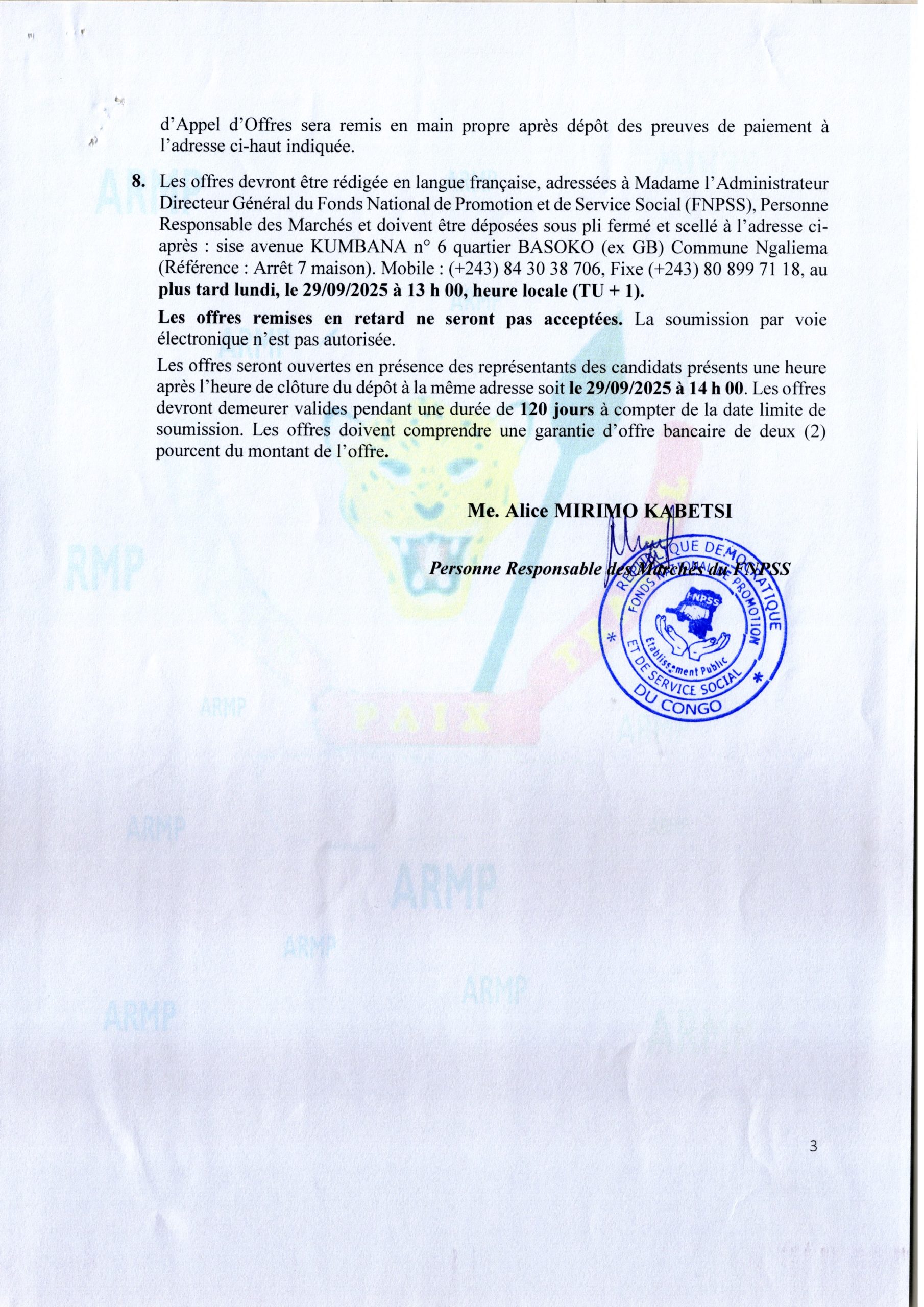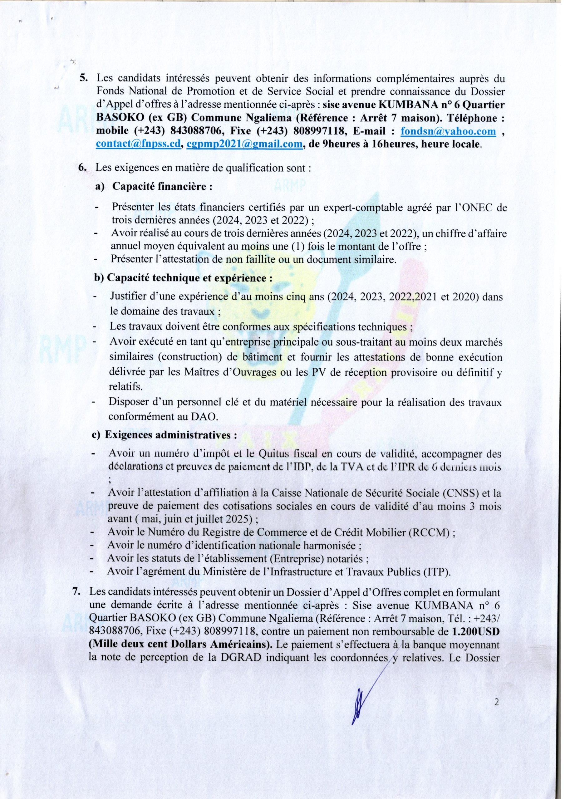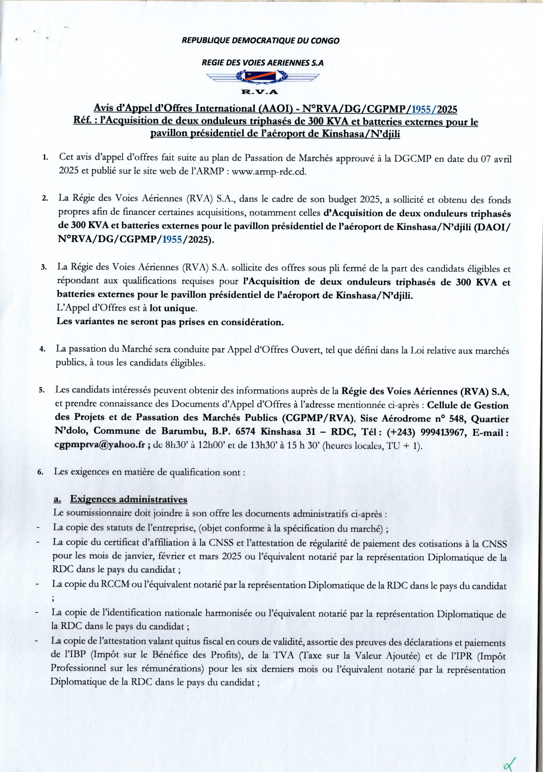 Acquisition de deux onduleurs triphasés de 300KVA et batteries externes pour la pavillon présidentiel de l’aéroport de Kinshasa/N’djili.