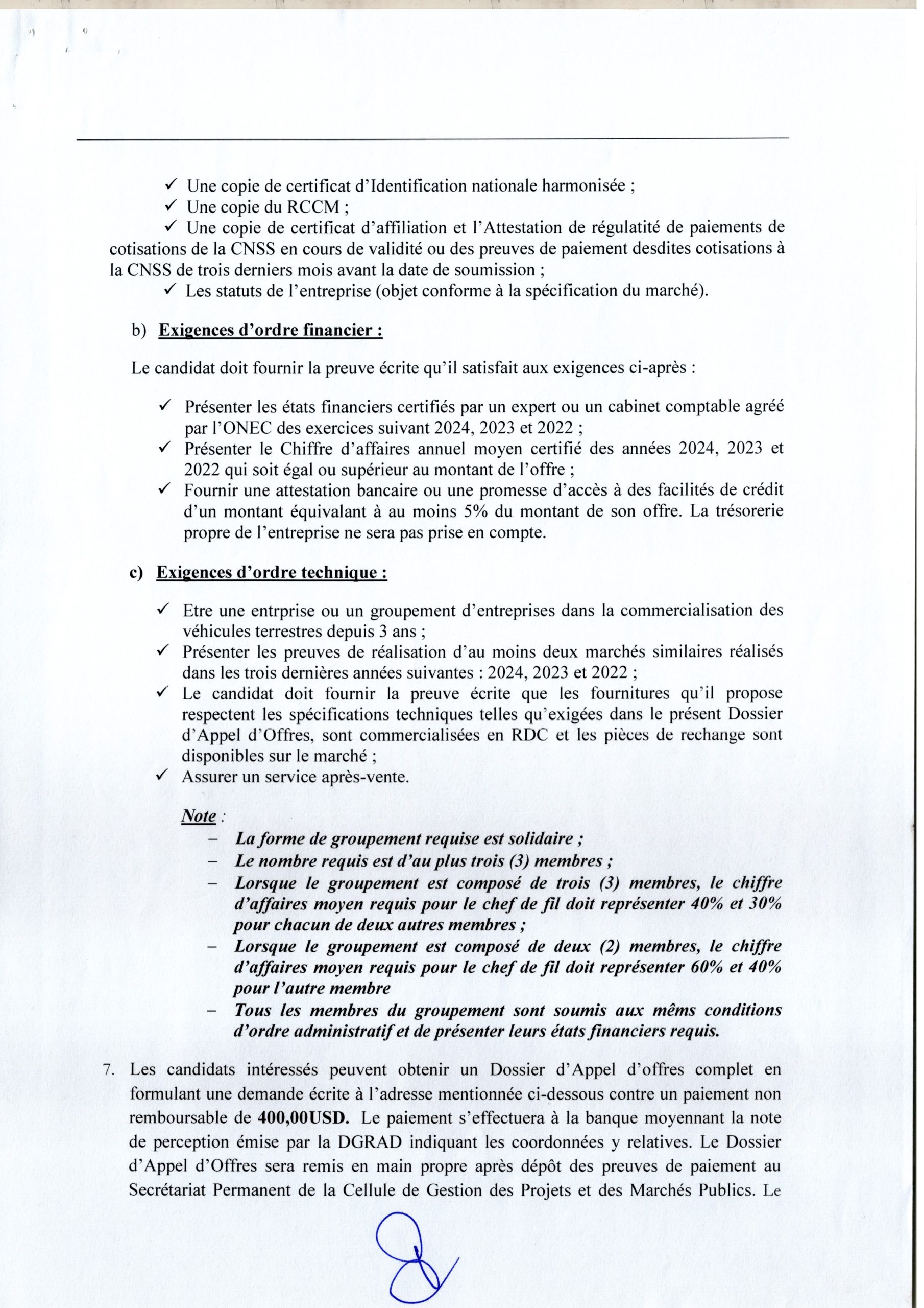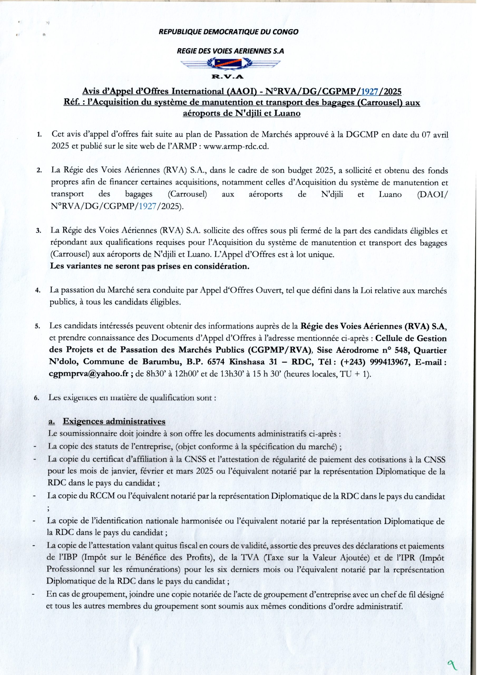 Acquisition du système de manutention et transport des bagages (Caroussel) aux aéroports de N’djili et Luano.