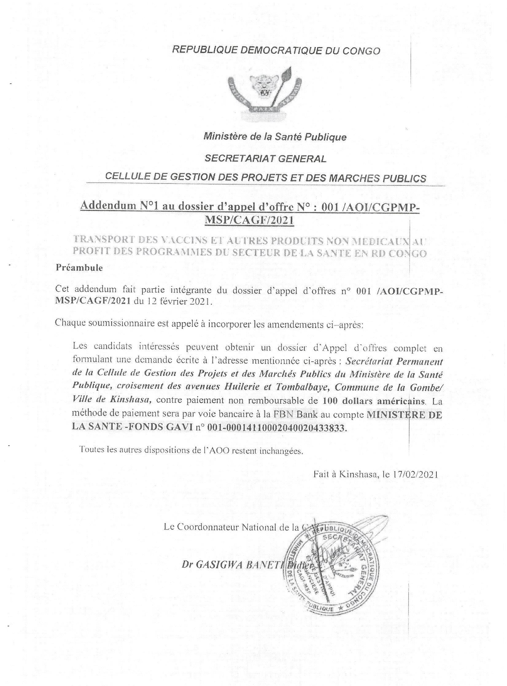 Addendum N°1 au dossier d’appel d’offre N° : 001/AOI/CGPMP-MSP/CAGF/2021