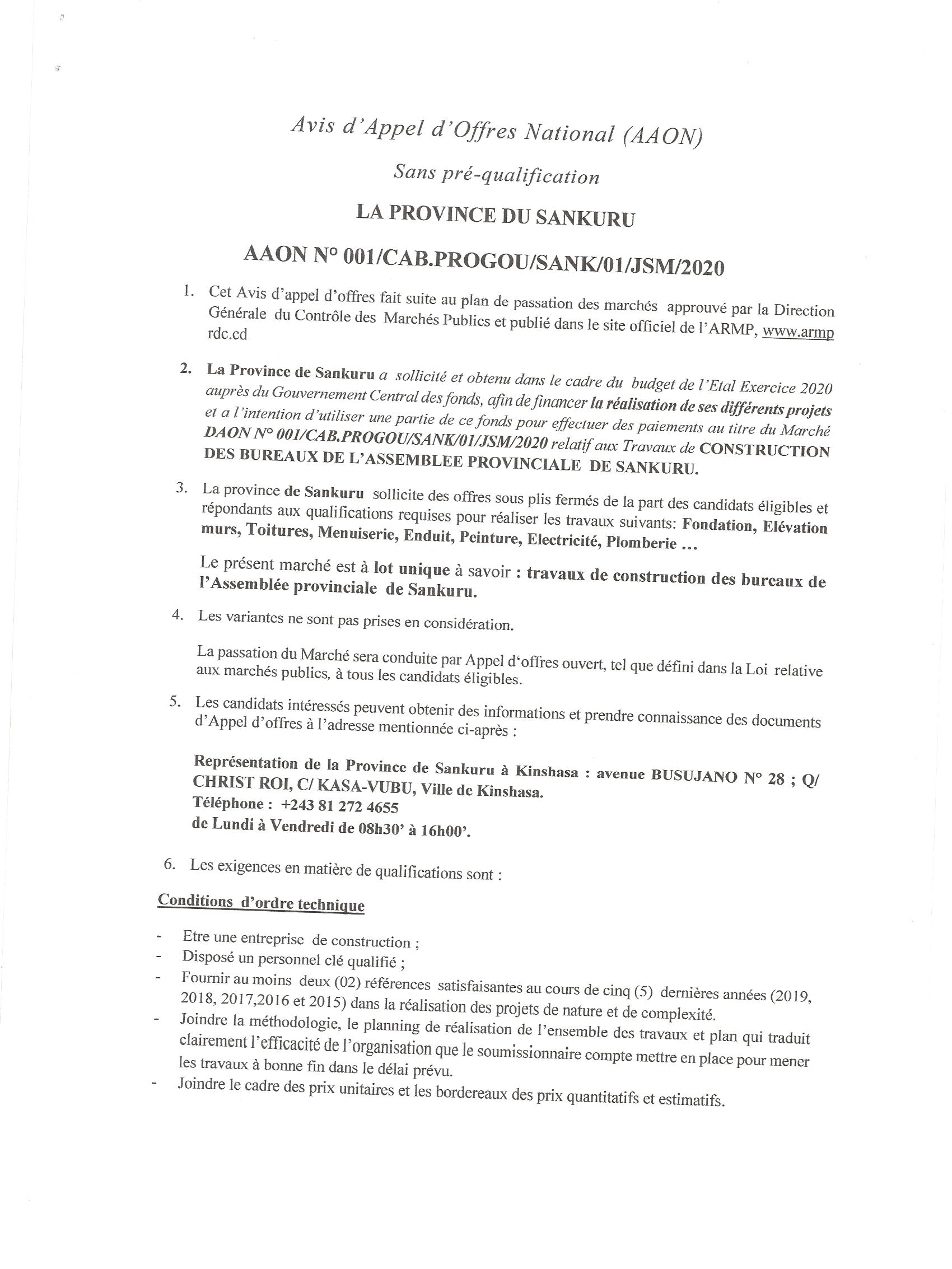 AVIS D’APPEL D’OFFRE SANS PRÉ-QUALIFICATION DU MARCHÉ RELATIVE AUX TRAVAUX DE CONSTRUCTION DES BUREAUX DE L’ASSEMBLÉE PROVINCIALE DE SANKURU.