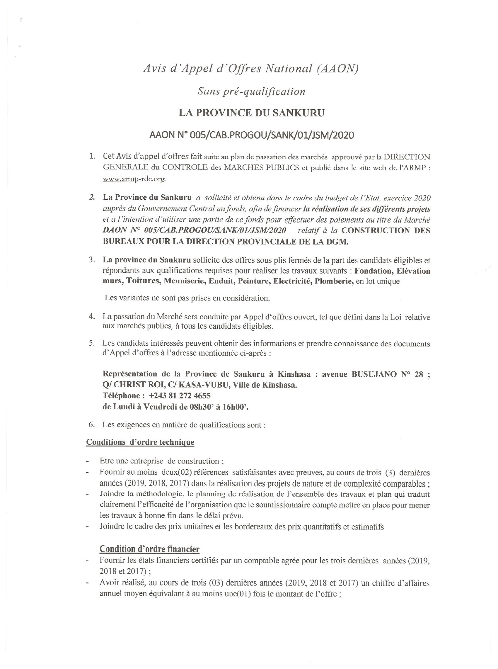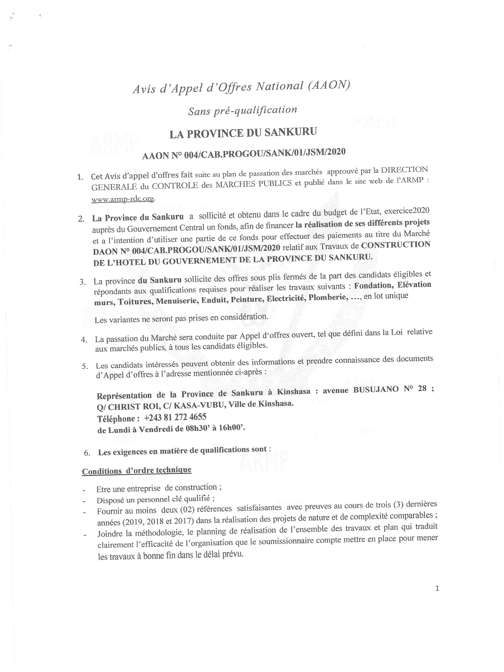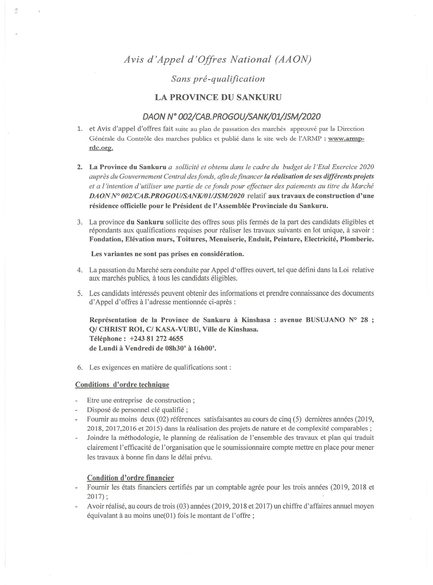 AVIS D’APPEL D’OFFRE SANS PRÉ-QUALIFICATION DU MARCHÉ RELATIF AUX TRAVAUX DE CONSTRUCTION D’UNE RÉSIDENCE OFFICIELLE POUR LE PRÉSIDENT DE L’ASSEMBLÉE PROVINCIALE DU SANKURU.