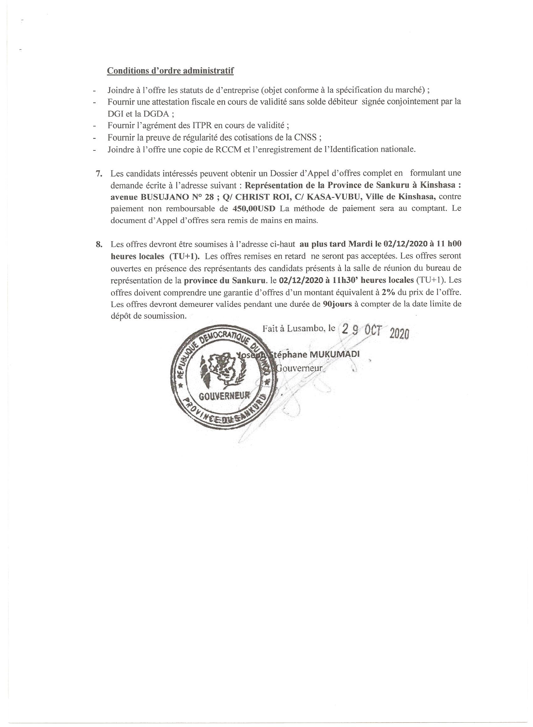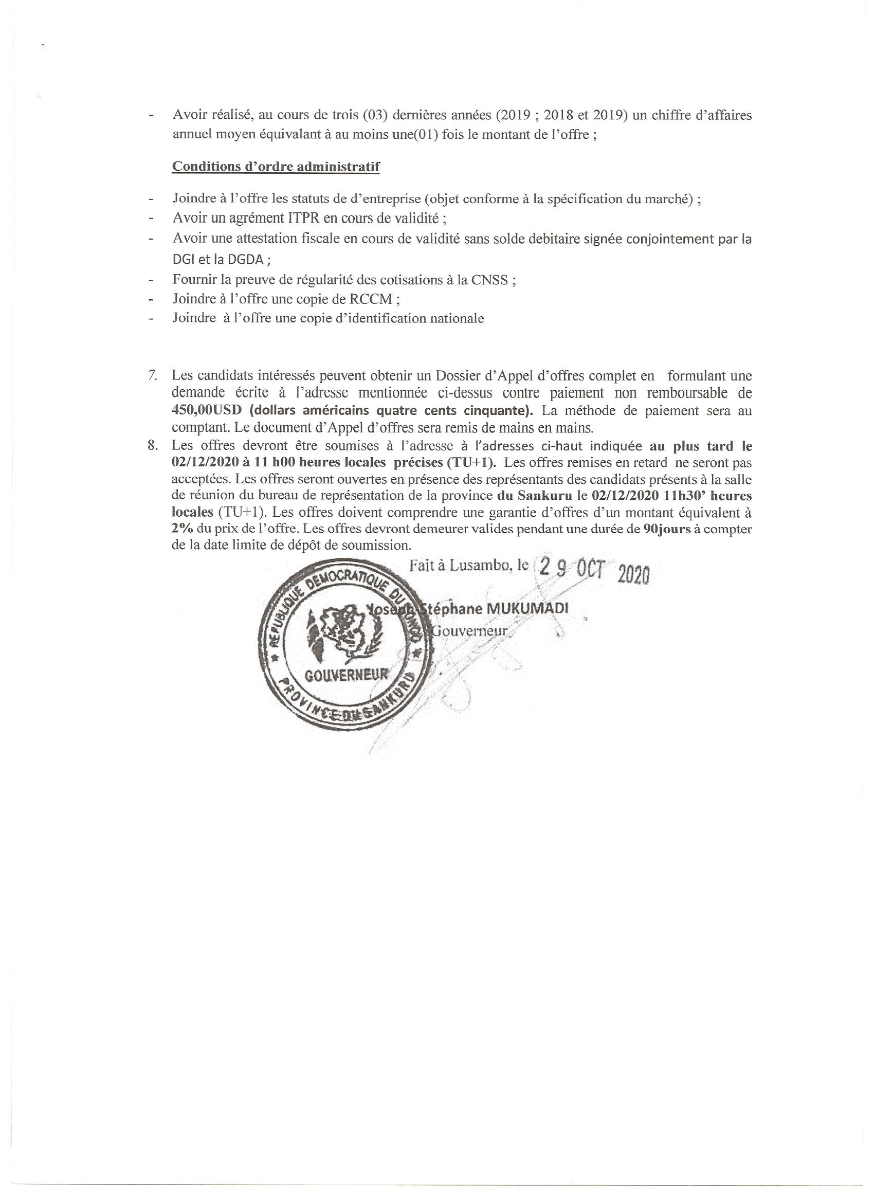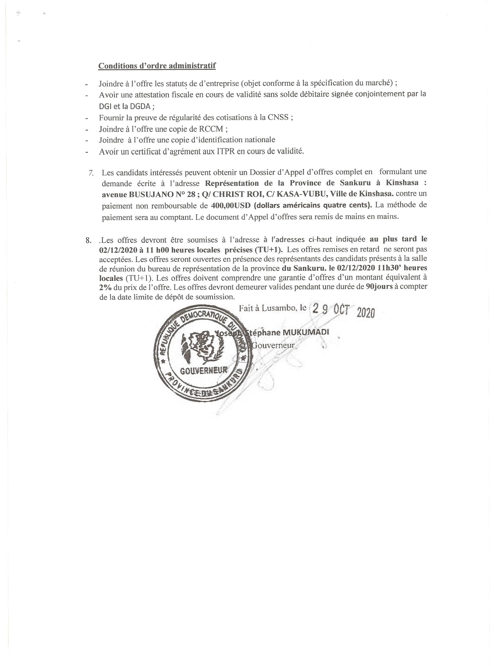 AVIS D’APPEL D’OFFRE SANS PRÉ-QUALIFICATION DU MARCHÉ RELATIF À LA CONSTRUCTION D’UNE RÉSIDENCE OFFICIELLE POUR LE GOUVERNEUR DE LA PROVINCE DU SANKURU.