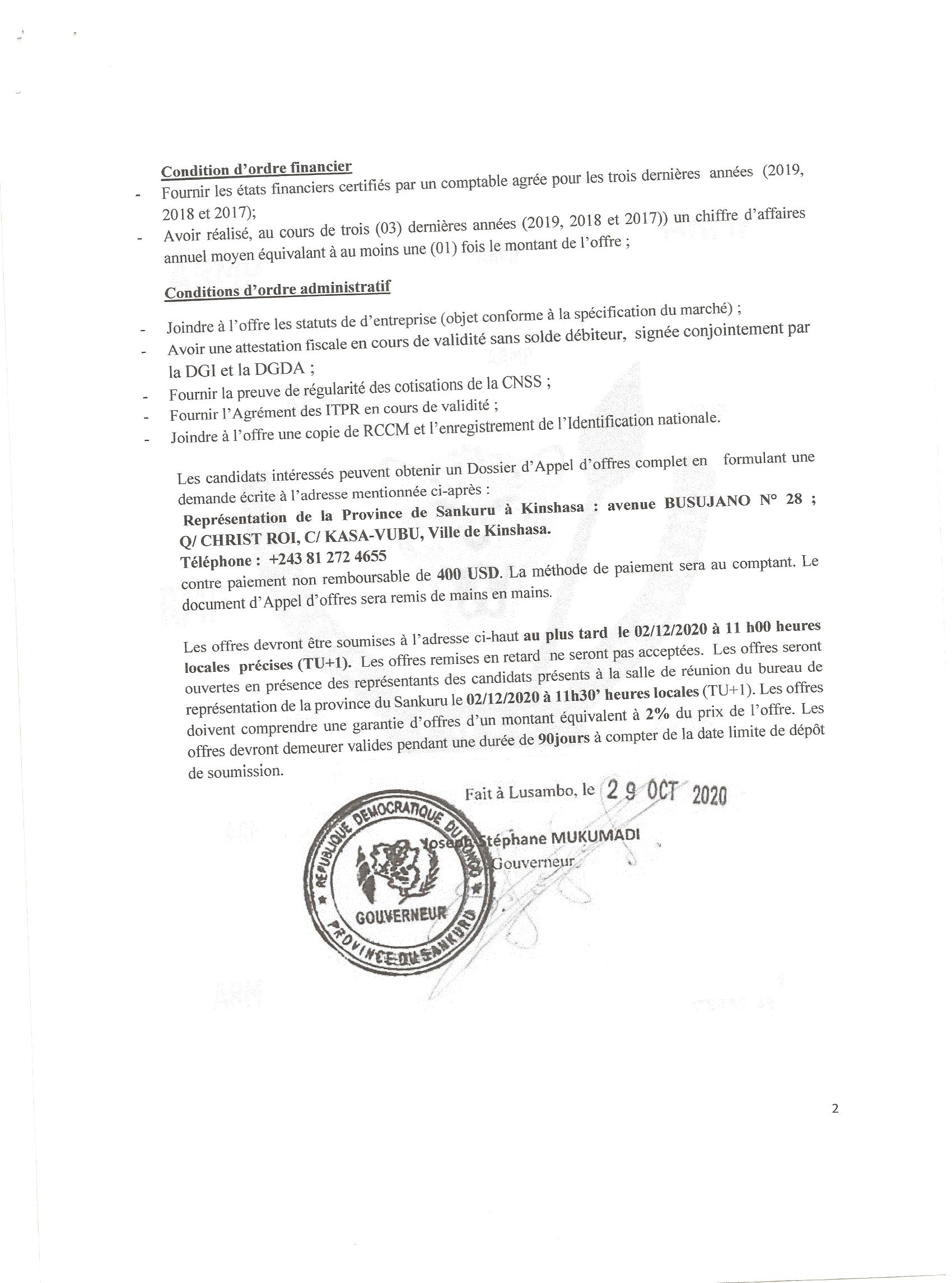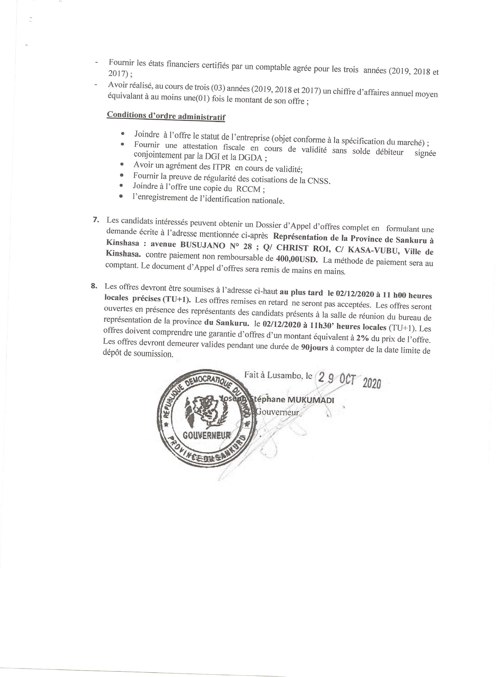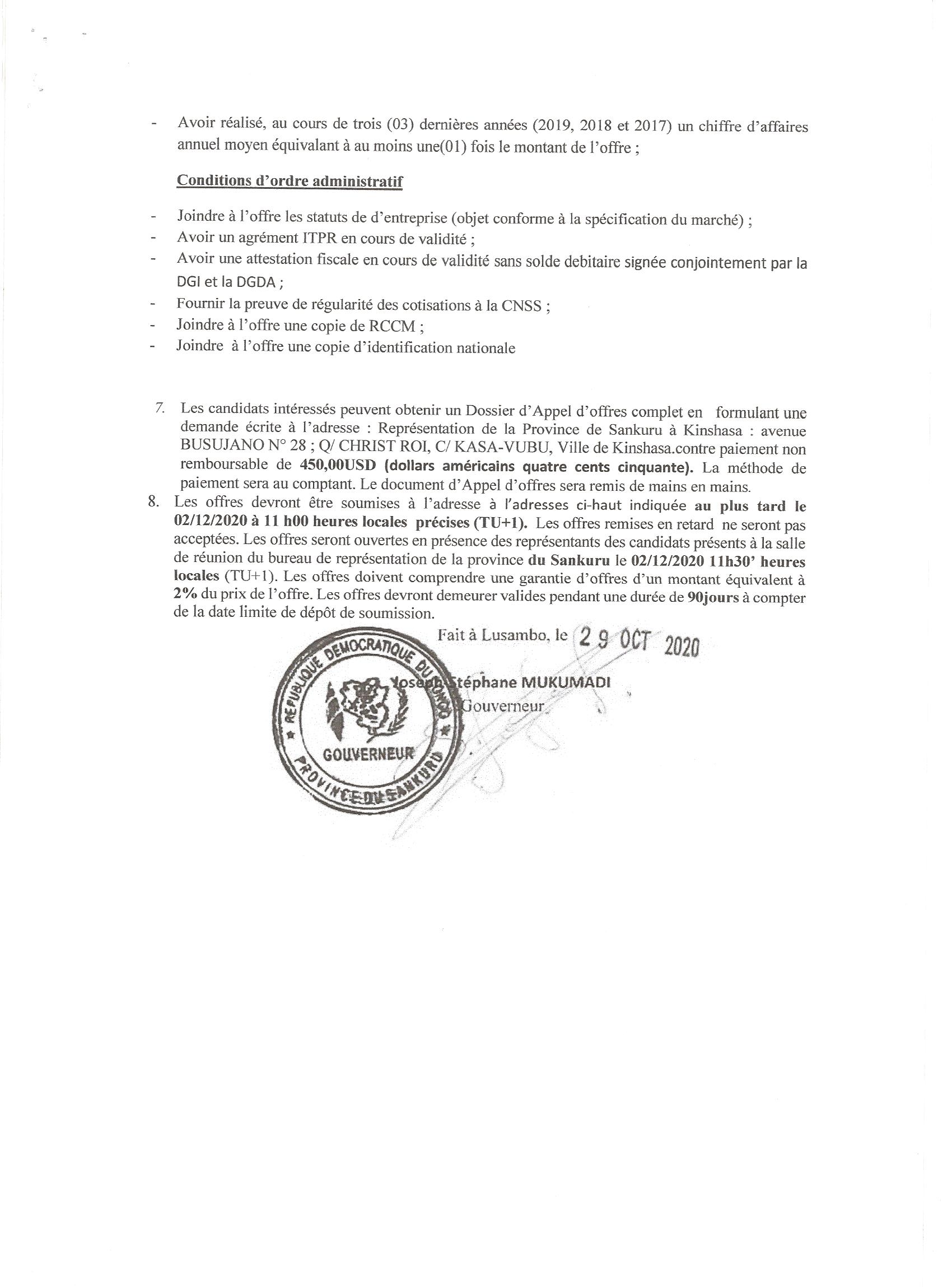 AVIS D’APPEL D’OFFRE SANS PRÉ-QUALIFICATION DU MARCHÉ RELATIF À LA CONSTRUCTION D’UNE RÉSIDENCE OFFICIELLE POUR LE GOUVERNEUR DE LA PROVINCE DU SANKURU.